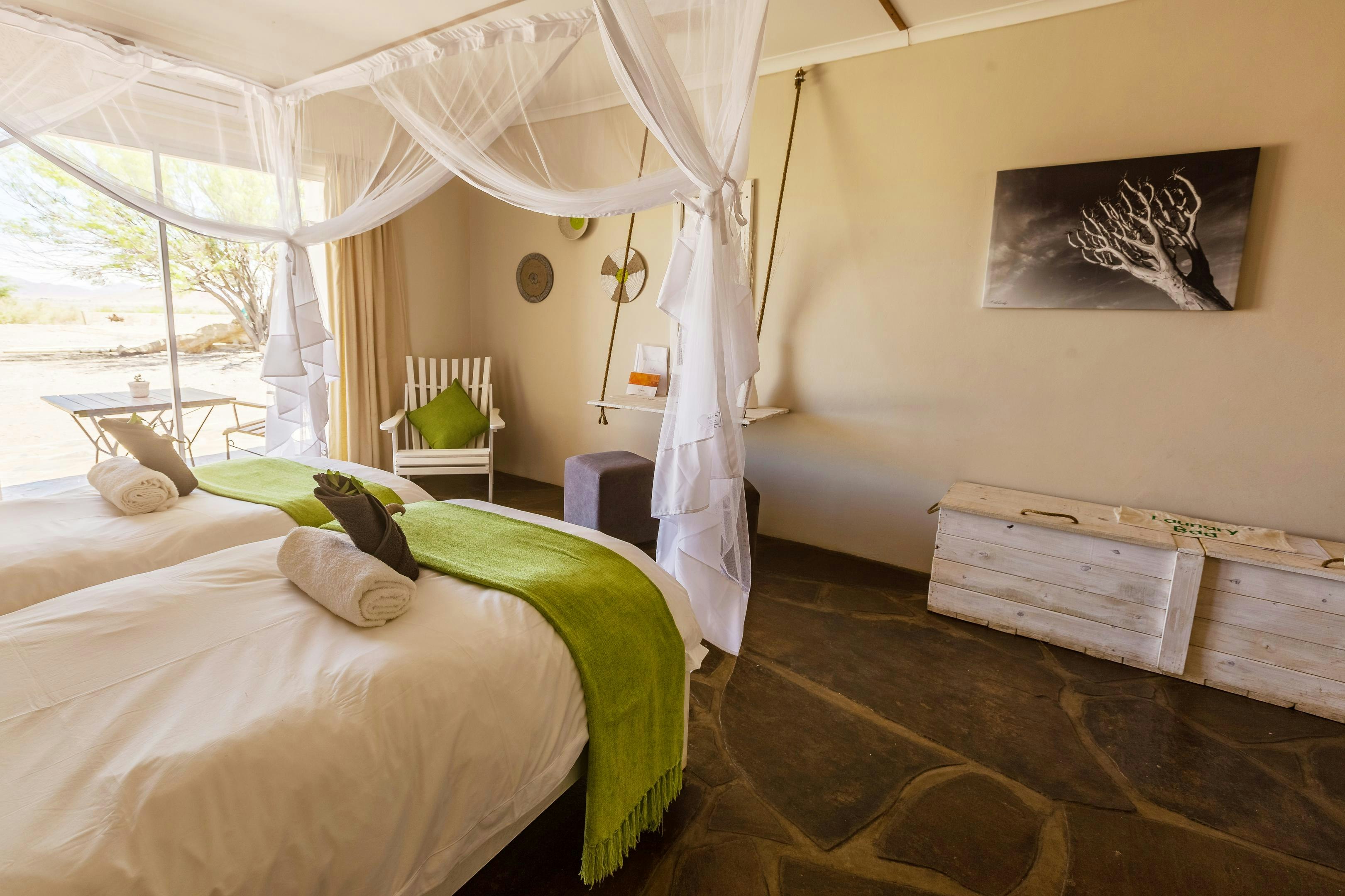 The lodge offers accommodation in 27 tastefully furnished, stylish and modern twin rooms. Each room is air-conditioned and contains an en-suite bathroom, a built-in safe, and a tea and coffee station. The tasteful and comfortable rooms invite you to recline in the soulful yet liberating atmosphere of the world’s oldest desert.