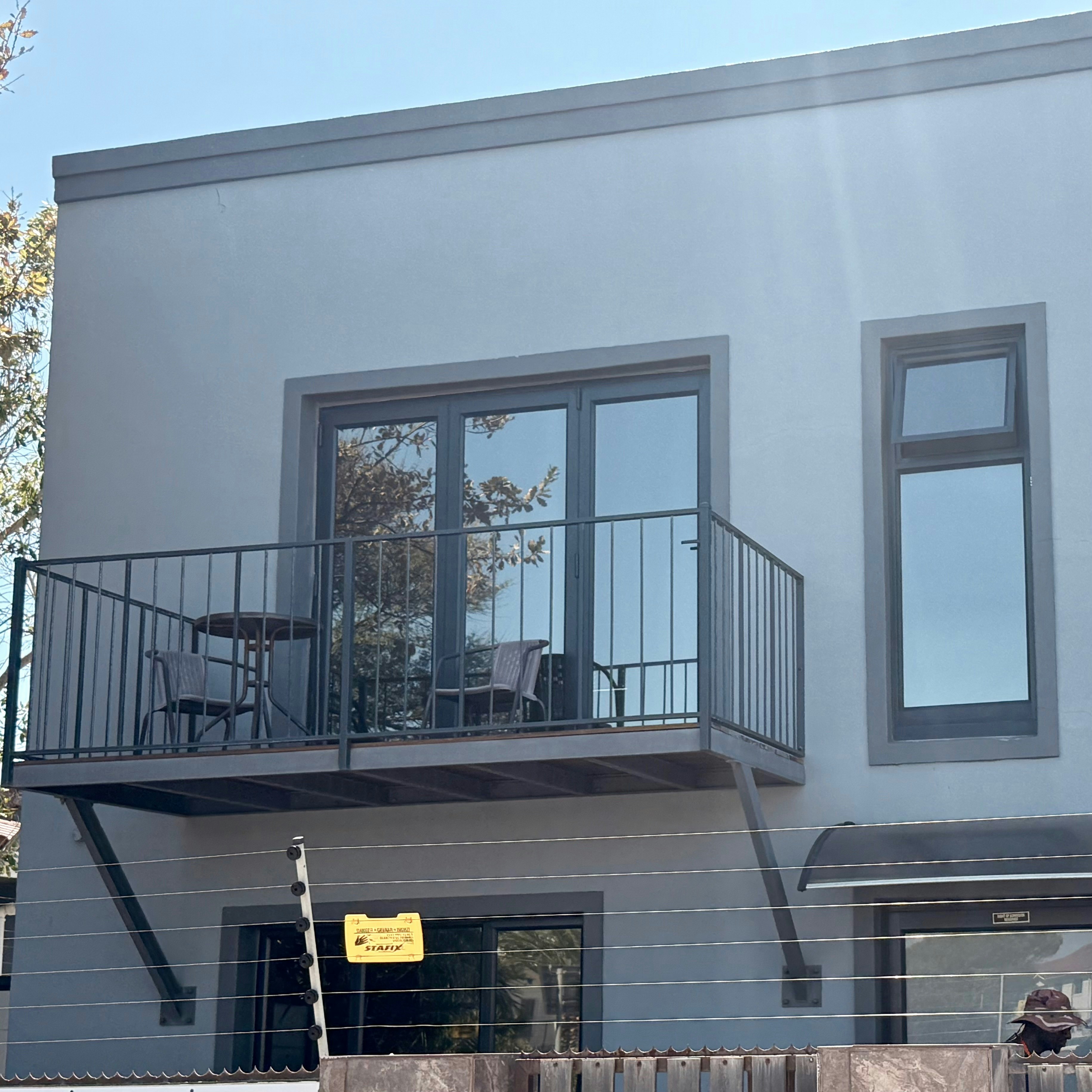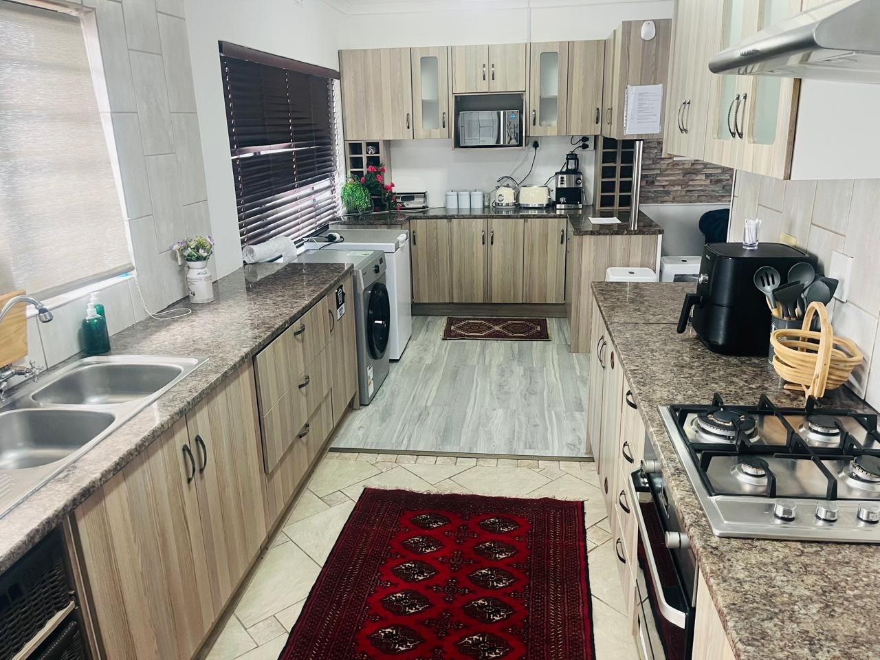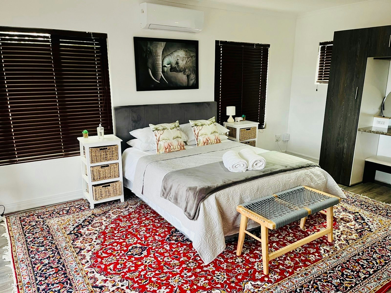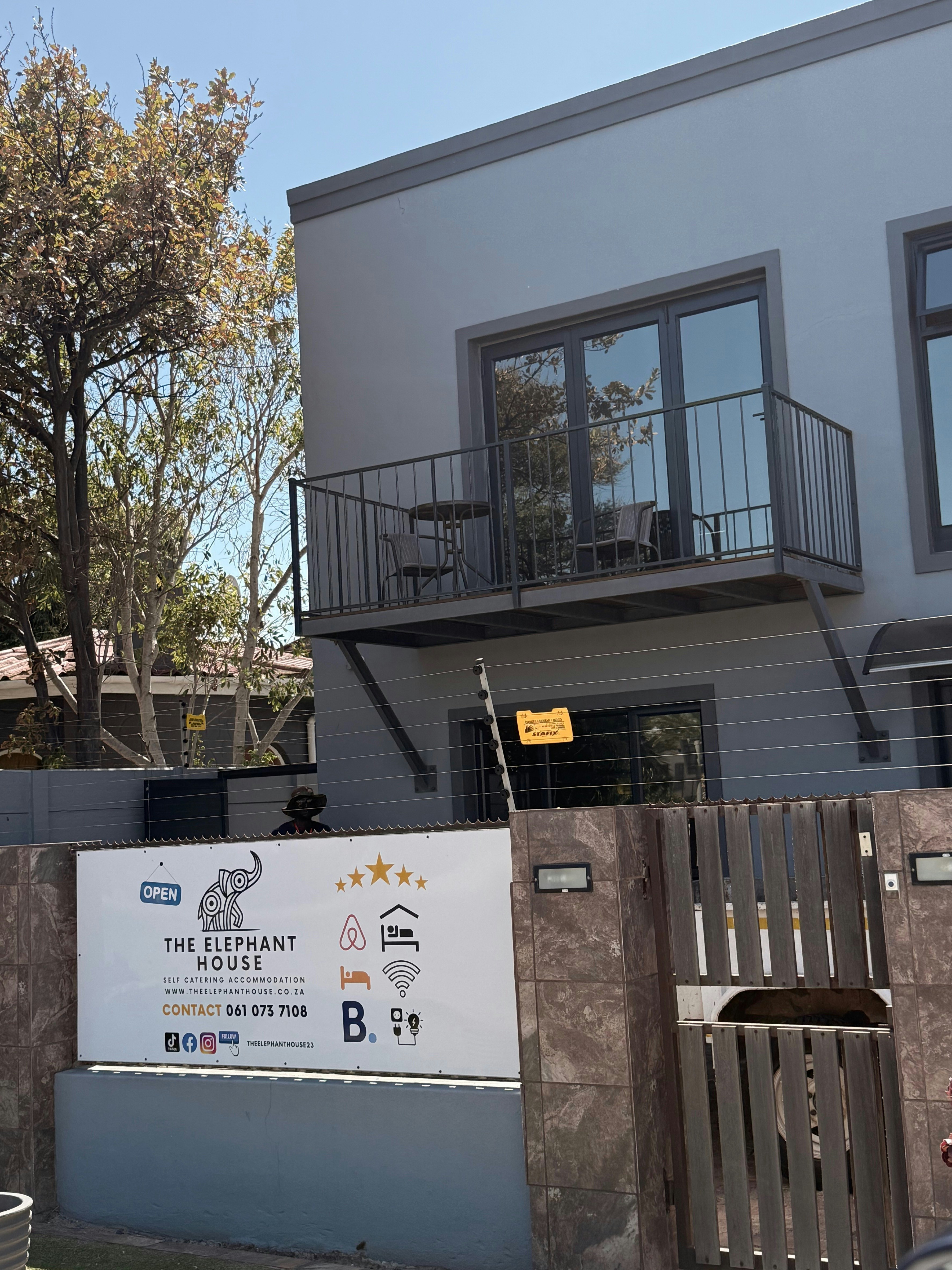 Elephant House features 3 bedrooms upstairs. The main bedroom is furnished with a queen-size bed and workspace, while the second and third bedrooms each contain 2 single beds that can be converted into queen-size beds. A shared bathroom includes a bath, shower, toilet, and double basin. A washer-dryer combo is available in the upstairs laundry area. Downstairs, the fully equipped kitchen includes a gas stove, oven, bar fridge, microwave, cutlery, and crockery. The lounge offers a comfortable U-shaped sofa and a Smart TV with access to Netflix and YouTube (guest login required). Outside, guests can enjoy a seating area with a braai (barbecue) and an umbrella.