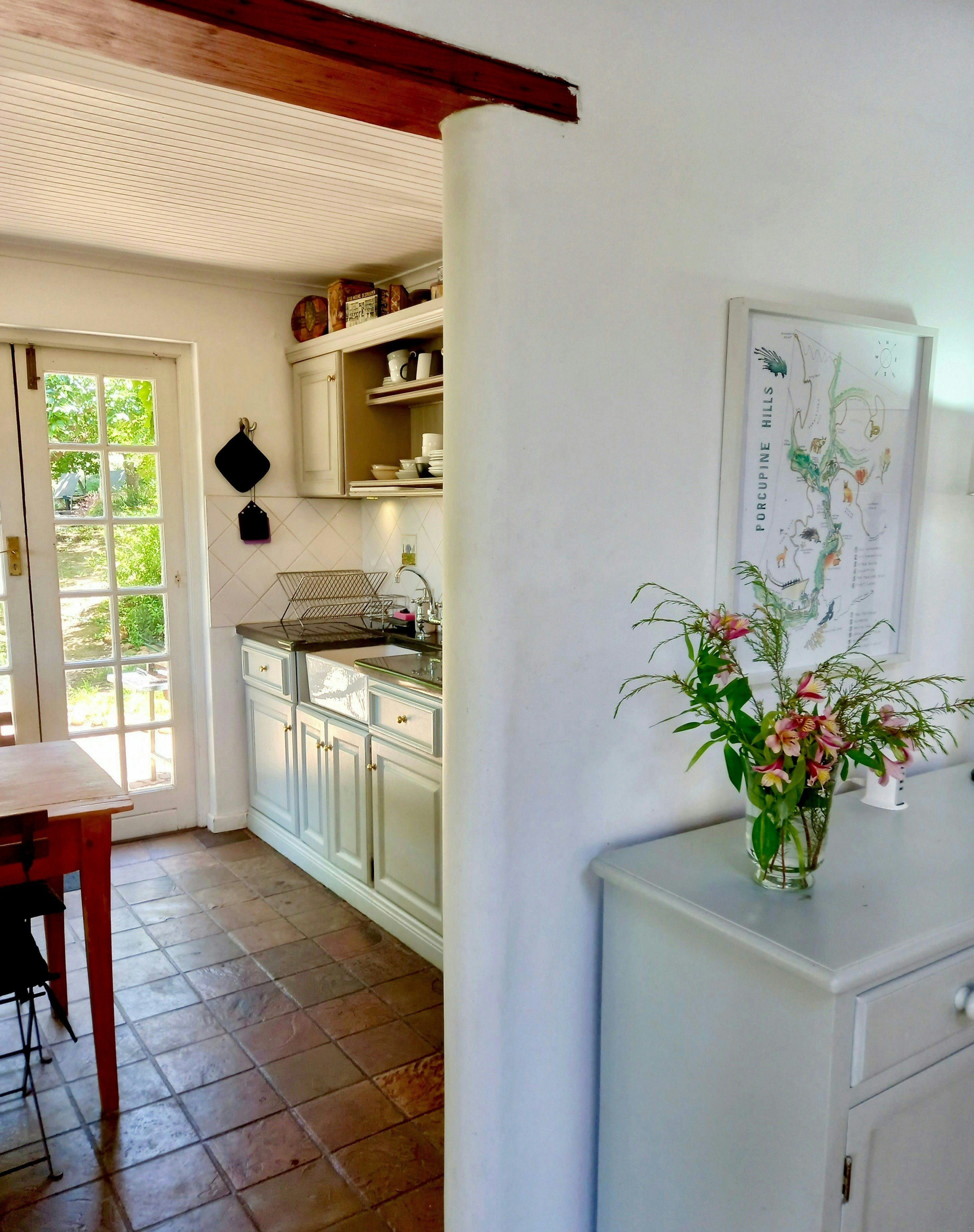 Die oopplan-kombuis is met 'n yskas-vrieskas, stoof, oond, mikrogolf, basiese eetgerei, breekware en tee- en koffiemaakgeriewe toegerus. Daar is ook 'n etenstafel. Die sitarea langsaan het gemaklike rusbanke en 'n kaggel.
