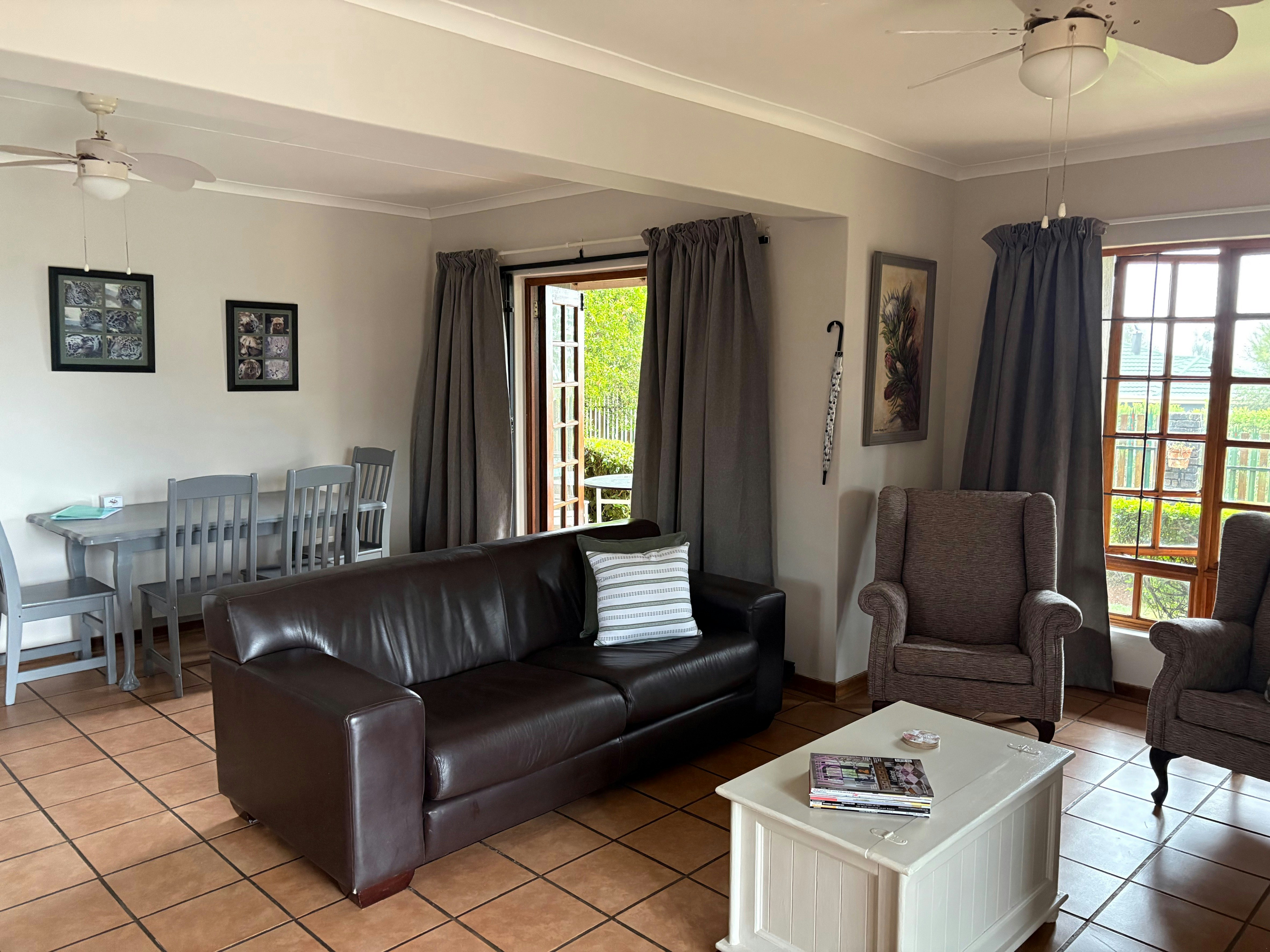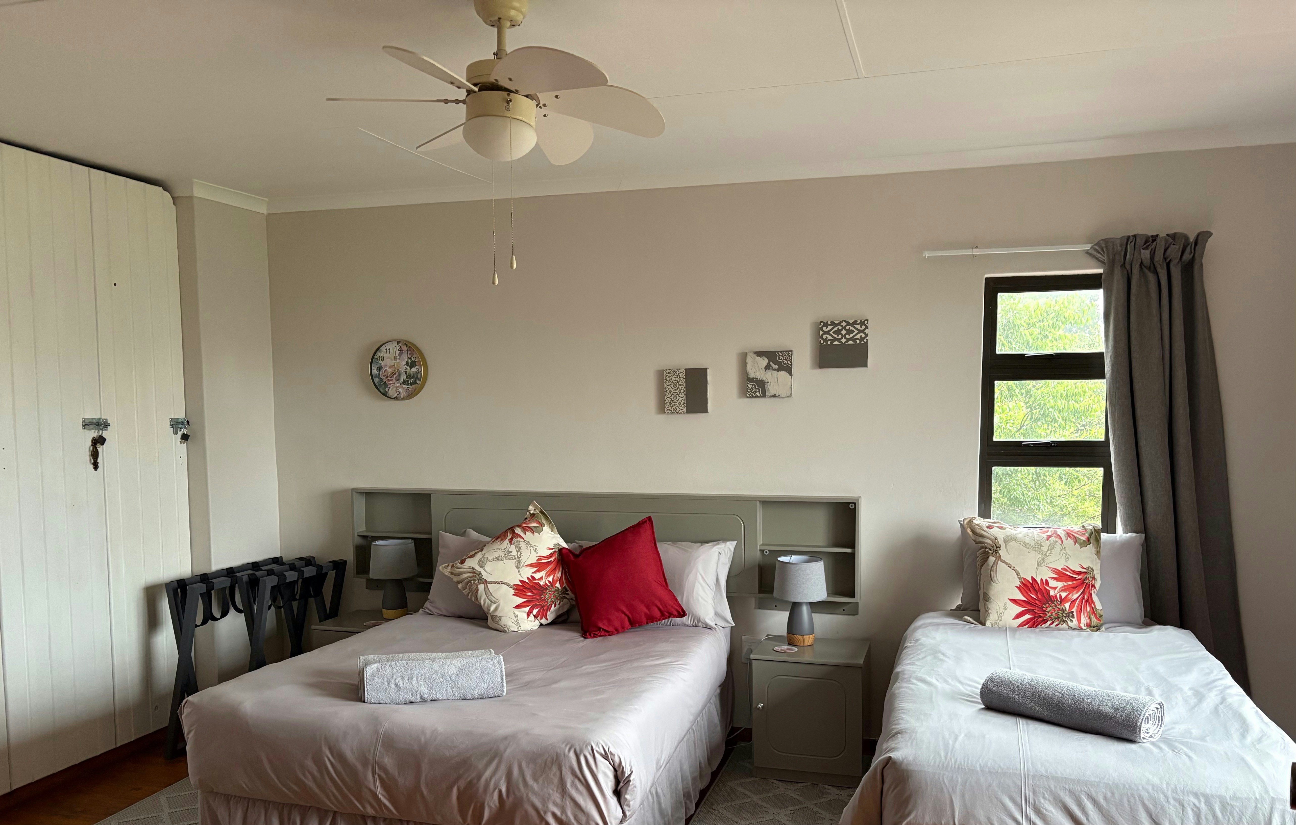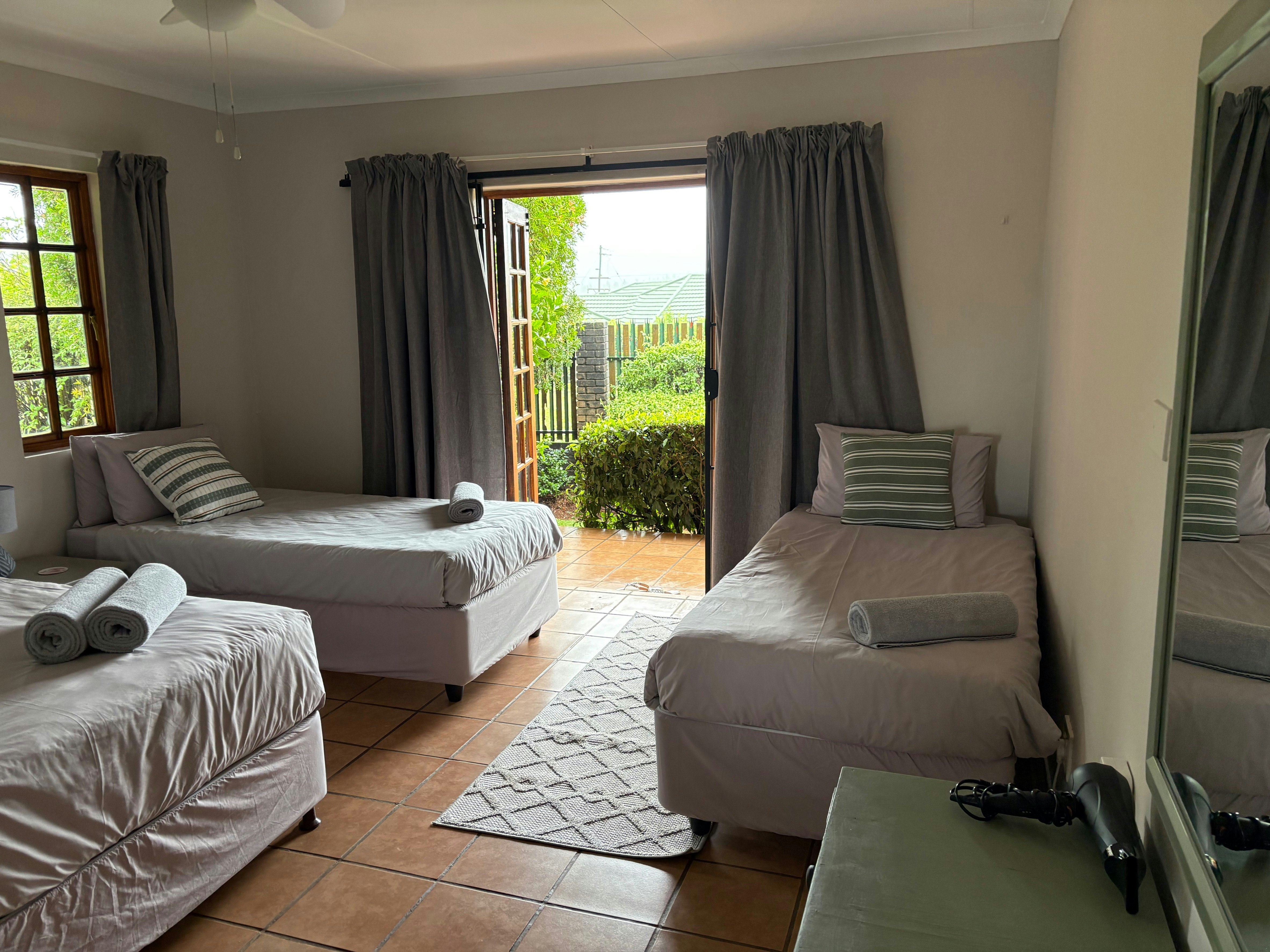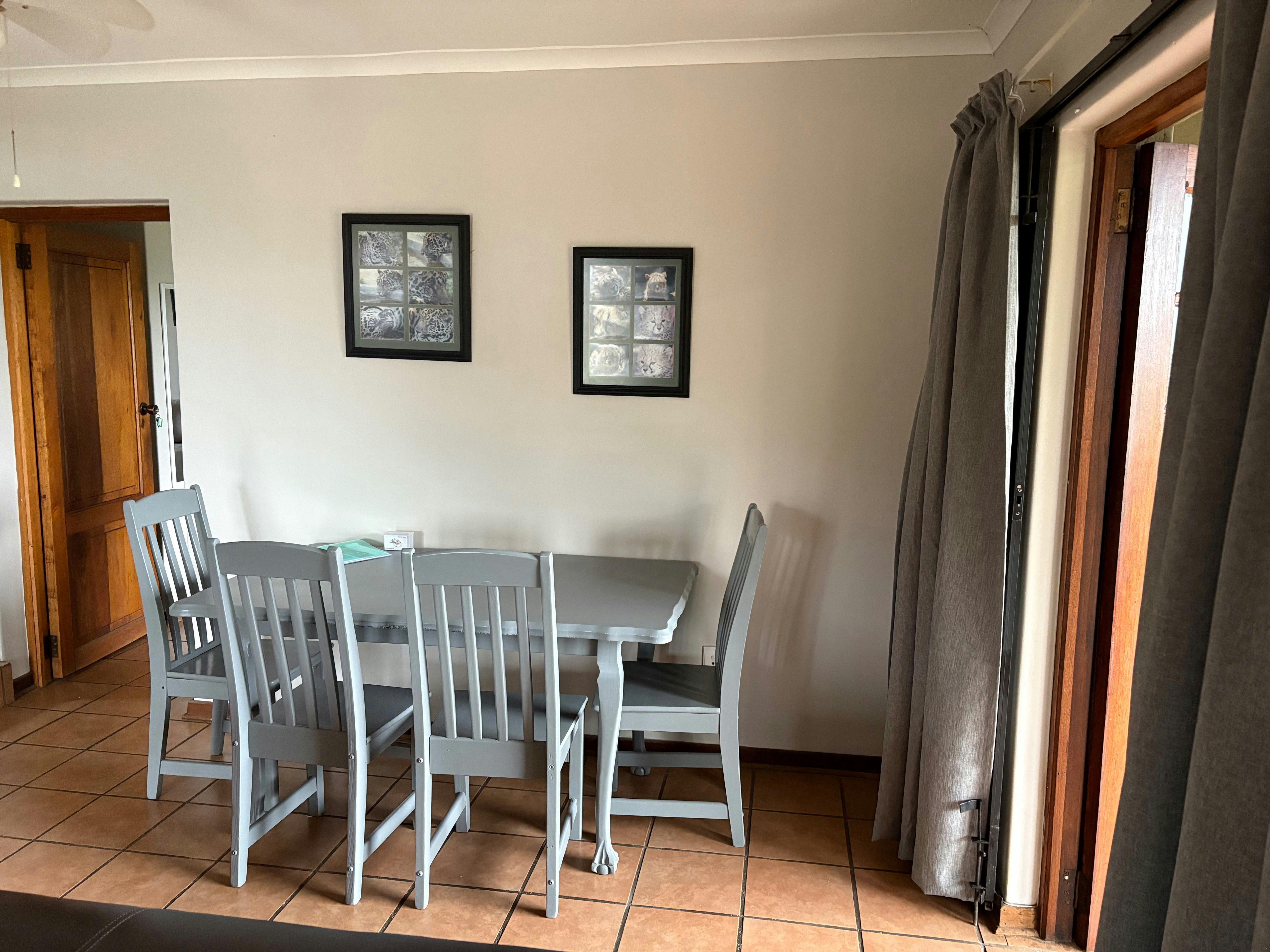 Emerald is a comfortable ground-floor apartment with a private entrance. It accommodates 4 guests and has a king-size bed and 2 single beds. The en-suite bathroom is fitted with a shower, toilet, and basin. The bedroom has direct access to the patio. The open-plan living area features a kitchen with a separate scullery, fully equipped with a fridge-freezer, stove, oven, microwave, kettle, toaster, and dining table with seating for 6 guests. The lounge area includes comfortable seating, a smart TV and books. The living area leads to a covered patio with a private braai and an outdoor dining area.