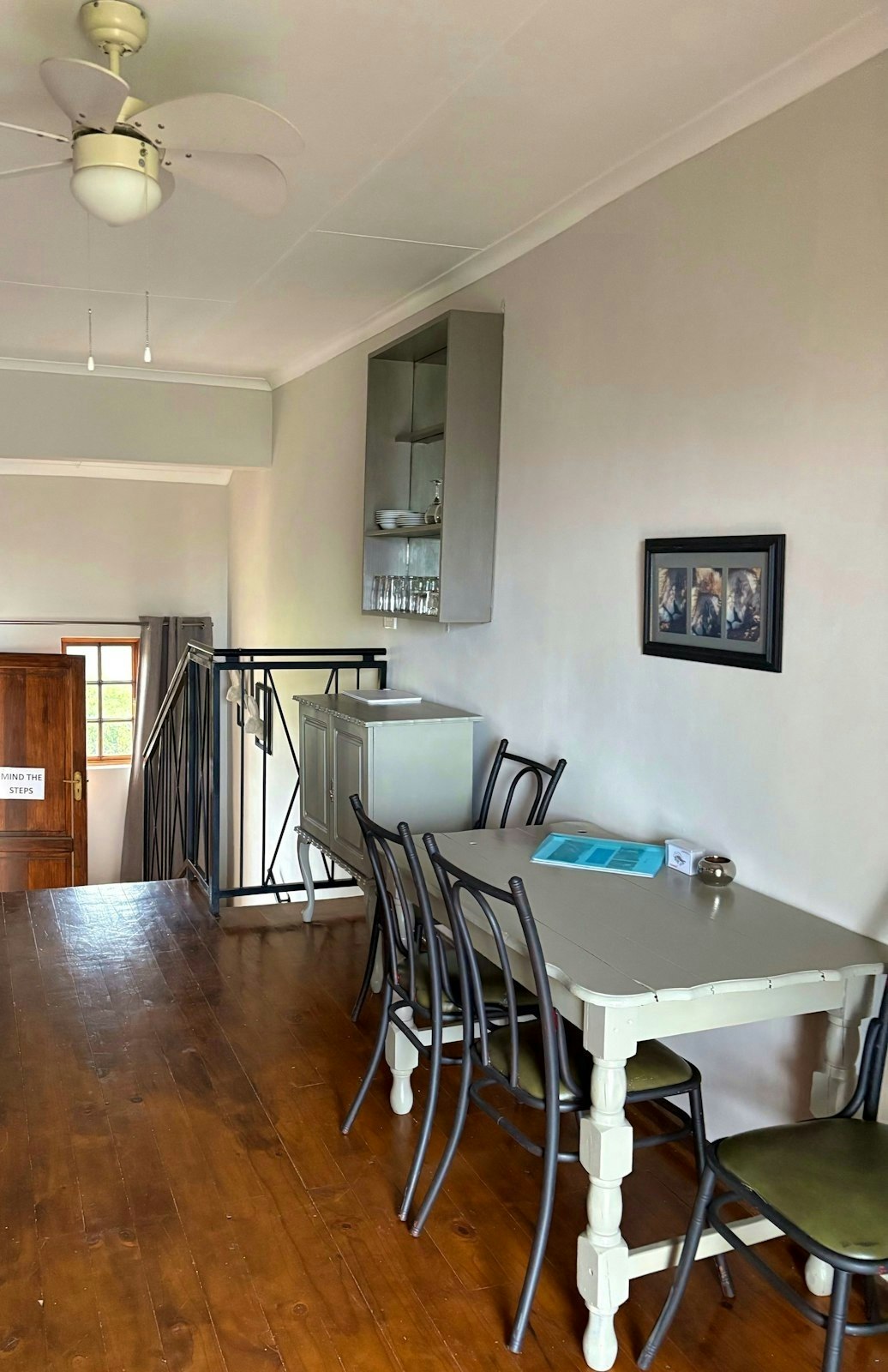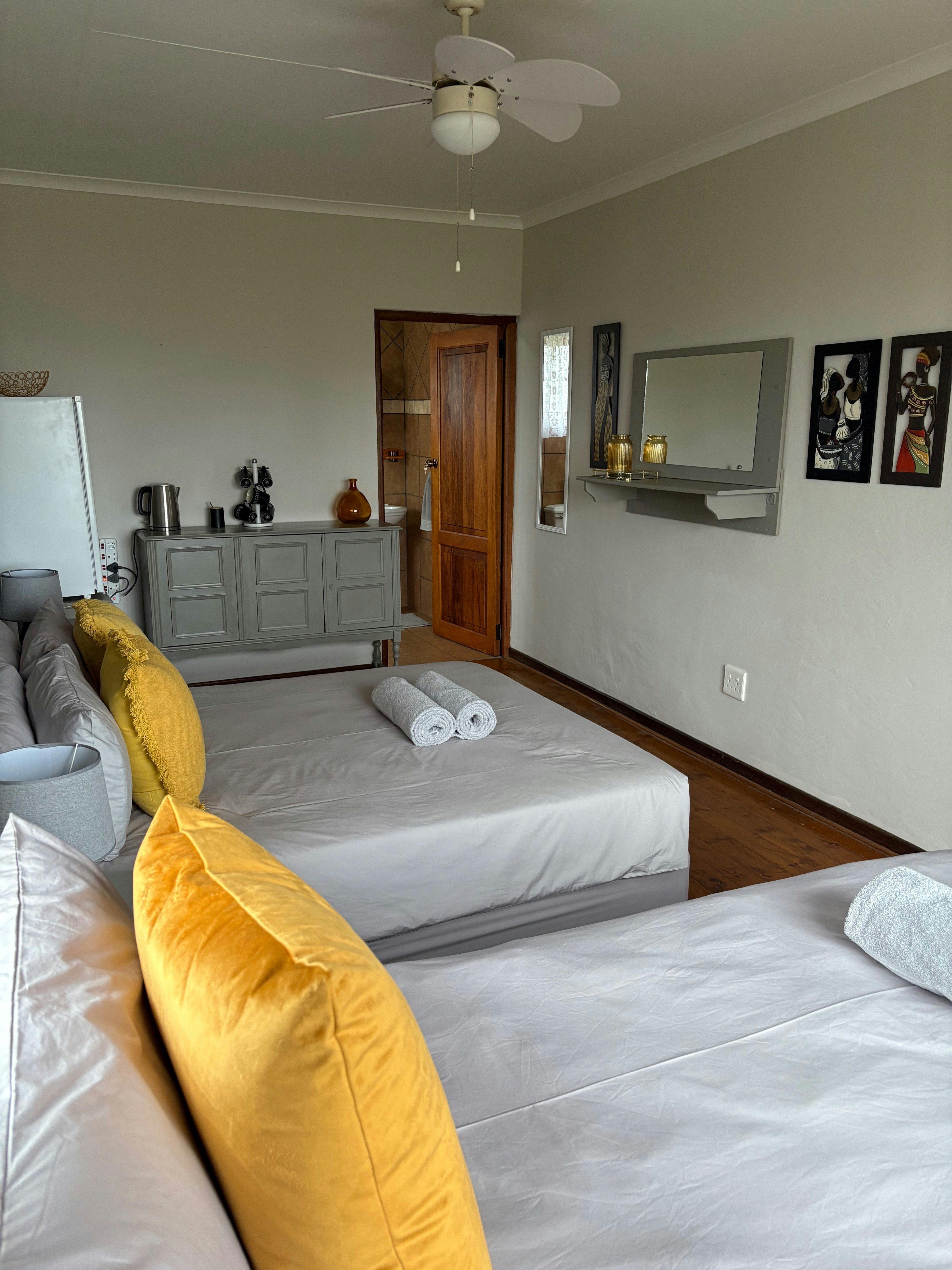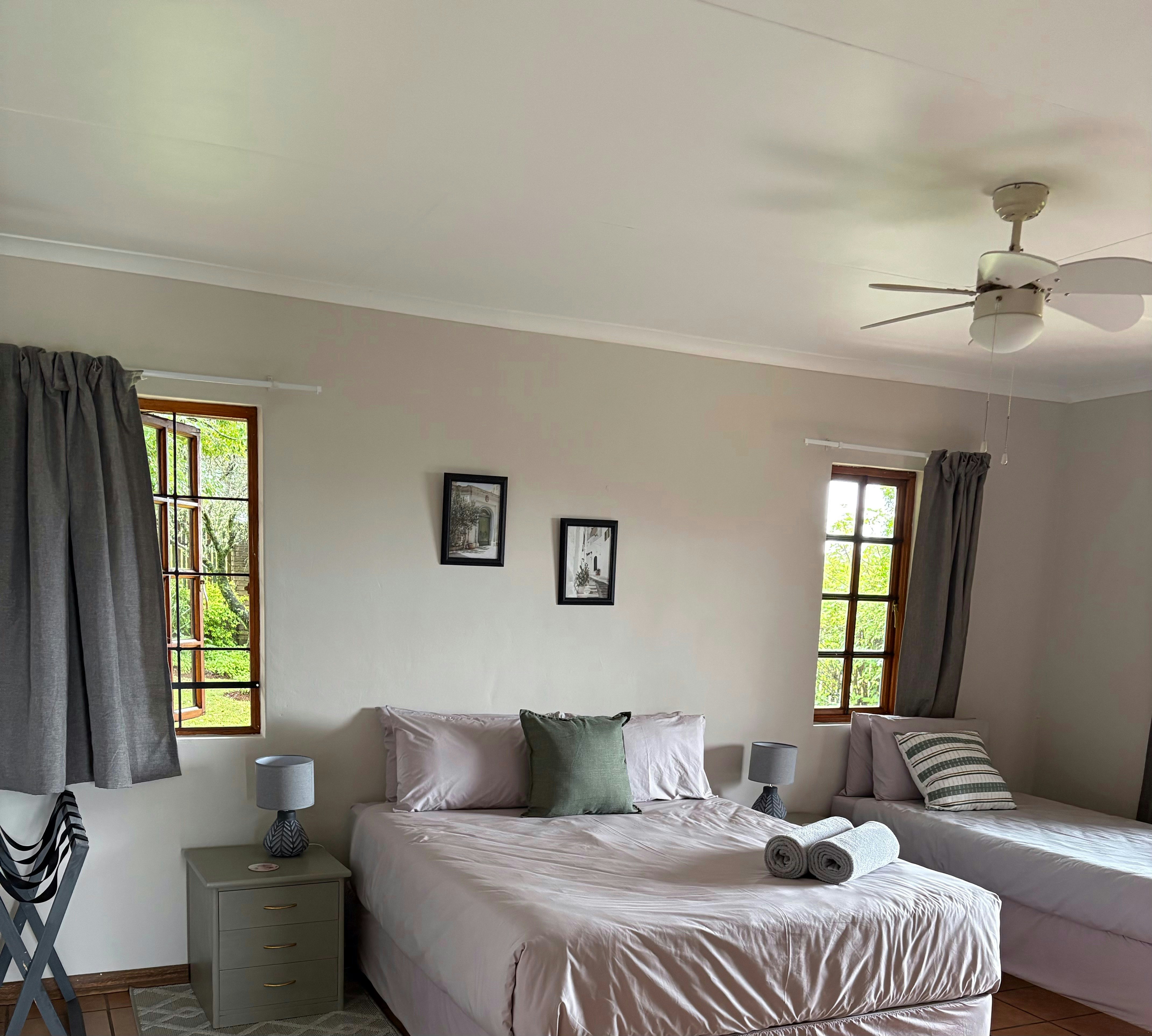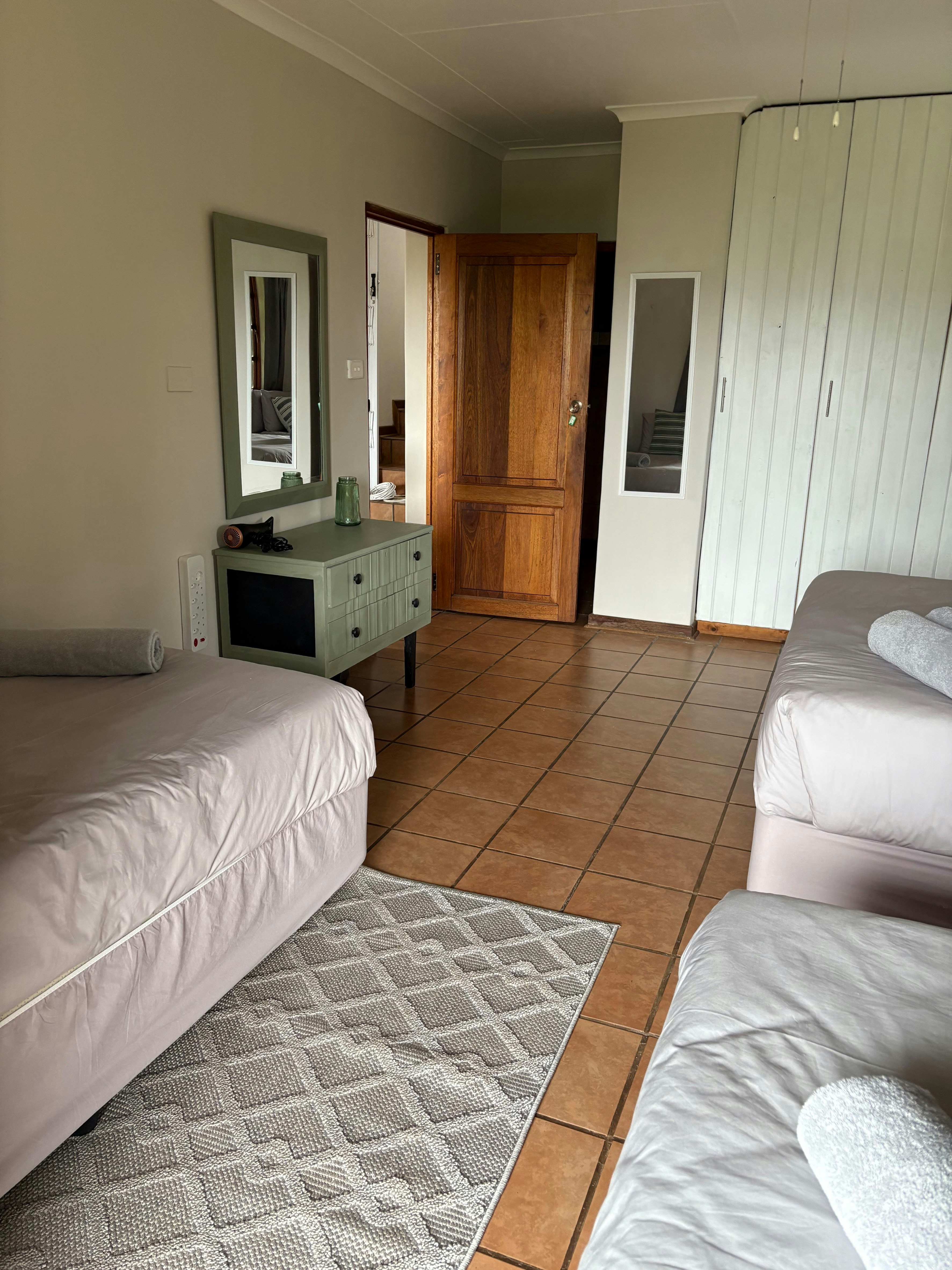 Emerald is a comfortable ground-floor apartment with a private entrance. It accommodates 4 guests and has a king-size bed and 2 single beds. The en-suite bathroom is fitted with a shower, toilet, and basin. The bedroom has direct access to the patio. The open-plan living area features a kitchen with a separate scullery, fully equipped with a fridge-freezer, stove, oven, microwave, kettle, toaster, and dining table with seating for 6 guests. The lounge area includes comfortable seating, a smart TV and books. The living area leads to a covered patio with a private braai and an outdoor dining area.