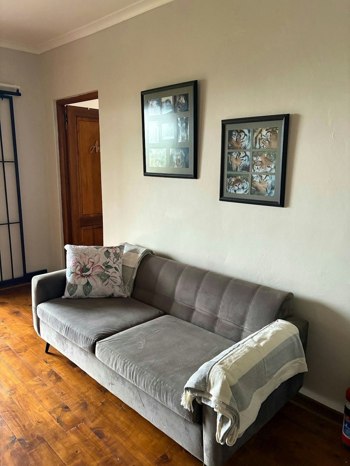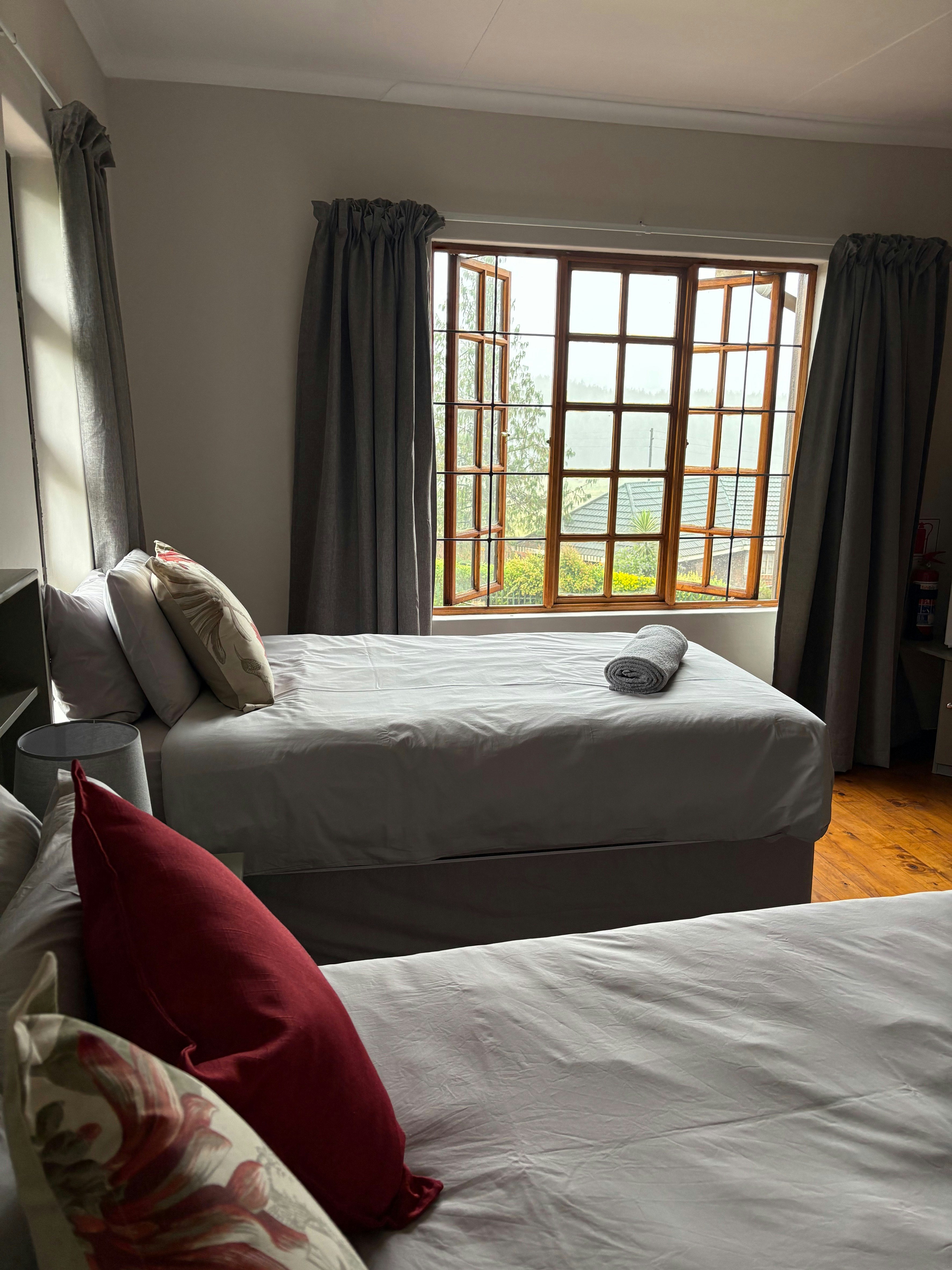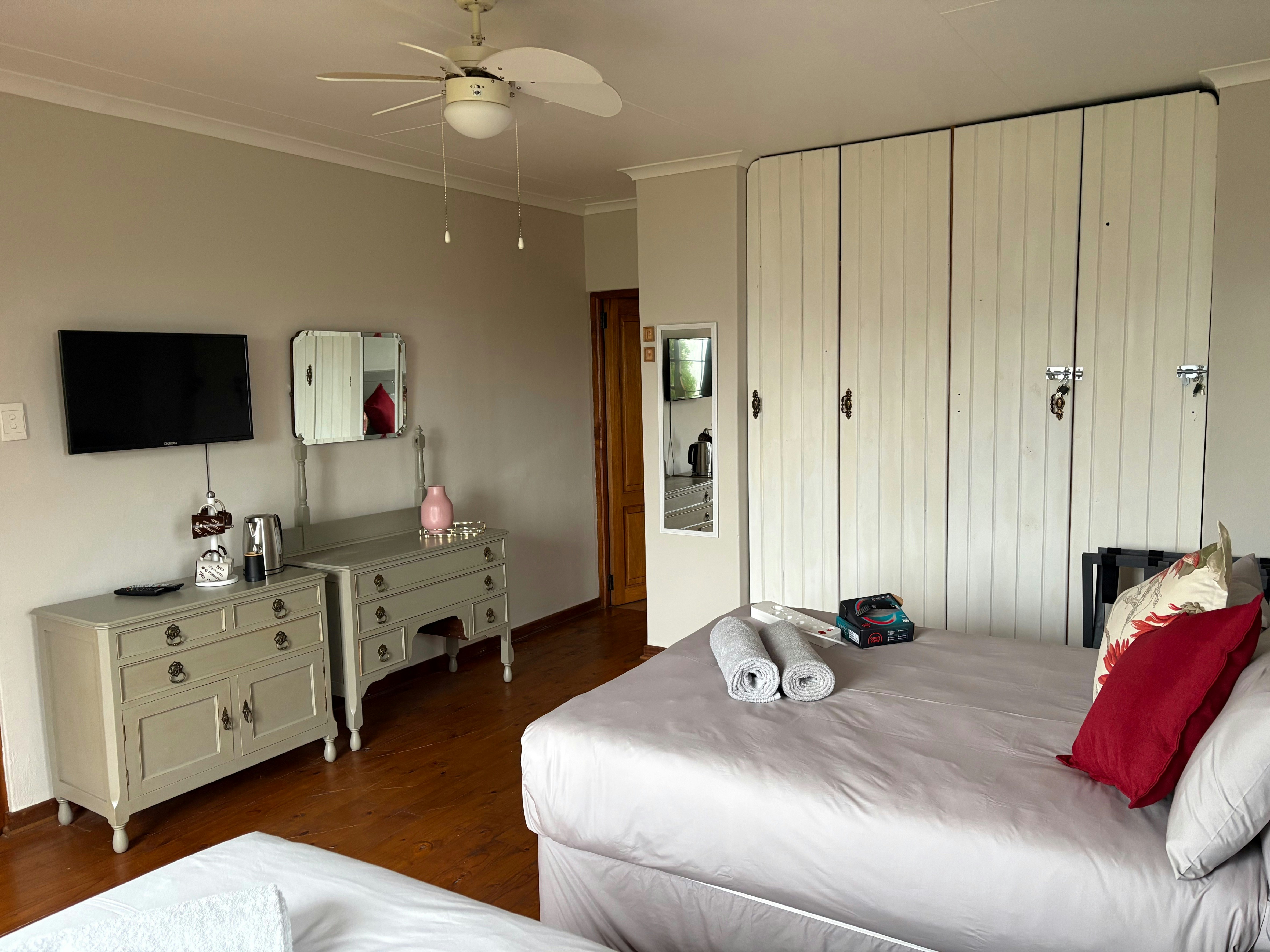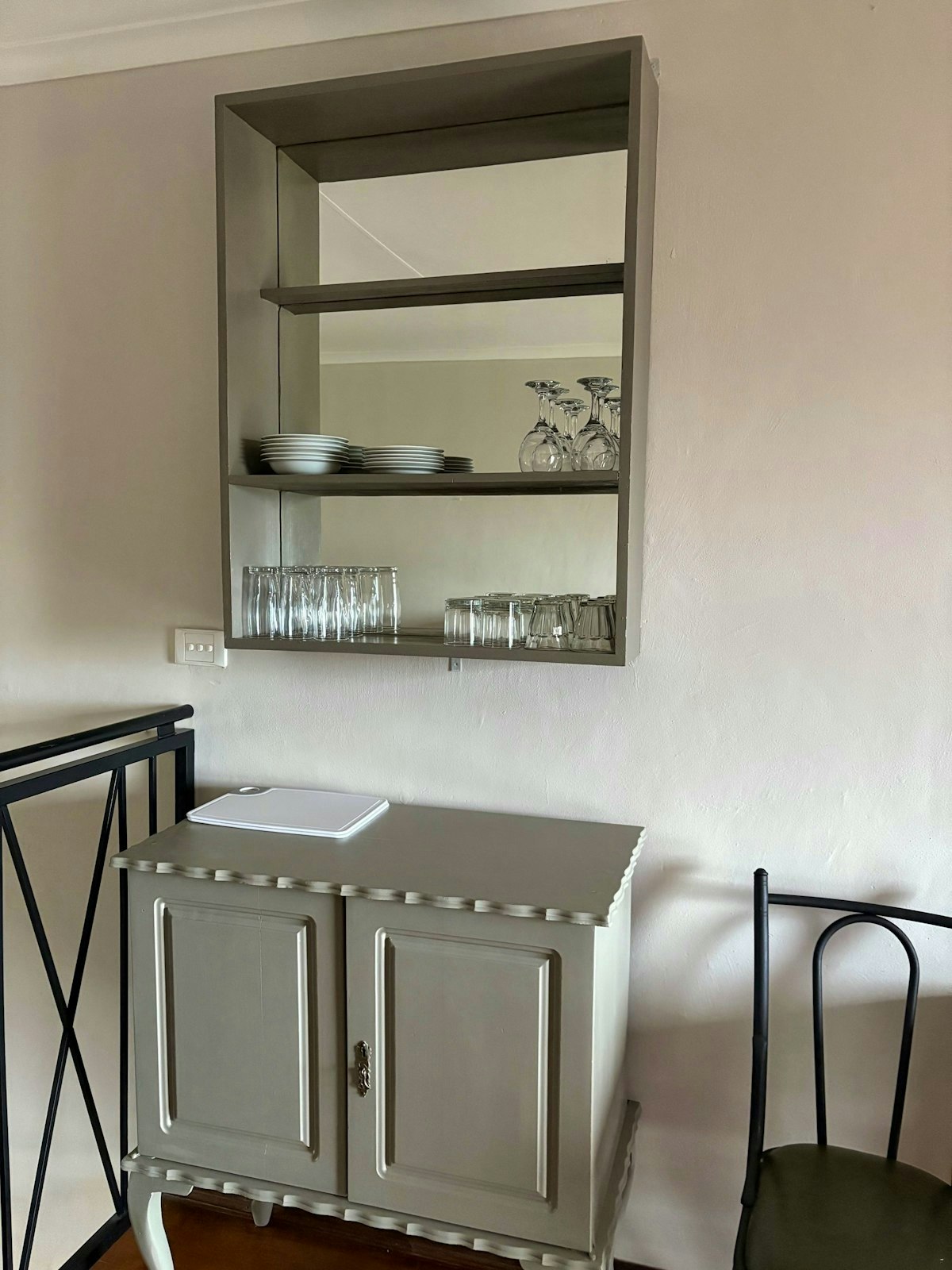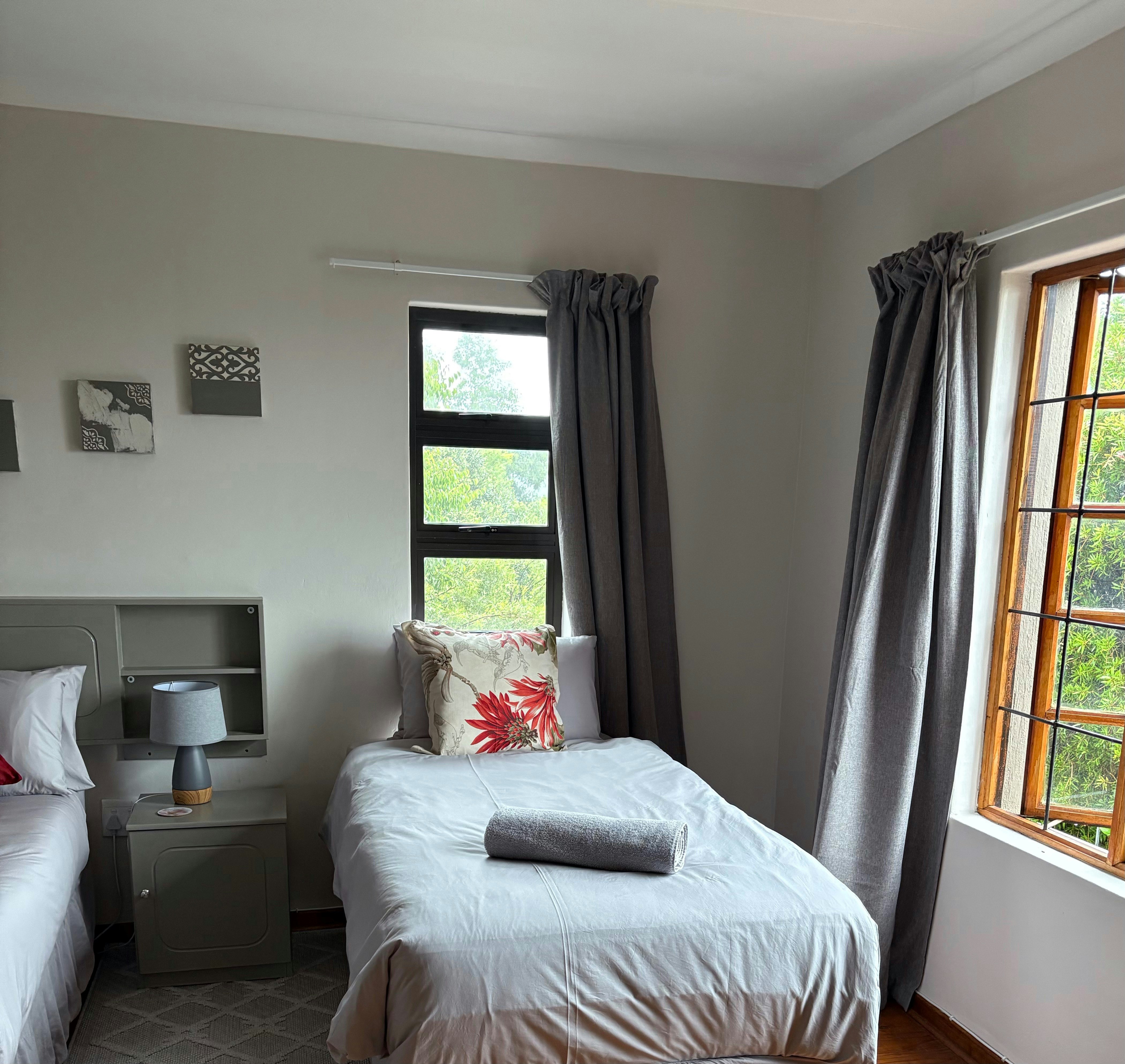 Emerald is a comfortable ground-floor apartment with a private entrance. It accommodates 4 guests and has a king-size bed and 2 single beds. The en-suite bathroom is fitted with a shower, toilet, and basin. The bedroom has direct access to the patio. The open-plan living area features a kitchen with a separate scullery, fully equipped with a fridge-freezer, stove, oven, microwave, kettle, toaster, and dining table with seating for 6 guests. The lounge area includes comfortable seating, a smart TV and books. The living area leads to a covered patio with a private braai and an outdoor dining area.