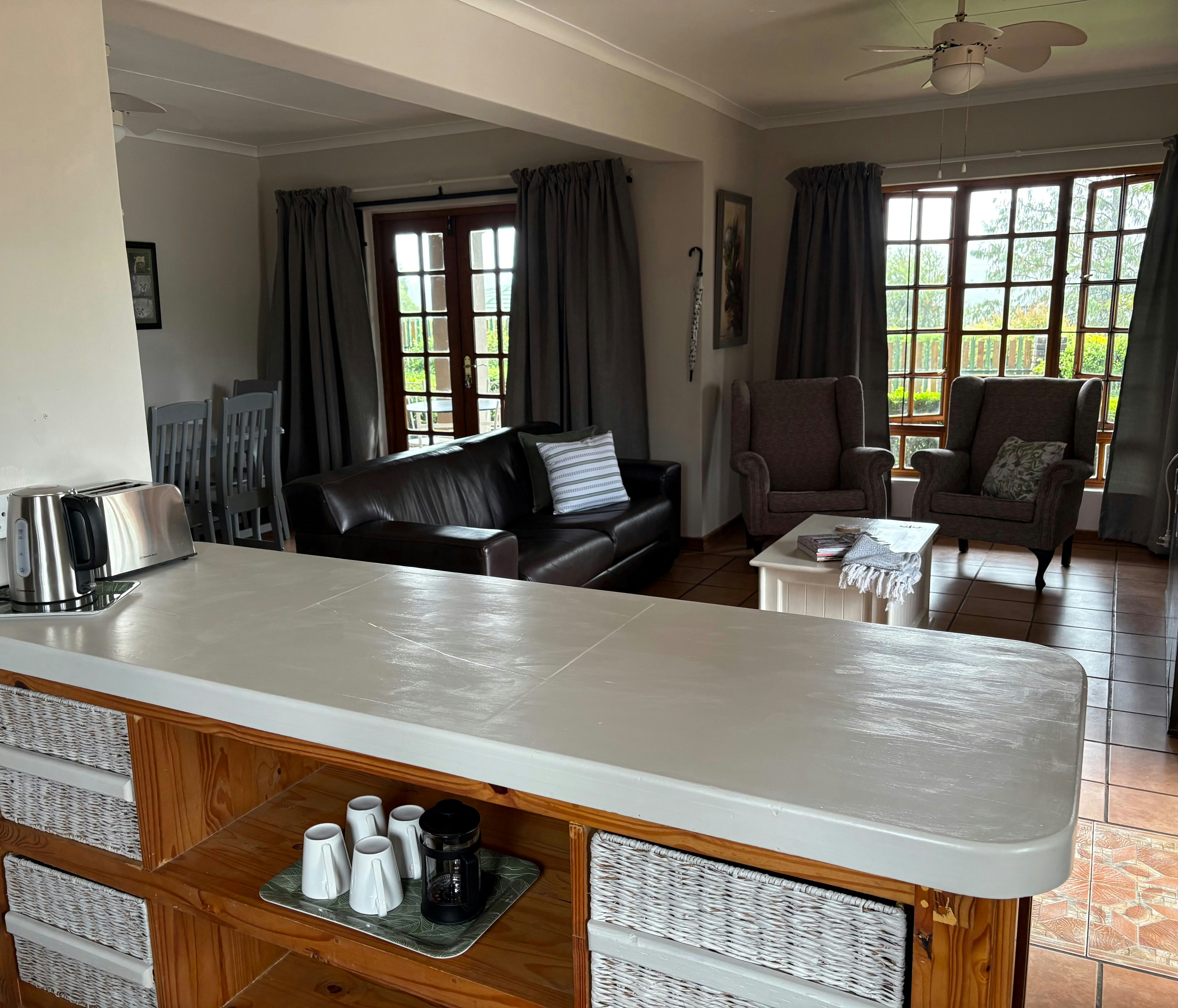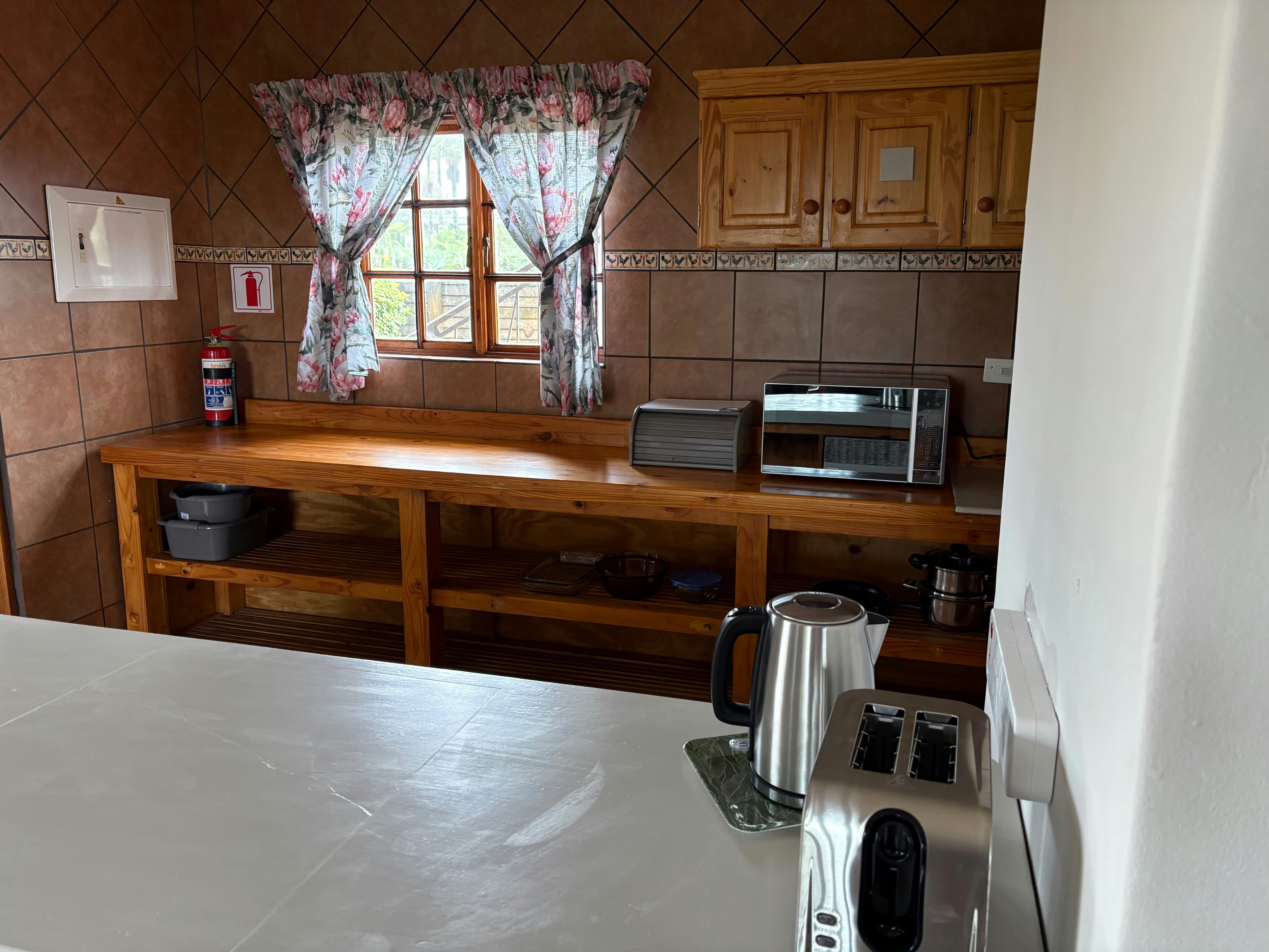 Guests staying in Amber and Ruby share access to a communal living area, kitchenette, and balcony with outdoor seating. The kitchenette is equipped with an air fryer, microwave, toaster, crockery, and cutlery, while each unit includes its own fridge and kettle. These units do not include braai facilities.