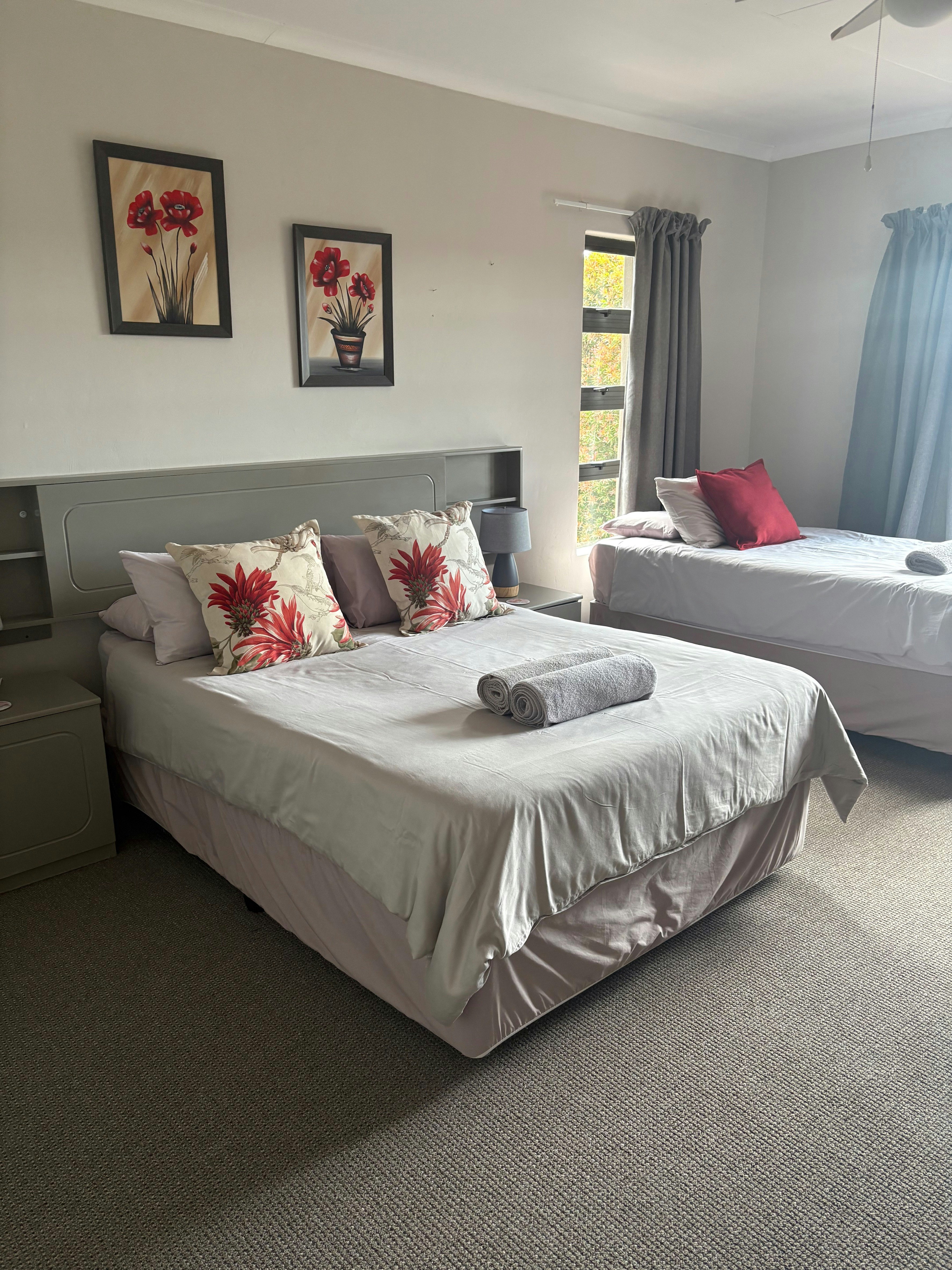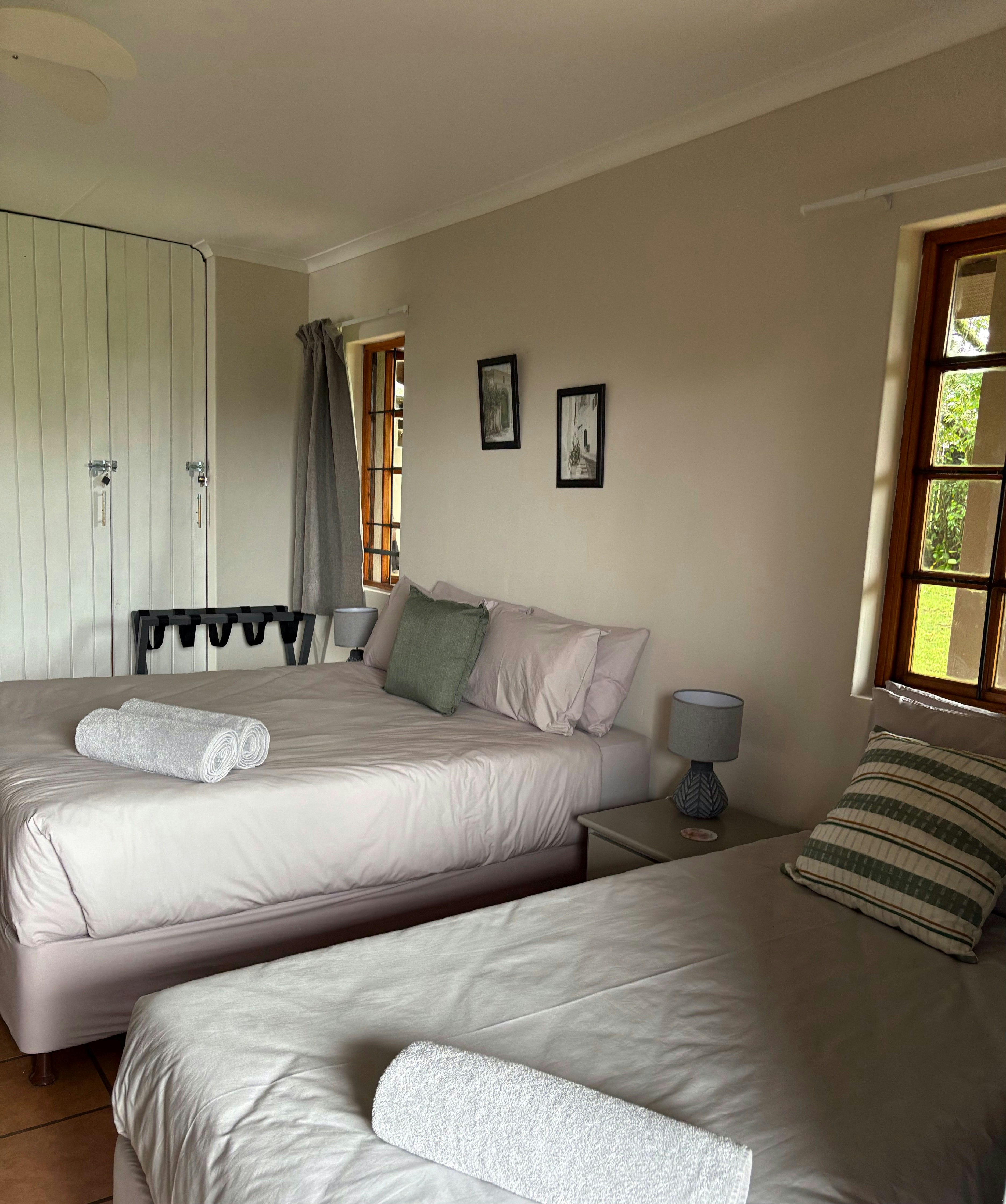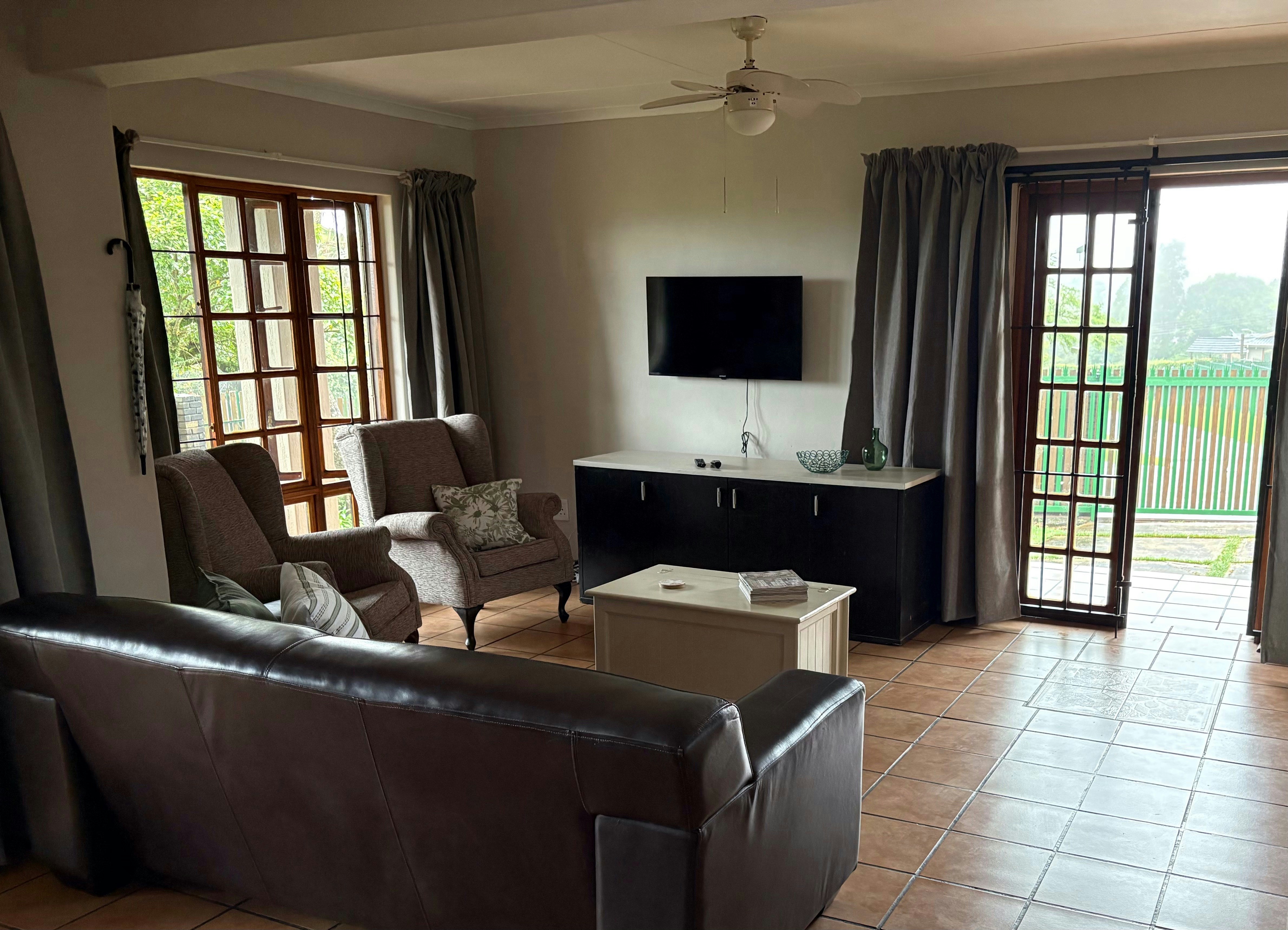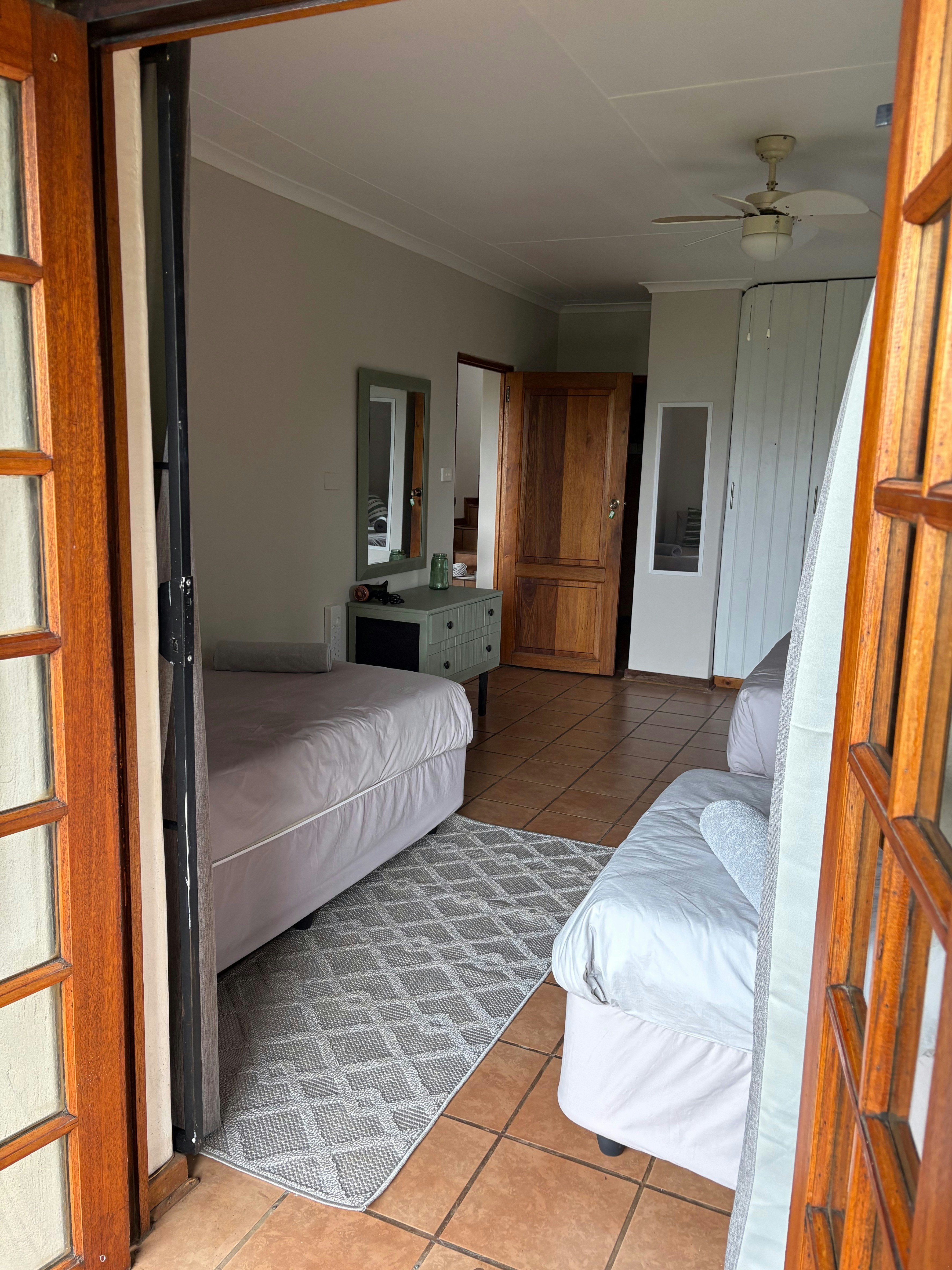 Emerald is located on the ground floor and comprises a spacious apartment with a private entrance. It can accommodate 4 guests and is furnished with a queen-size bed and 2 single beds, along with an en-suite bathroom fitted with a shower. The open-plan living area includes a fully equipped kitchen with a separate scullery, a dining table, and a lounge with a Smart TV. The unit opens onto a covered patio with private braai facilities and an outdoor dining area. Amber and Ruby are situated on the upper level, each accommodating up to 3 guests and furnished with either a king-size or queen-size bed, as well as a single bed. Both units feature en-suite bathrooms fitted with a bath, shower, toilet, and basin.