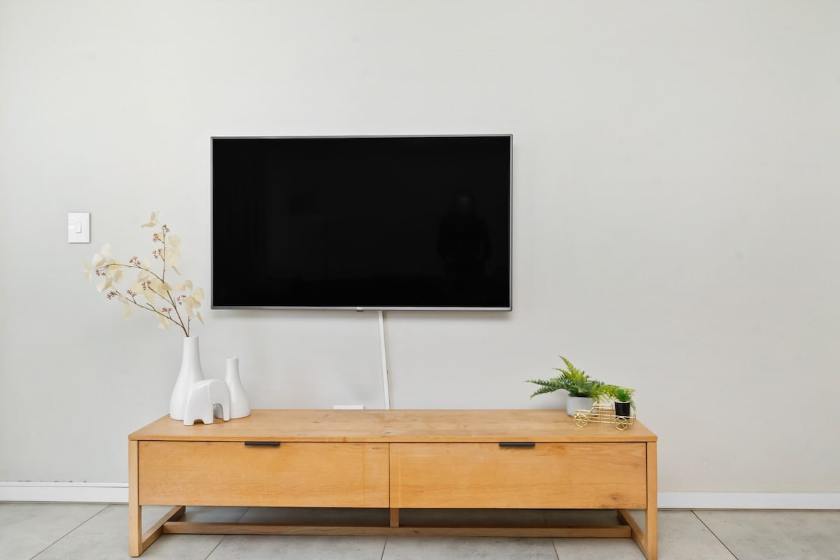 The living area features a kitchen fully equipped with a stove, oven, microwave, fridge-freezer, cutlery and crockery, as well as tea- and coffee-making facilities. A dishwasher is also available. Leading from the kitchen is a 4-seater dining table and the lounge with a comfortable L-shaped couch and a wall-mounted TV. Access to free Wi-Fi is provided.