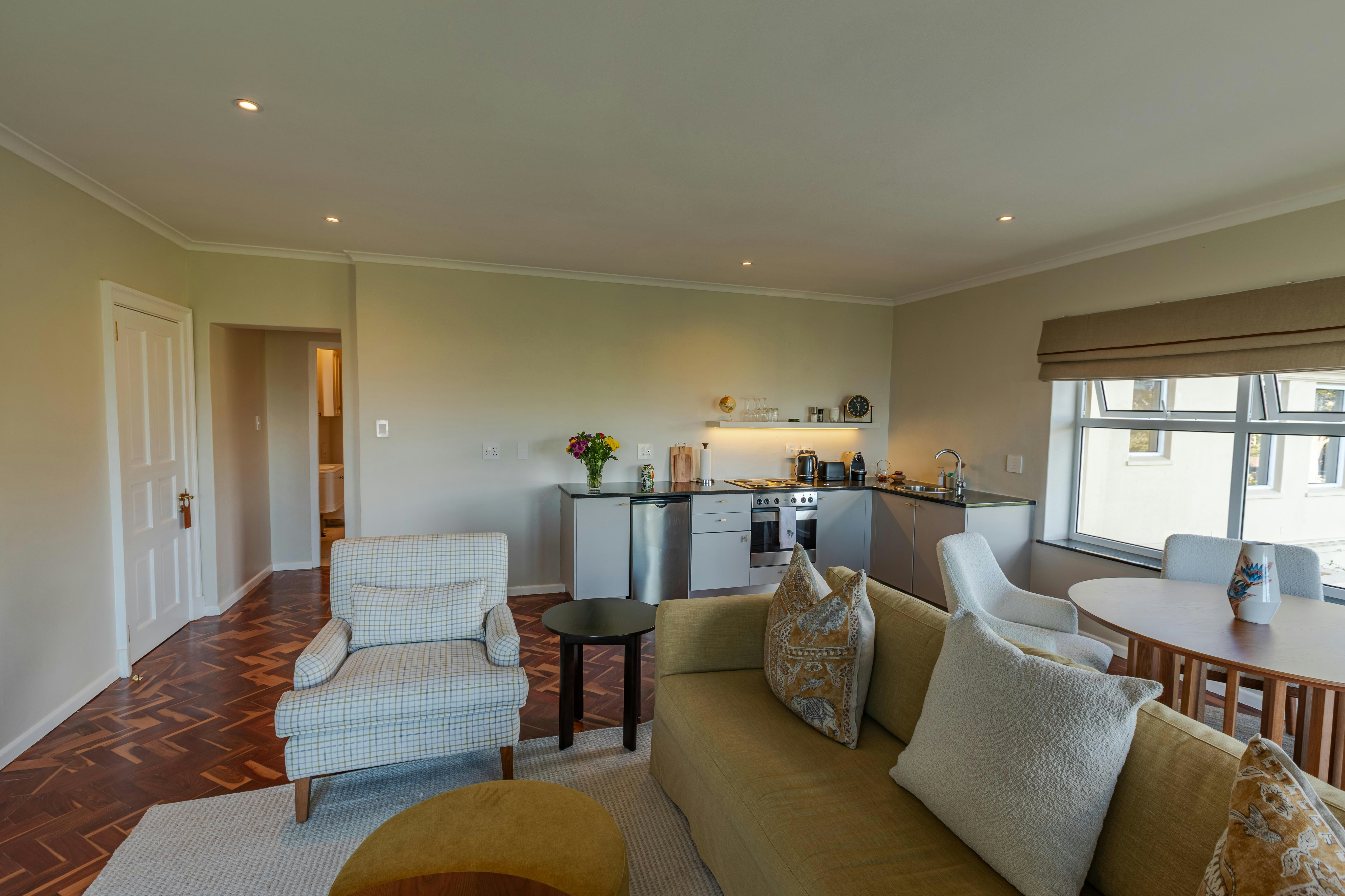 Accommodation is offered in a selection of well-appointed suites and studios, each thoughtfully furnished for comfort and convenience. The units feature king-size beds, private bathrooms fitted with showers, and air-conditioning. Selected units include separate bedrooms, open-plan living areas, and fireplaces, while others offer cozy studio-style layouts. Each unit is equipped with a kitchenette or fully equipped kitchen, allowing for self-catering, and includes a TV, comfortable seating, and tea- and coffee-making facilities.