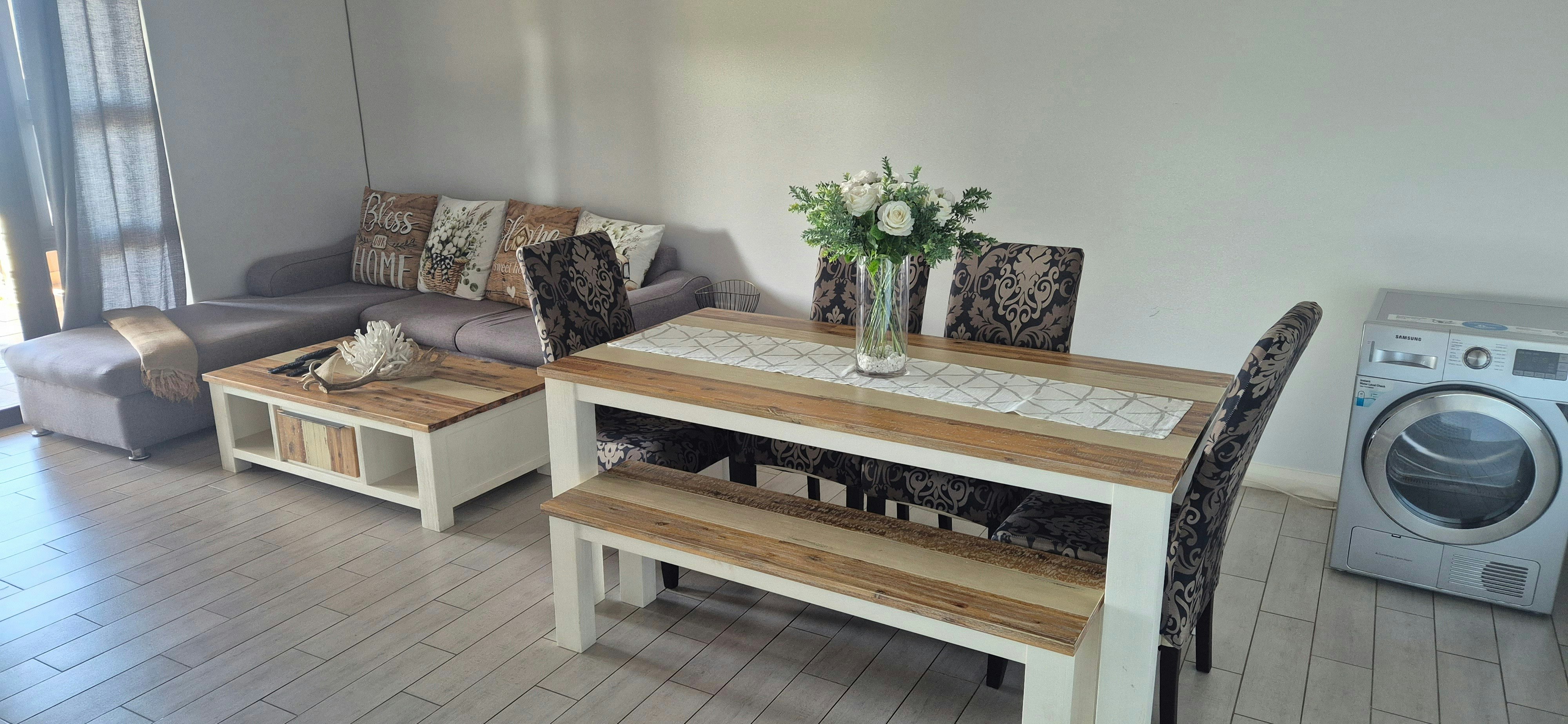 The open-plan living area features a TV with selected DStv channels, and leads out to a covered verandah, which boasts a gas braai facility for guests to use.