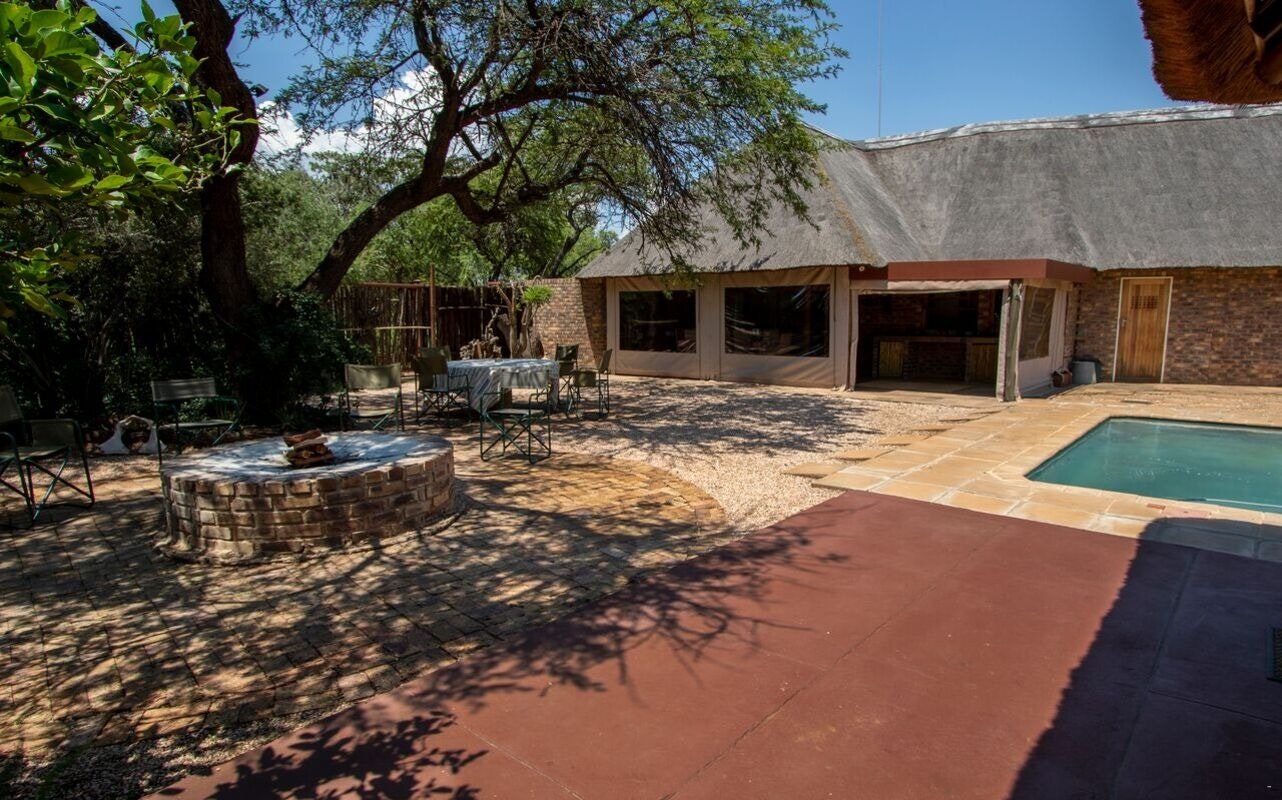 Outside, guests can enjoy additional seating—perfect for meals with loved ones. A private, separate boma features a bar area and braai facilities, overlooking the sparkling swimming pool.