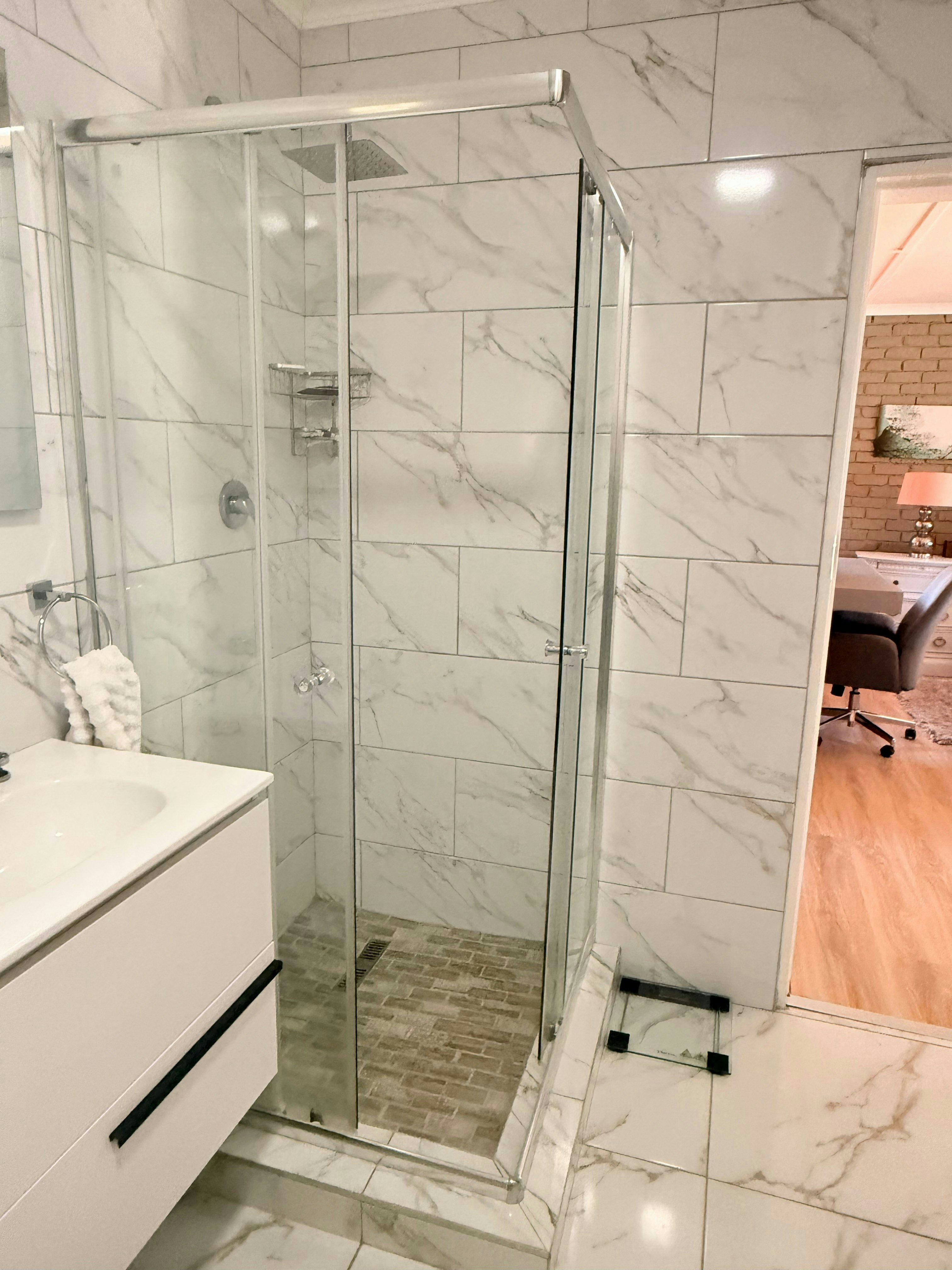 Unit 1 is furnished with a double bed and features an en-suite bathroom fitted with a shower, toilet, and basin.