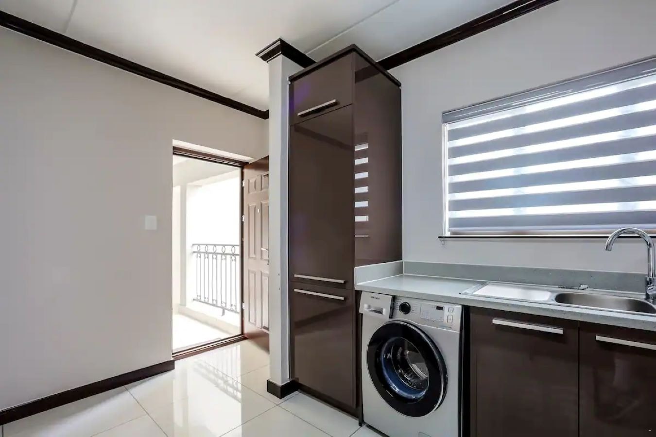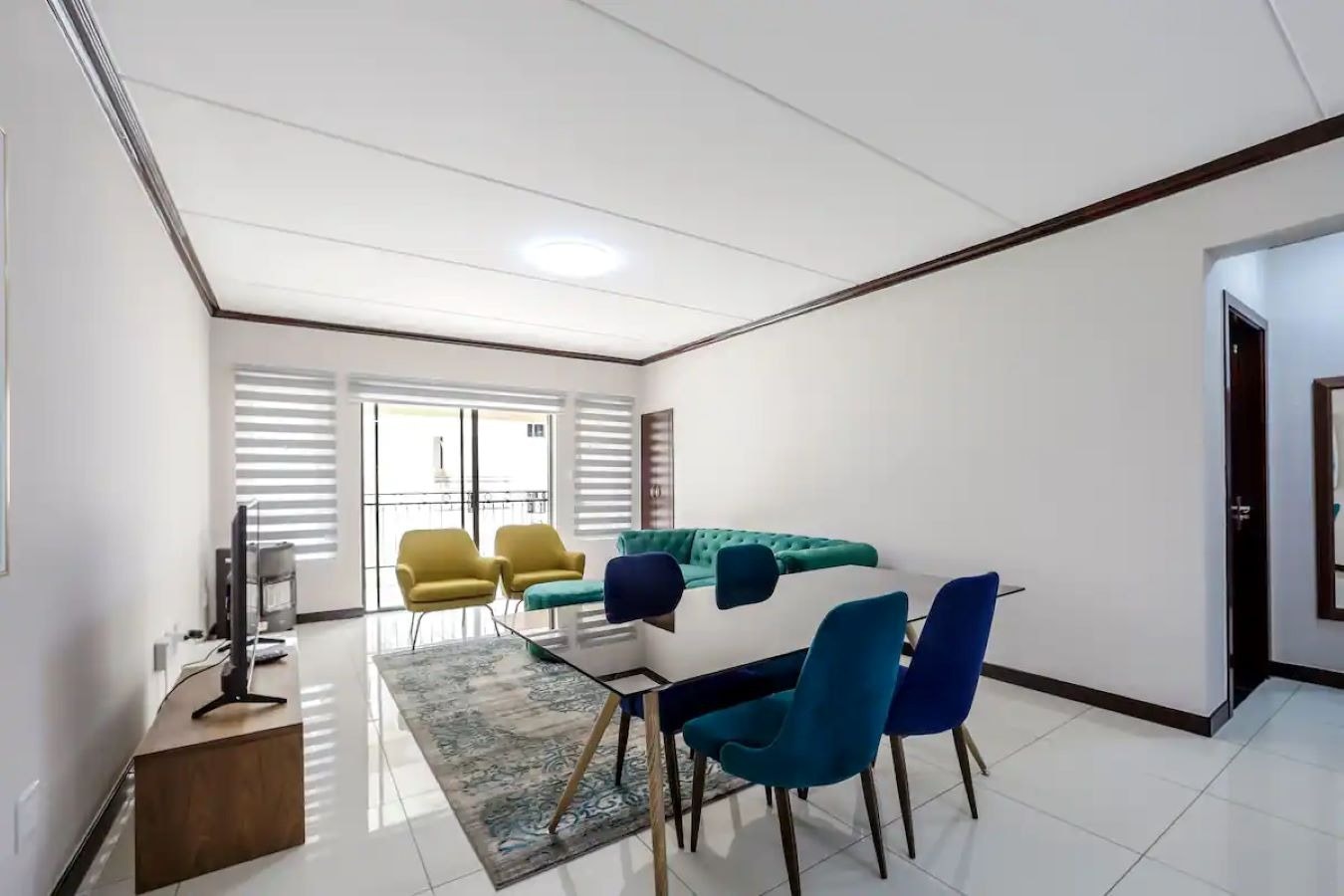 Die oopplan-kombuis is met 'n yskas-vrieskas, mikrogolfoond, oond, stoof, wasmasjien, eetgerei, breekware en tee- en koffiemaakgeriewe toegerus. Die leefarea het 'n etenstafel, gemaklike sitplek en 'n TV.