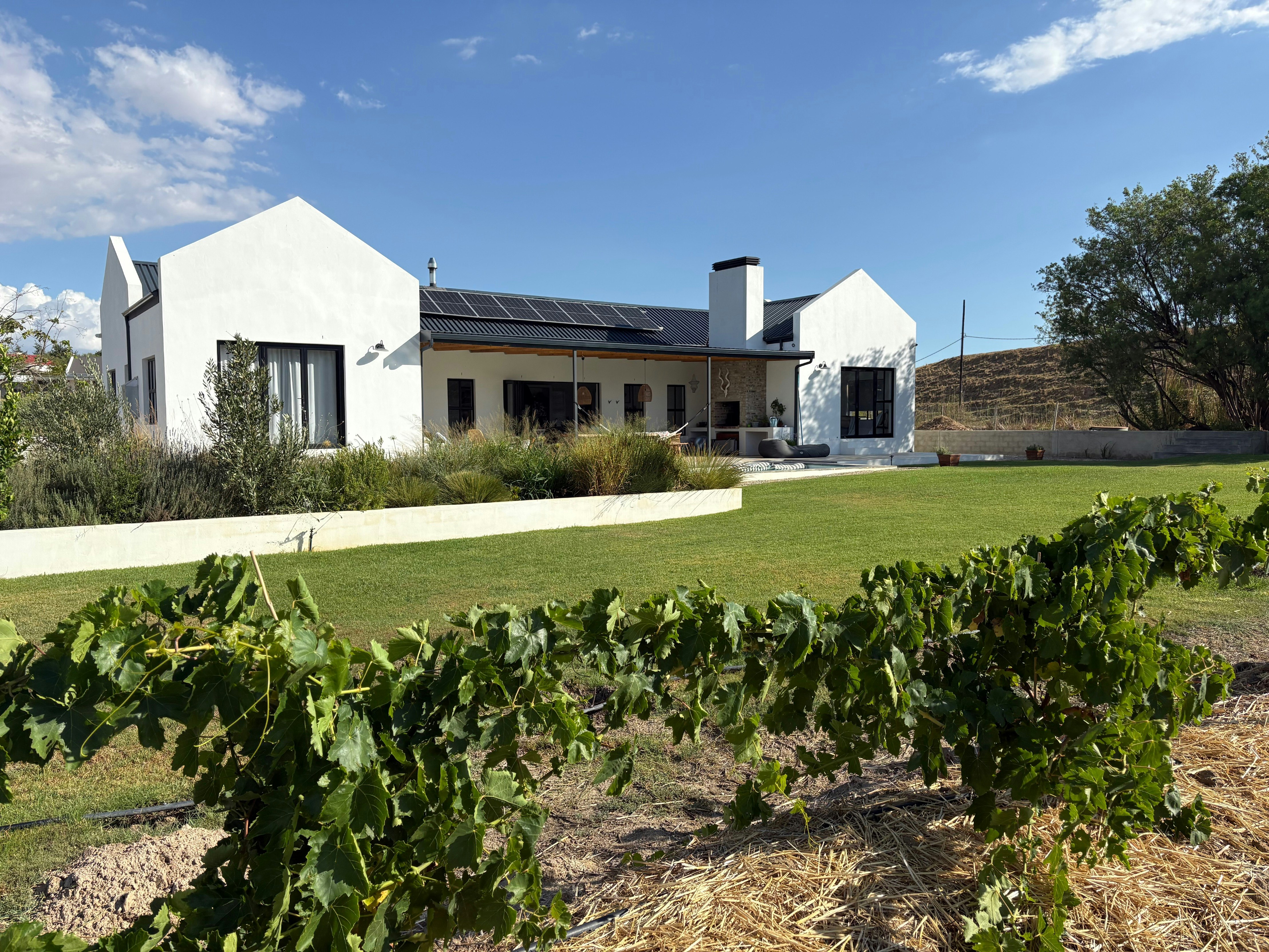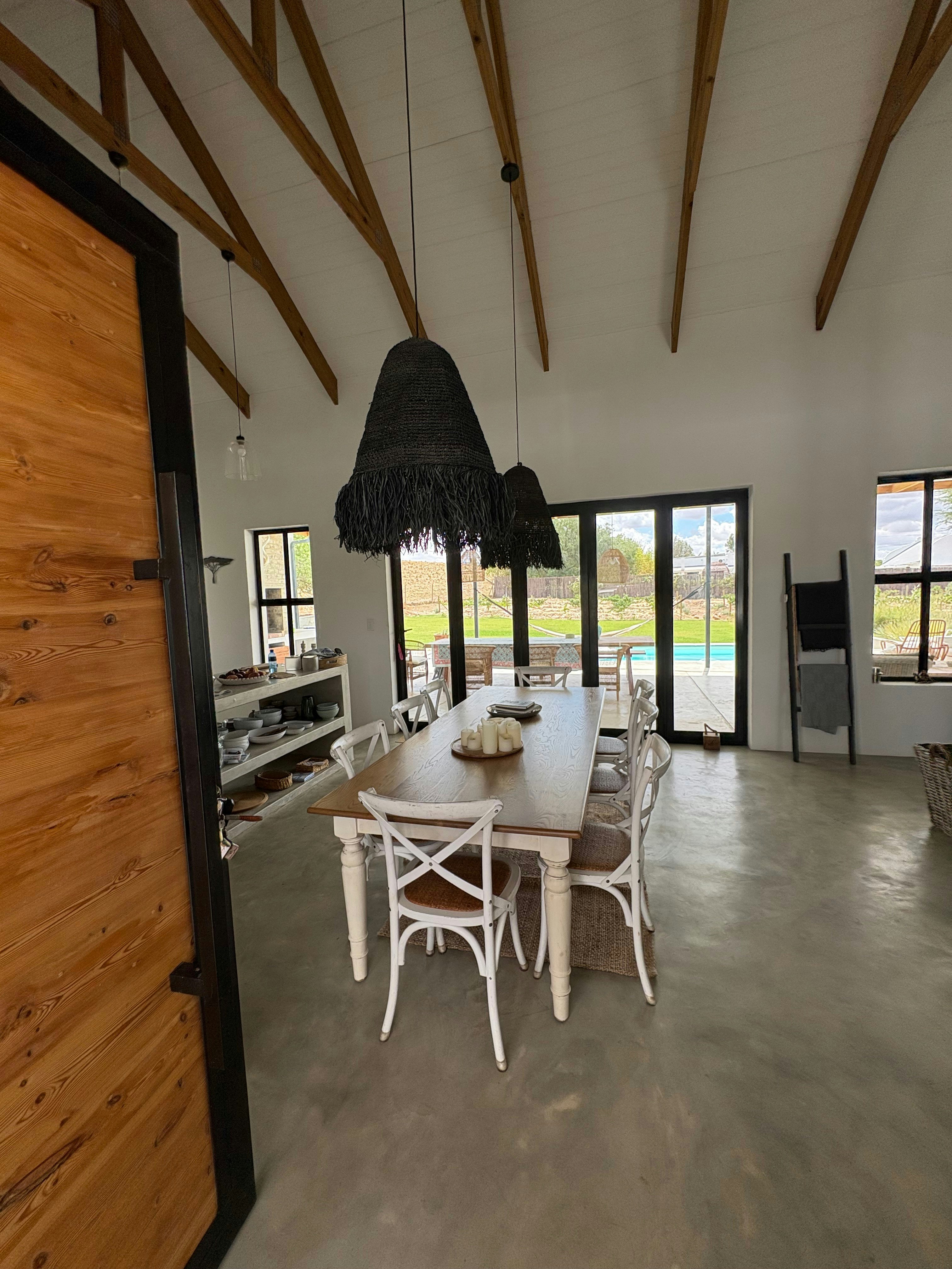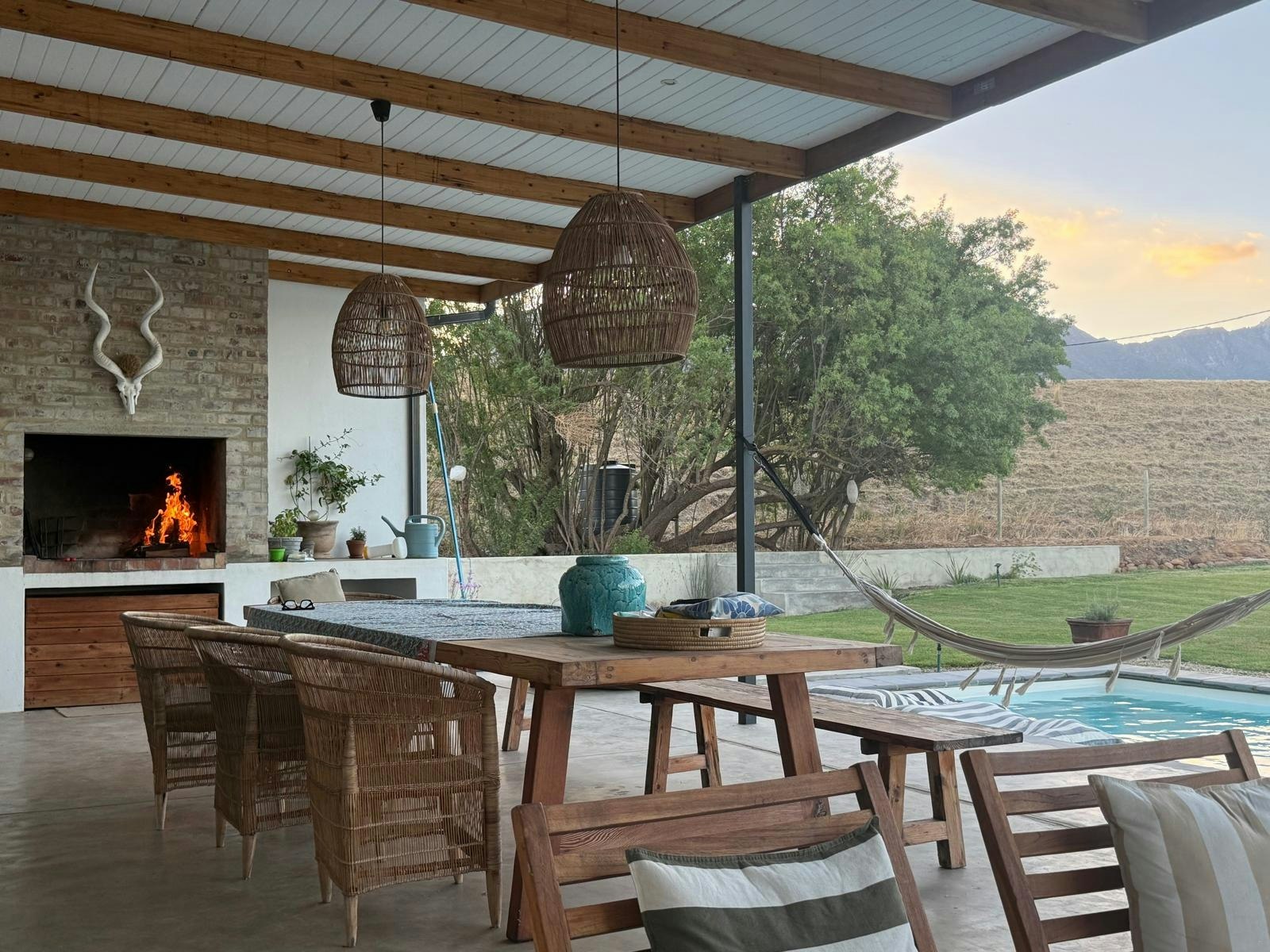 Through the stacking doors is a covered patio with an outdoor dining table, a comfy lounging corner and a built-in braai which is the perfect spot for a sundowner in the evening while the fire is burning. This patio leads onto a lovely swimming pool where guests can cool off on those hot summer days. Powered by solar panels and a battery, the house ensures uninterrupted living, free from the inconvenience of load shedding.