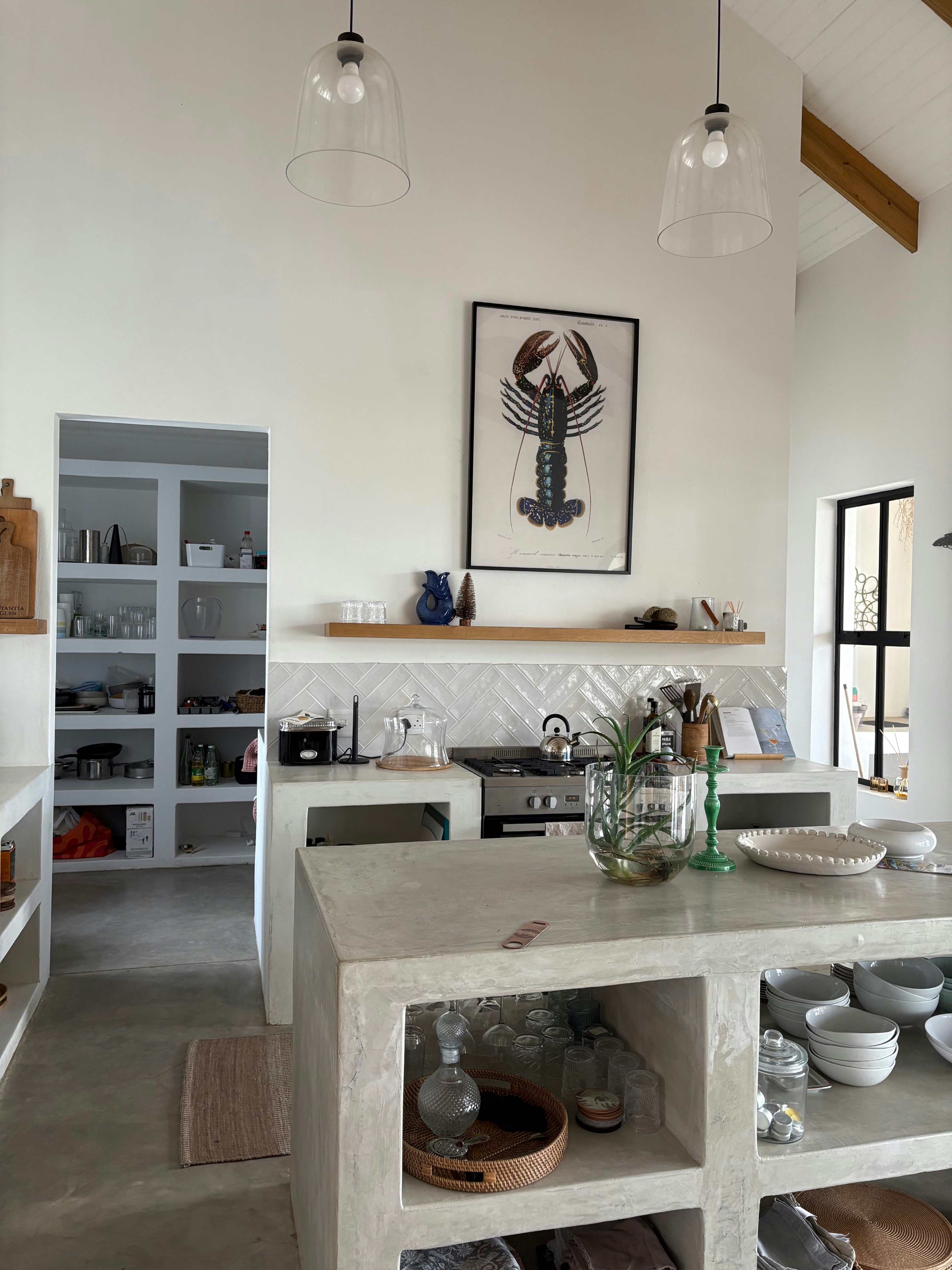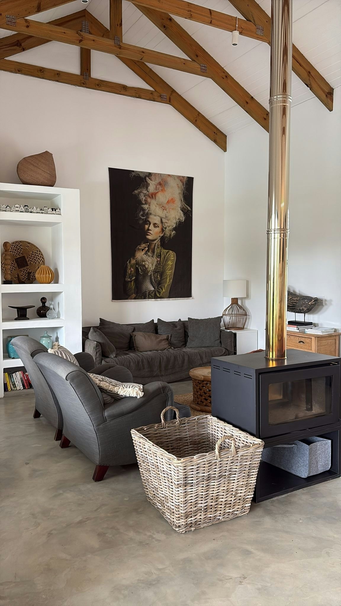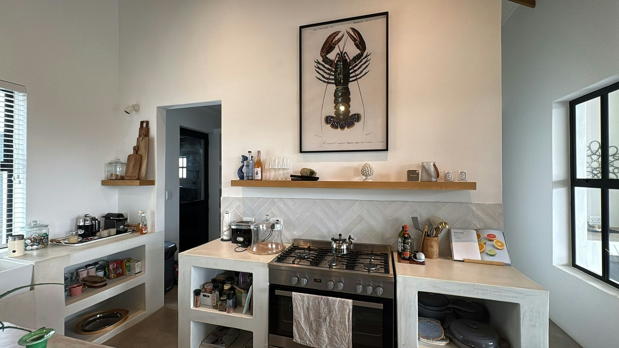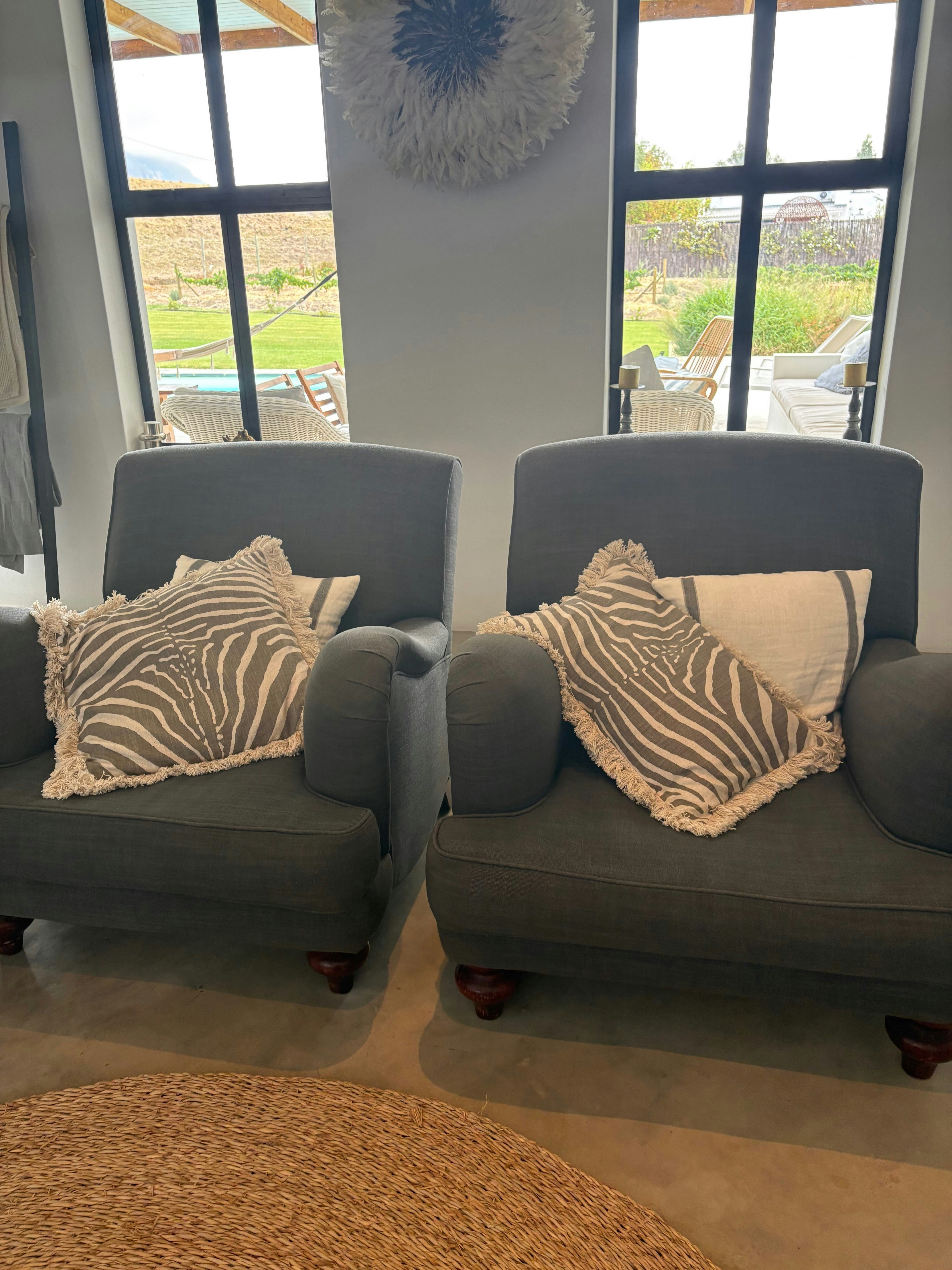 Through the stacking doors is a covered patio with an outdoor dining table, a comfy lounging corner and a built-in braai which is the perfect spot for a sundowner in the evening while the fire is burning. This patio leads onto a lovely swimming pool where guests can cool off on those hot summer days. Powered by solar panels and a battery, the house ensures uninterrupted living, free from the inconvenience of load shedding.