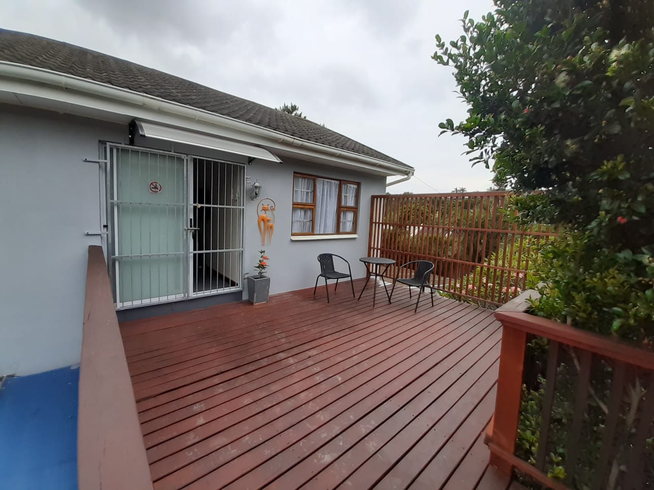 Comfortable self-catering accommodation is offered in an upstairs apartment, above the garage, with a large wooden deck. The apartment has its own entrance and on-site undercover parking.