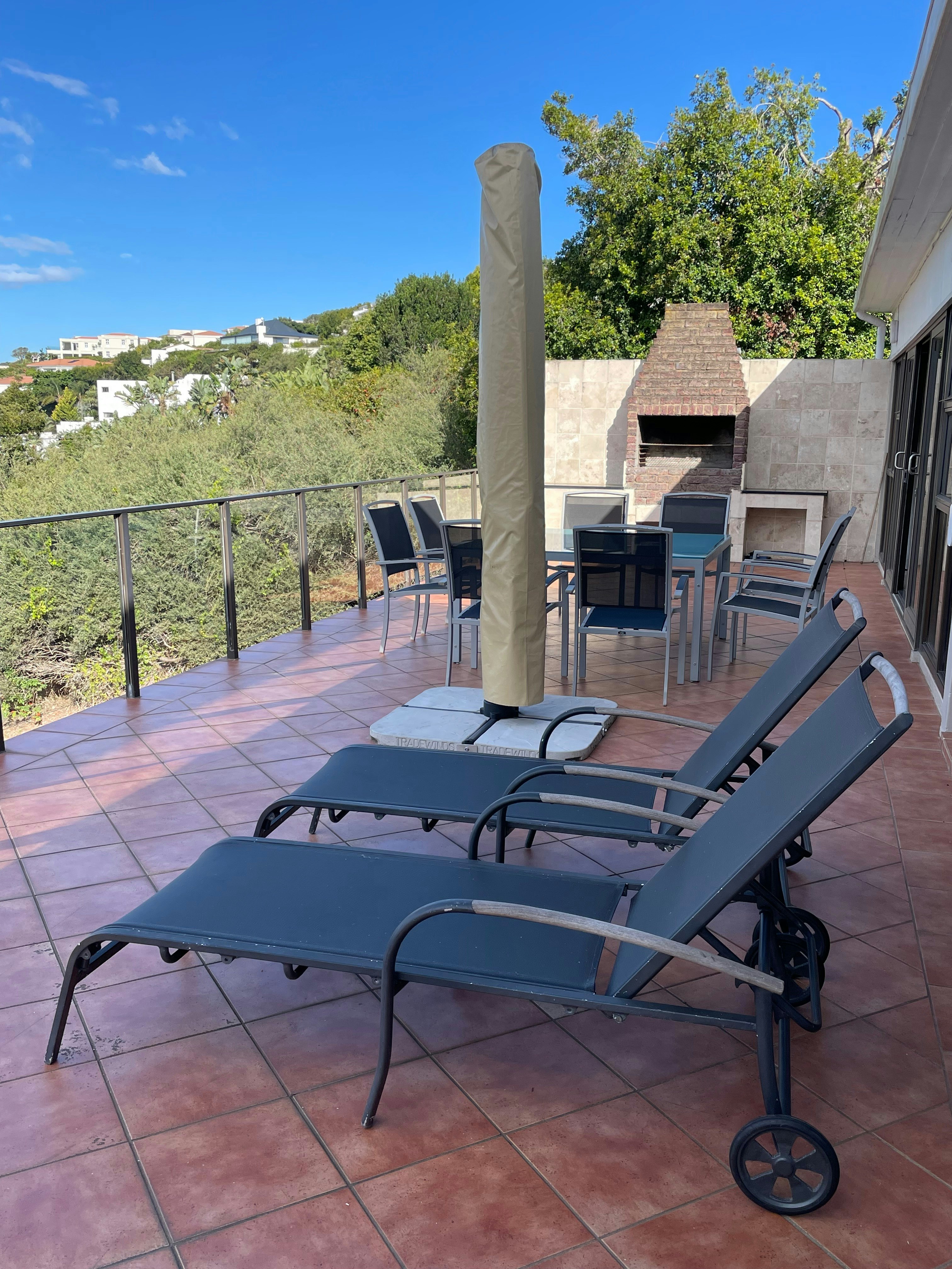 The family room is open plan to the kitchen and bar, and dining area, offering plenty of seating and a smart TV. The bar area includes a small bar fridge for convenience and opens up onto the large patio, which features a built-in braai, an outdoor dining table with a large umbrella, and 2 recliners. A Weber braai is also available for use. The house boasts a secure garden with electric gates, and there is undercover parking.