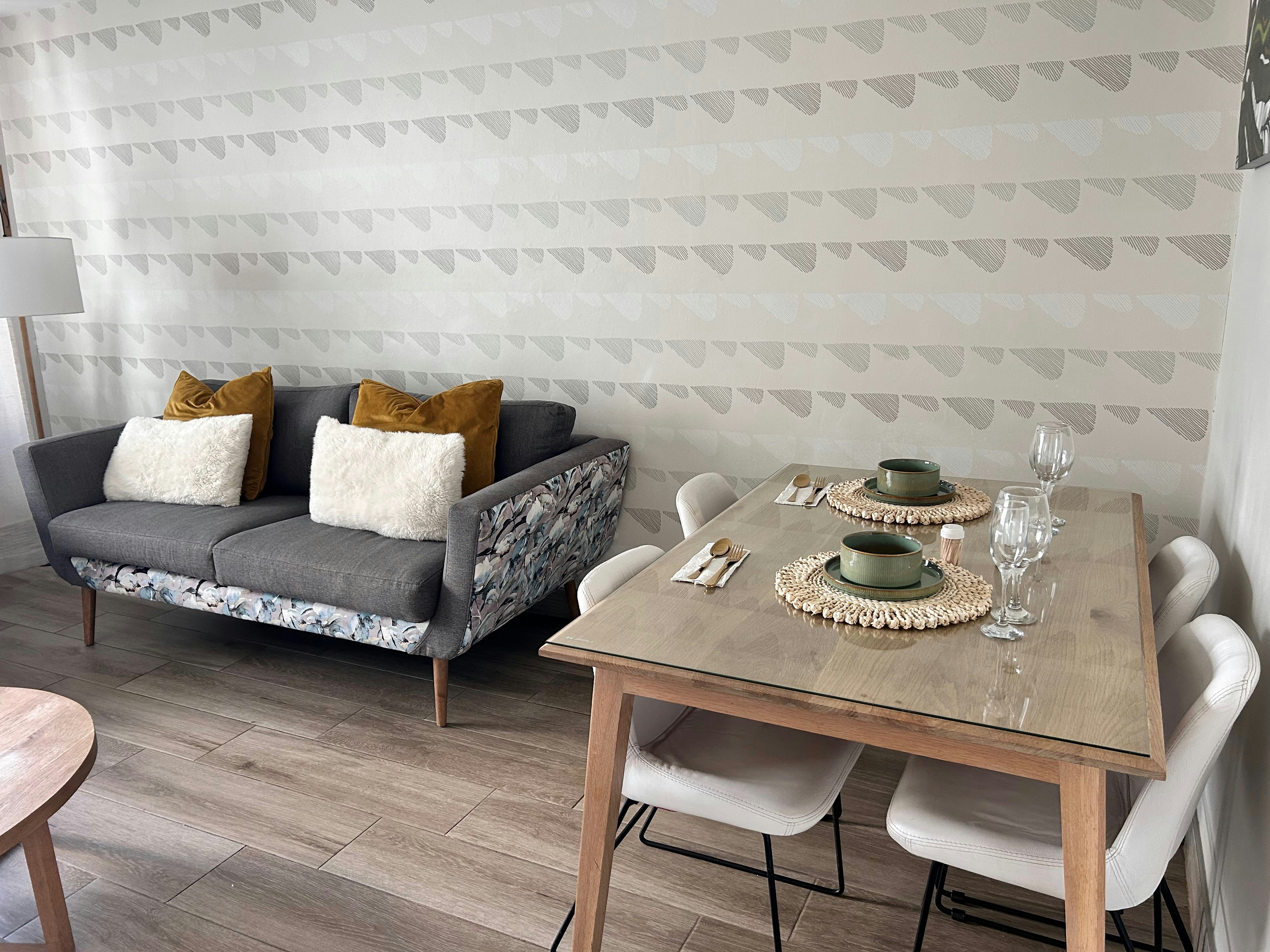 The apartment features a fully equipped kitchen that includes a stovetop, microwave, kettle, fridge, and essential cutlery and crockery, along with a dining area. Additional amenities include air conditioning, a washing machine, tumble dryer, a flat-screen TV, and free Wi-Fi.