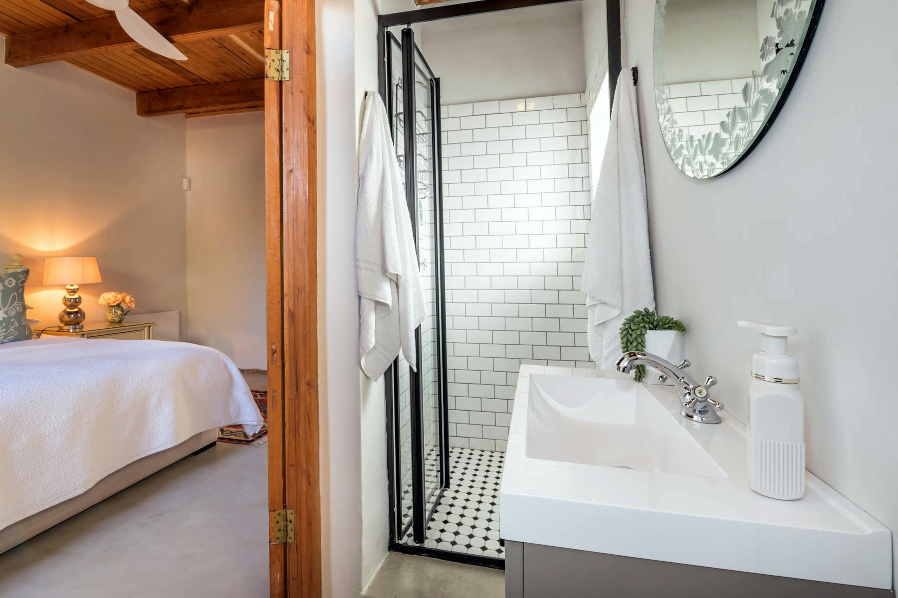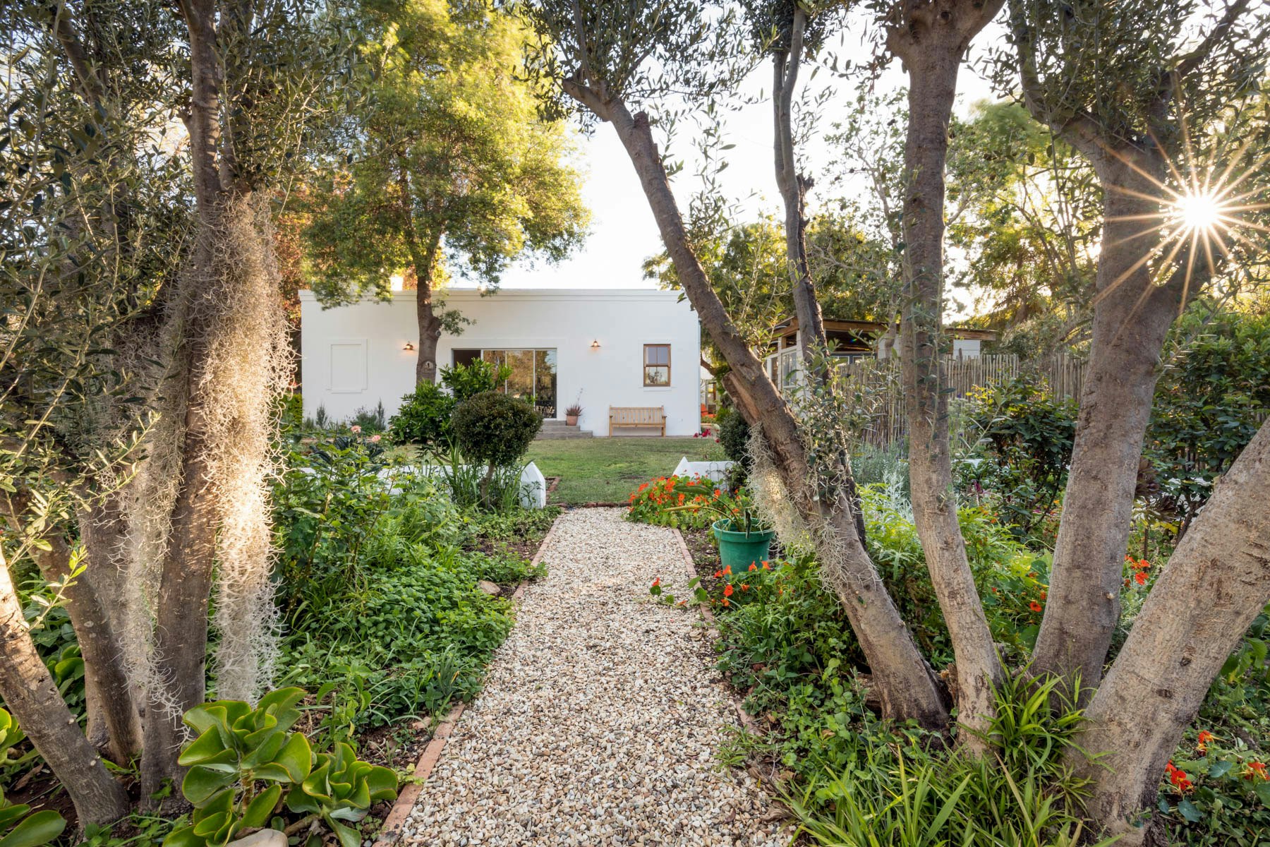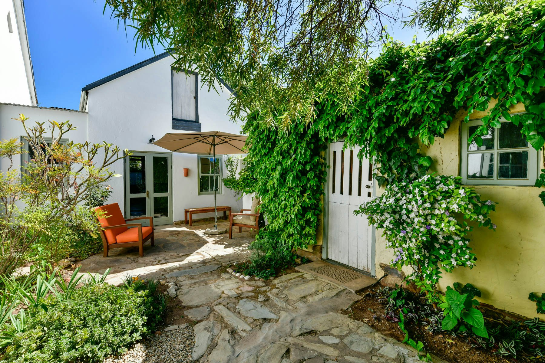 The property accommodates up to 8 guests across 4 well-appointed bedrooms. The main house features 3 bedrooms - two are furnished with queen-size beds and en-suite bathrooms fitted with showers. The third bedroom offers 2 single beds and shares a separate bathroom fitted with a bath and shower. A fourth bedroom is located in a separate garden cottage, featuring a queen-size bed, en-suite bathroom with a shower, and its own living area with a kitchenette equipped with a bar fridge and coffee- and tea-making facilities. Wi-Fi is available throughout the property.