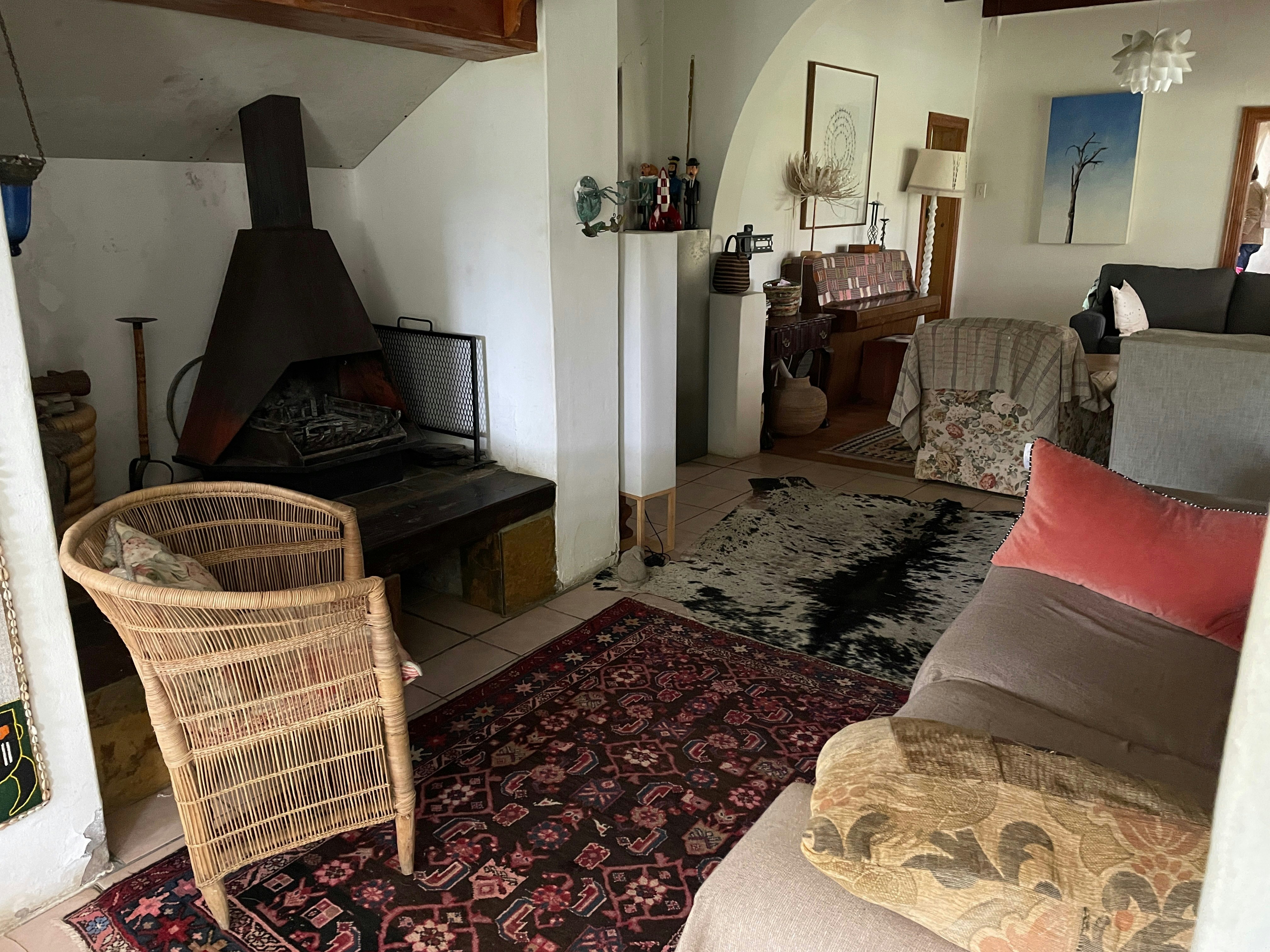 The kitchen is the hub of the house, and features a long wooden table for meals. The kitchen is equipped with a gas hob, an electric oven, a large fridge, an under-counter deep freeze, a dishwasher, and a washing machine. The kitchen opens to an area with a big sofa in front of an open fireplace. This area leads to the lounge, with double doors to a long, wide verandah. This is a lovely, cool spot on a hot summer morning.