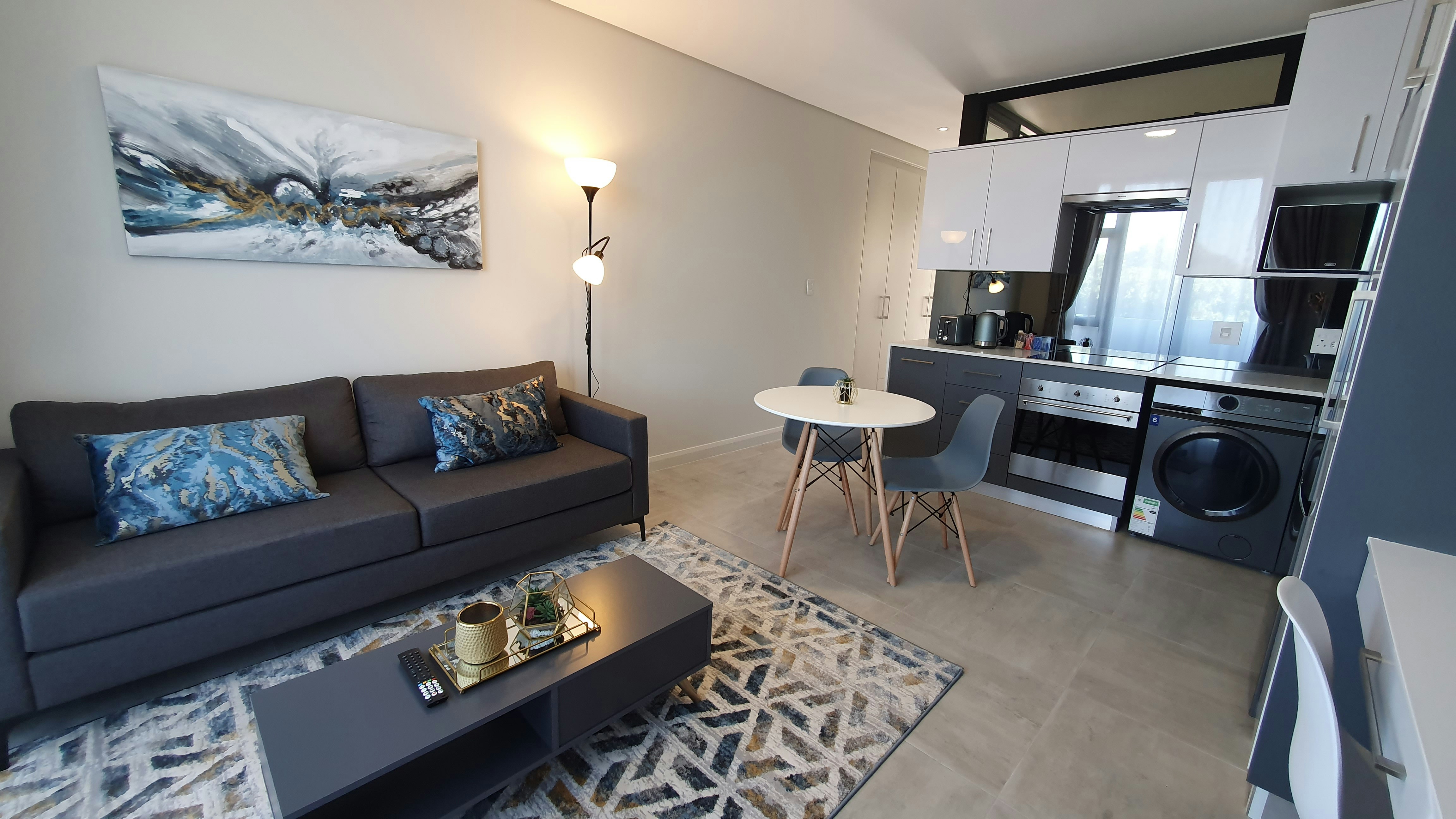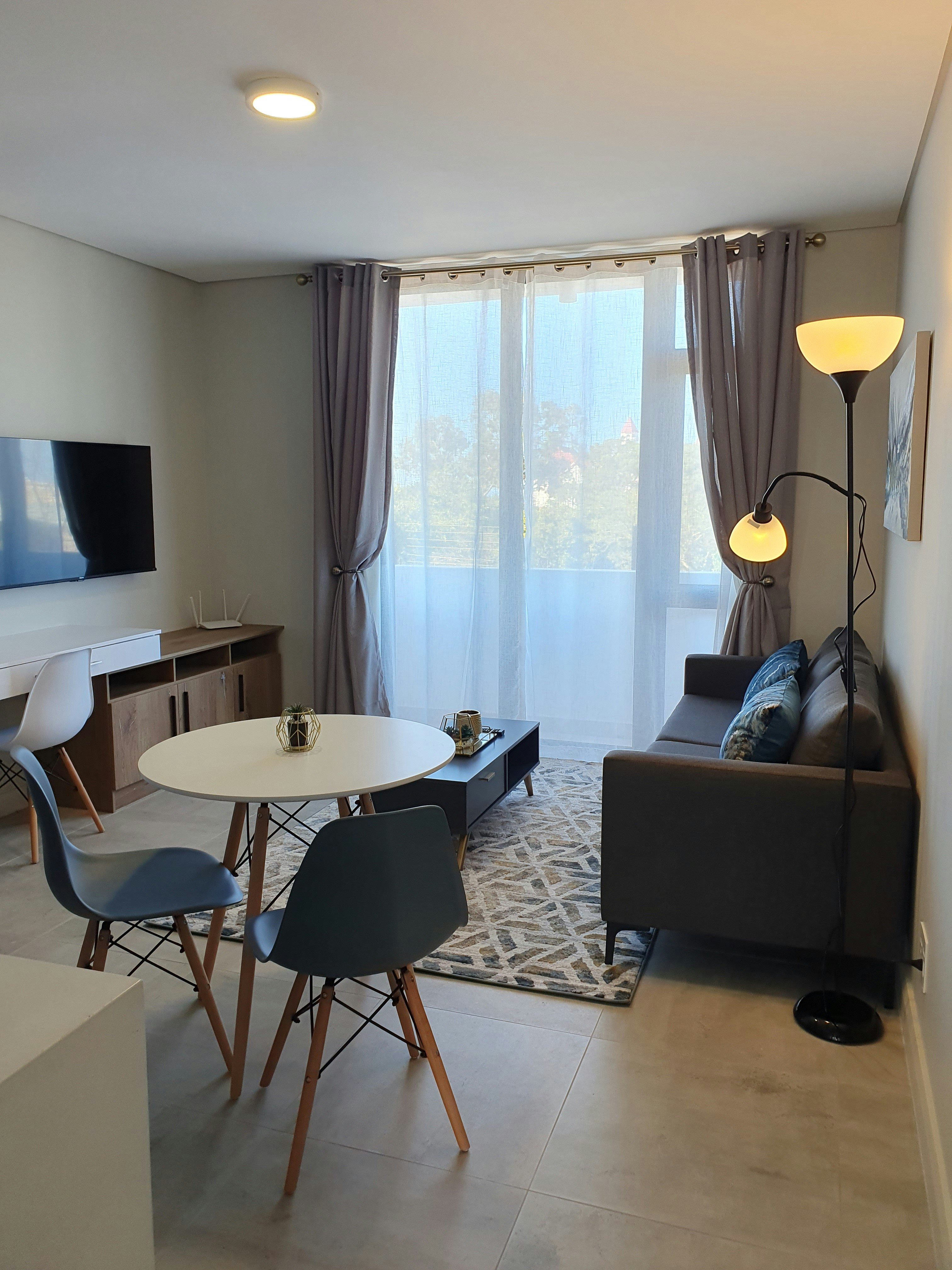 The open-plan living area includes a well-equipped kitchen complete with a stove, oven, microwave, kettle, toaster, fridge-freezer, and washing machine. A central 2-seater dining table is also provided. The adjacent lounge is furnished with a comfortable couch, a desk, and a chair. For guest entertainment, there is a TV and complimentary Wi-Fi access.