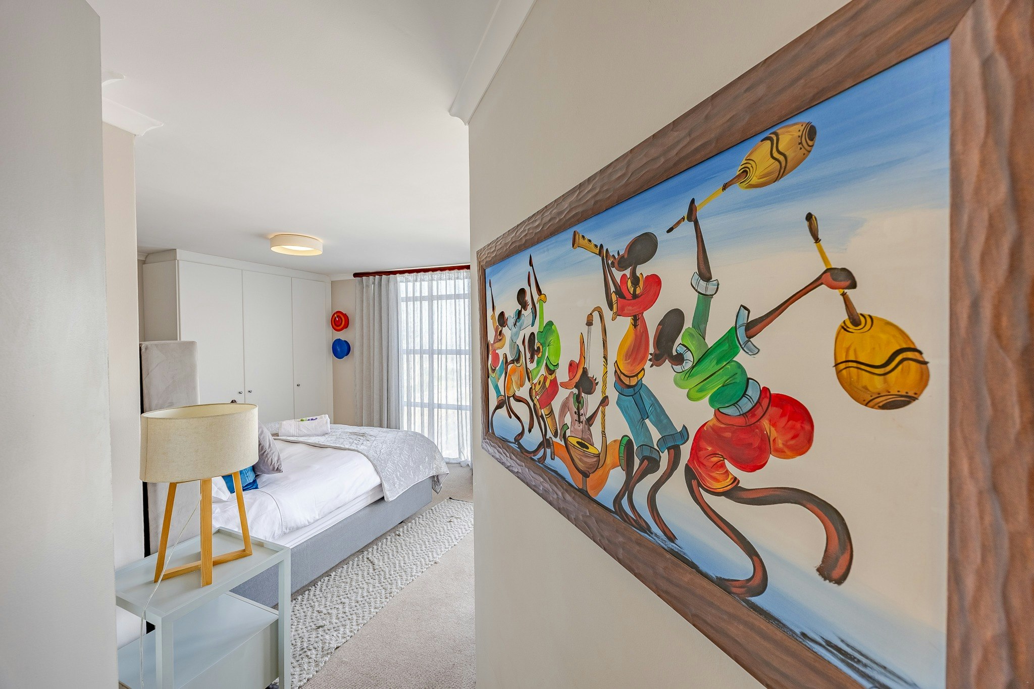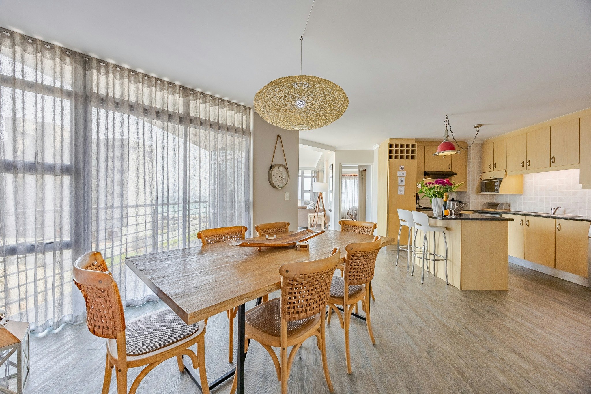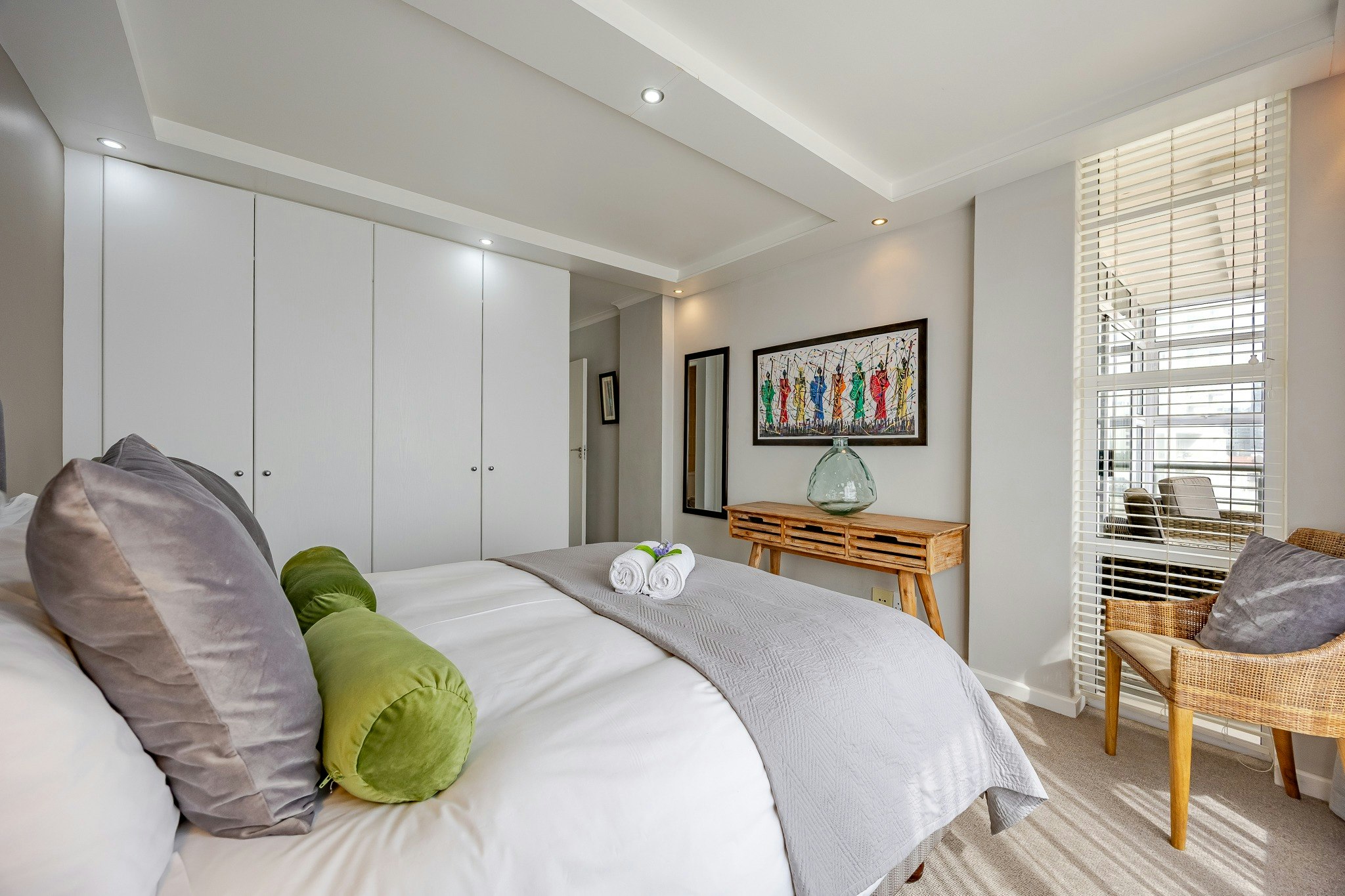 This apartment comprises 2 en-suite bedrooms. Each bedroom is furnished with a queen/king-size bed, and the en-suite bathrooms are fitted with a shower or bath. The open-plan, well-equipped kitchen contains a fridge, microwave, stove and oven. The adjacent open-plan living area has a 6-seater dining table, and the lounge has a TV with selected DStv channels.