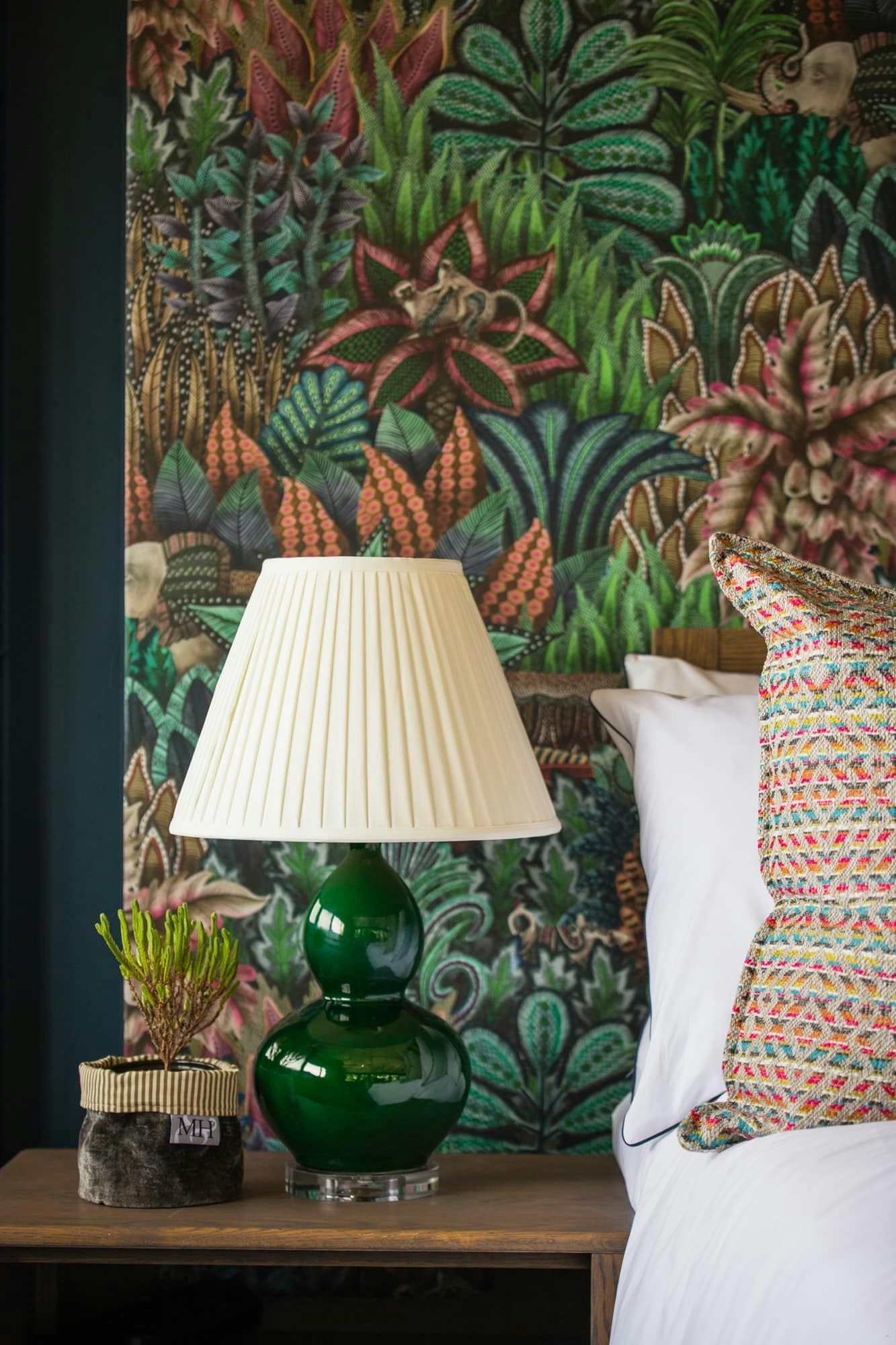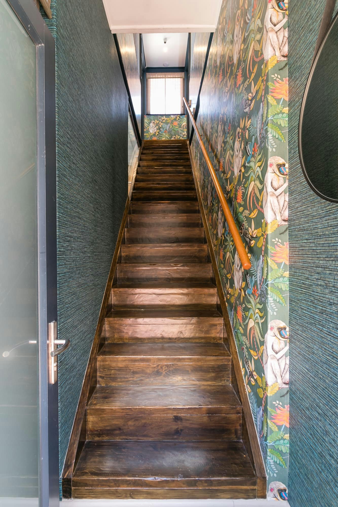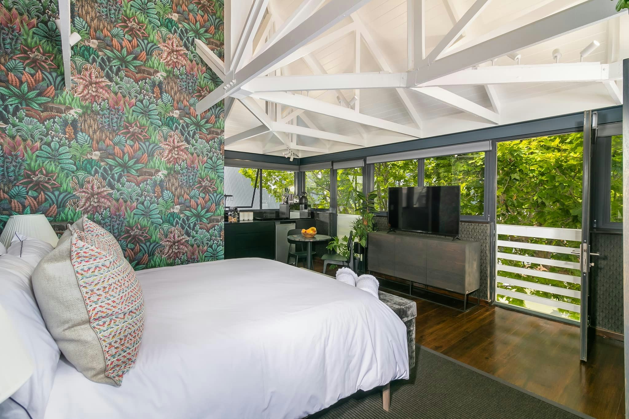 Island Forest Loft voel soos 'n boomhuis en is omring met plantegroei, en dit is pragtig versier met Ardmore Singita-muurpapier, wat "plek van wonderwerke" beteken en dit herinner aan die prag van die Knysnawoud.