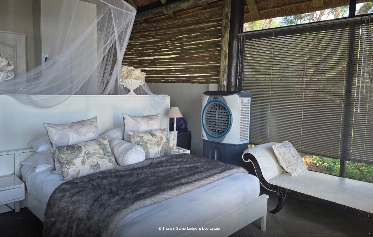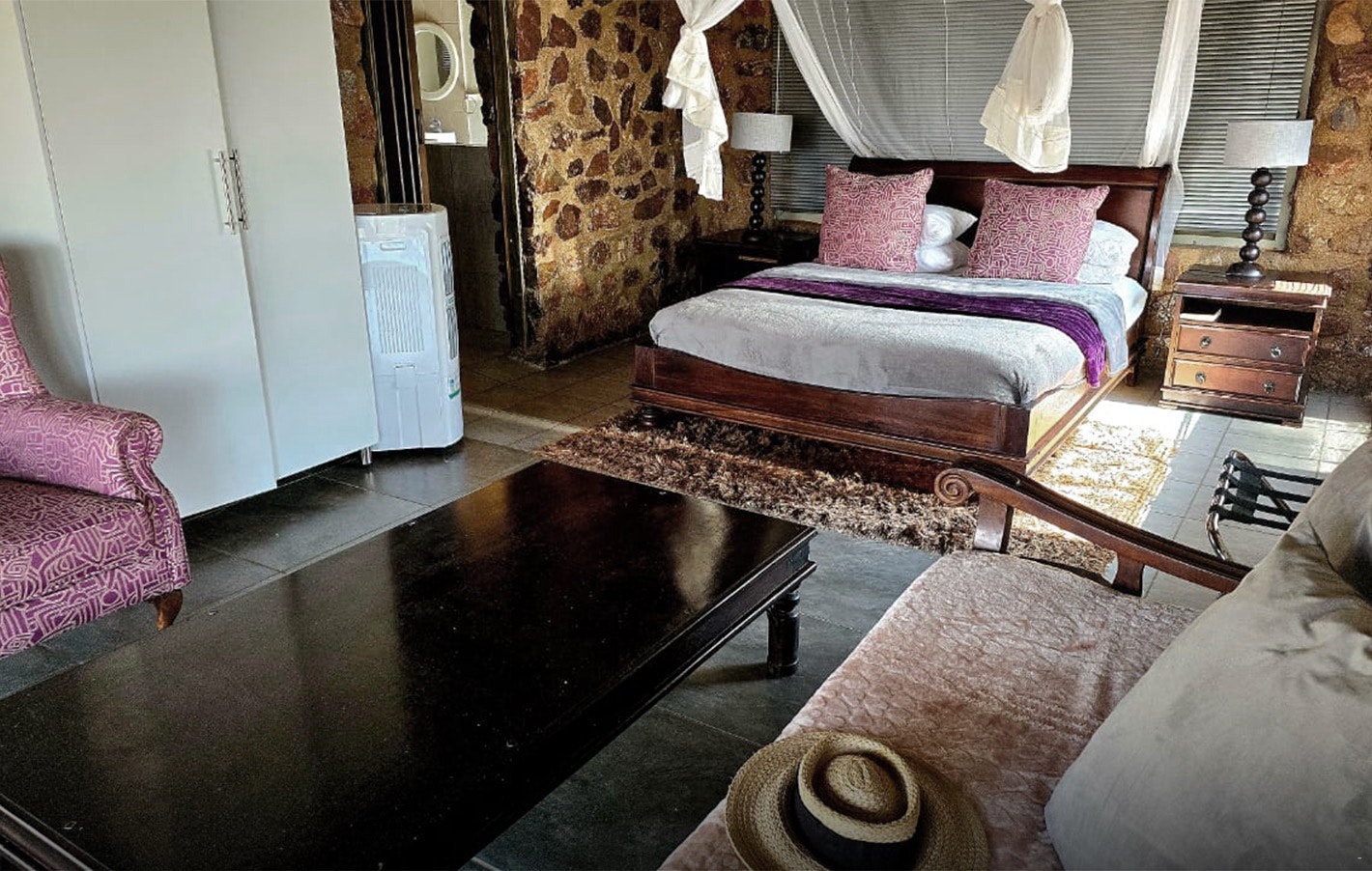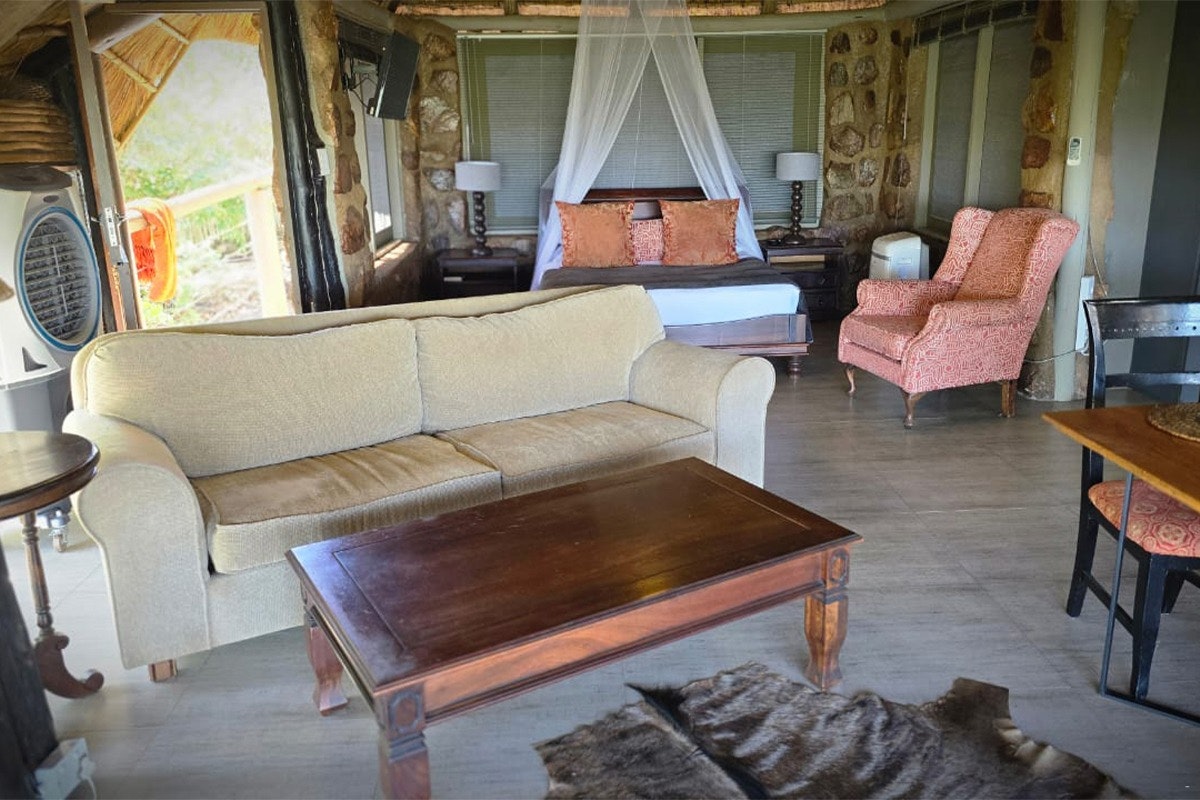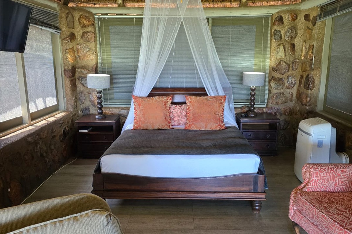 The 4 private African Bush Chalets each feature a queen-size bed, en-suite bathroom, and small kitchenette. Units 4 and 5, located at the top of the hill, offer an exclusive private heated Jacuzzi outside the unit. Units 8 and 9, situated in the lower area of the hill, have access to a shared splash pool and nearby sundeck.