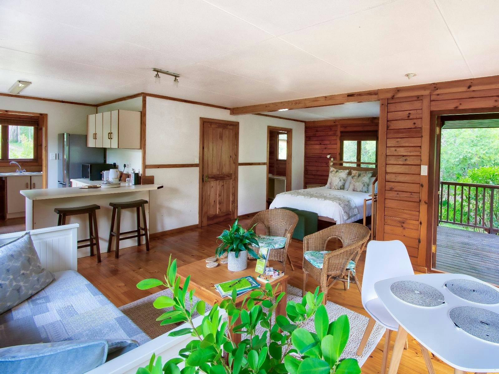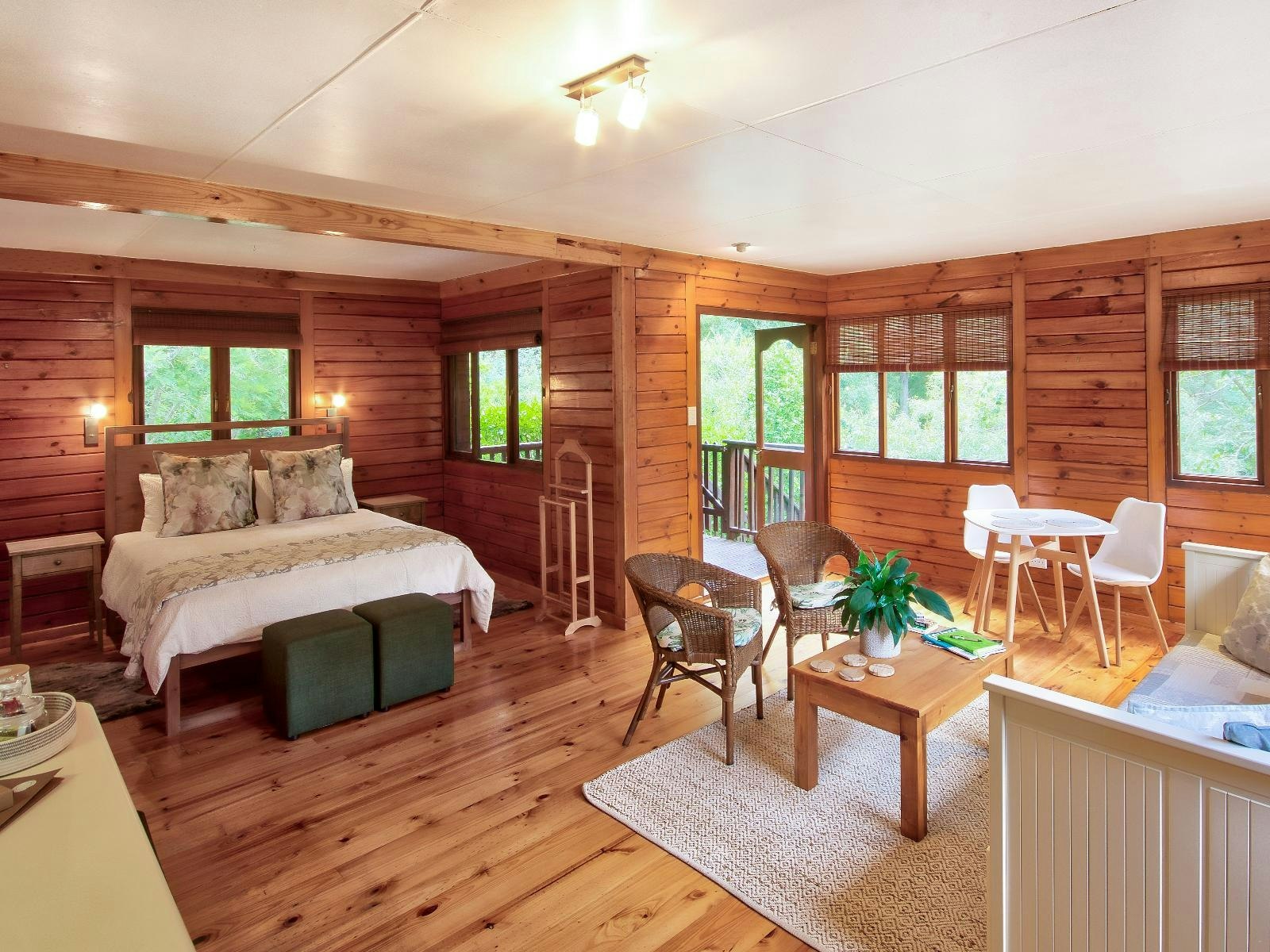 The Family Log Cabin offers spacious and family-friendly accommodation in a peaceful forest setting. The lodge is positioned next to the SANParks Harkerville Forest, providing direct access to walking trails and some of the region’s most popular mountain biking routes.