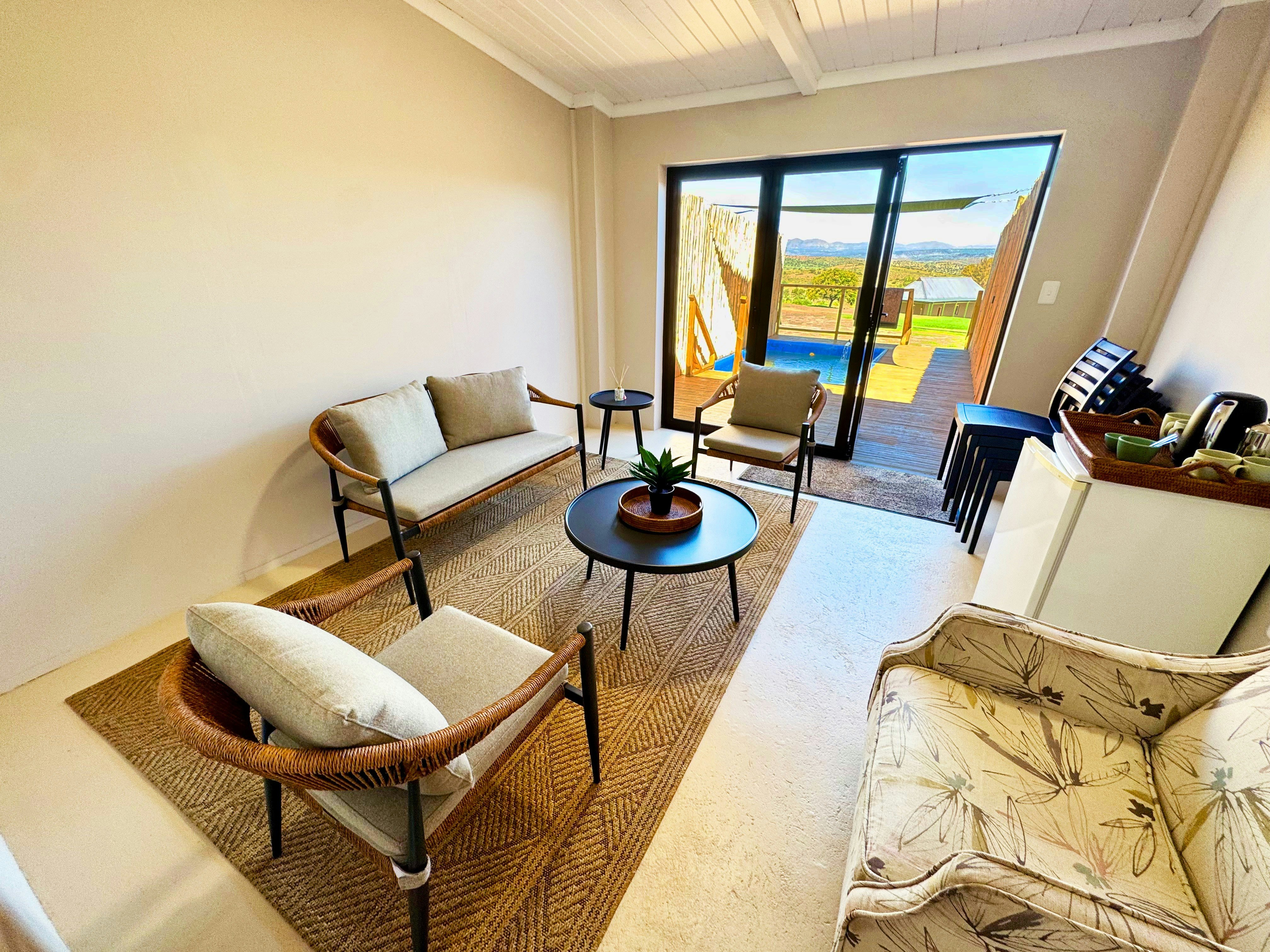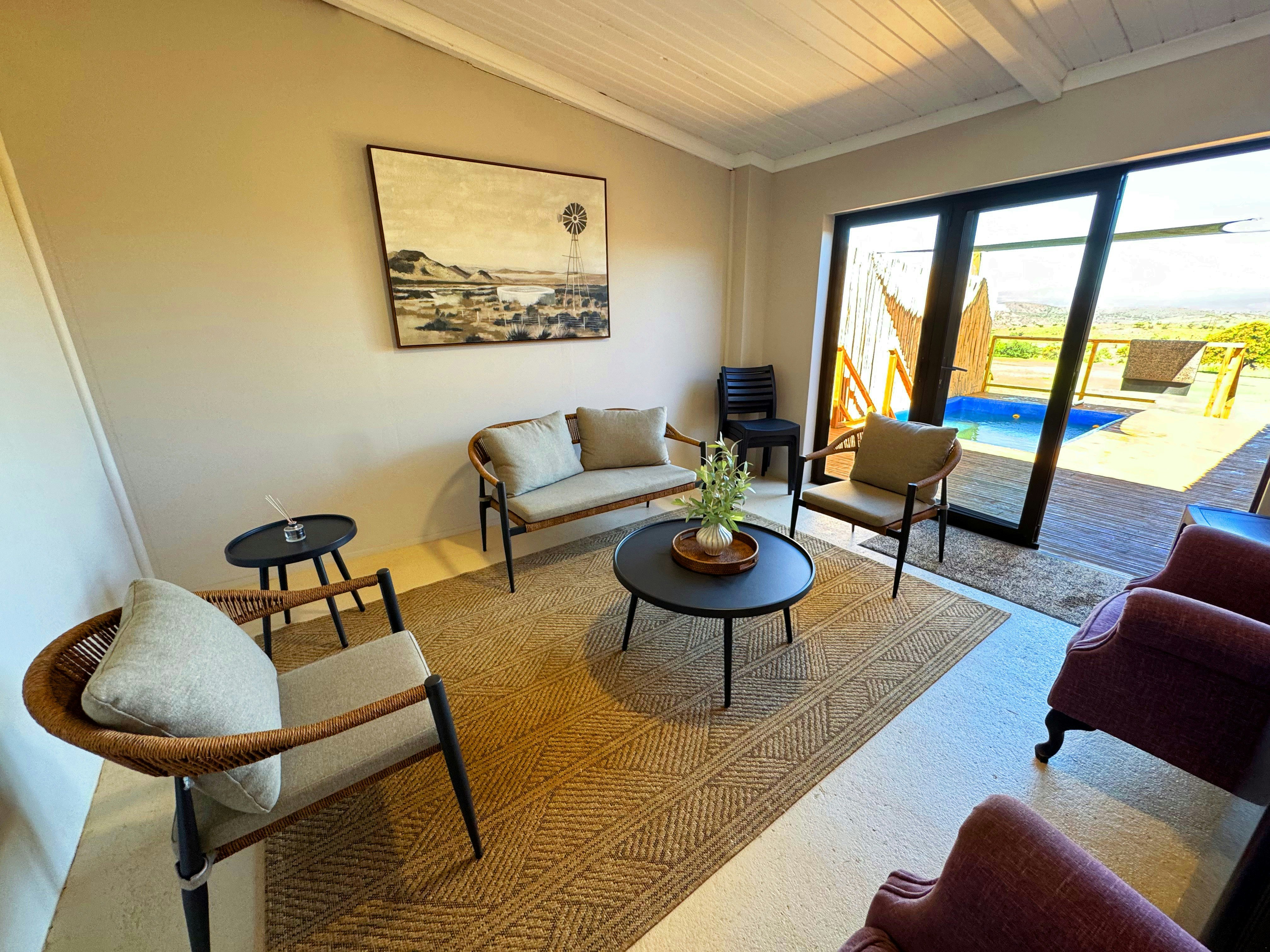 A fully equipped communal Lapa and braai area is available for shared use, creating a welcoming space for outdoor dining and evening gatherings. Guests are invited to relax in the outdoor seating areas, enjoy the natural surroundings, and make use of the shared facilities designed for a social yet peaceful bush experience.