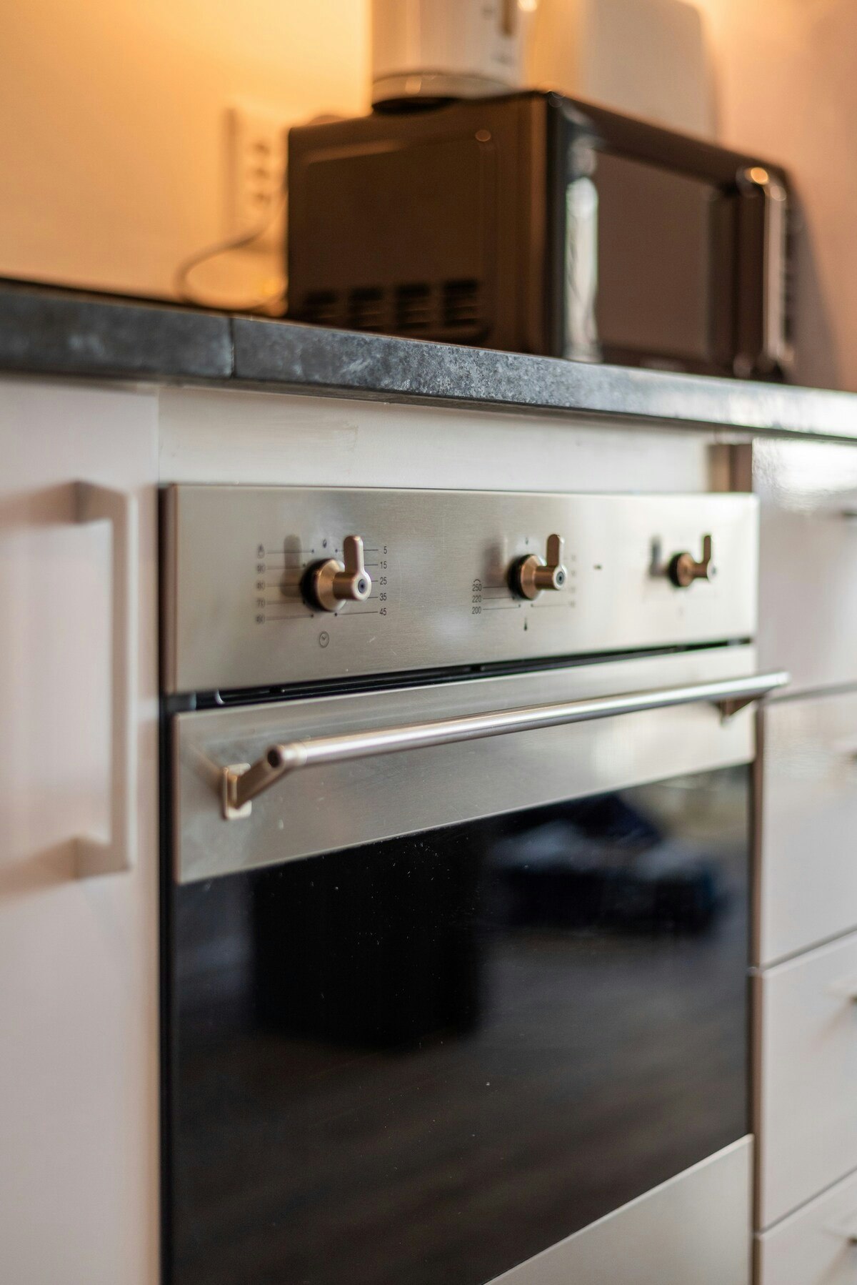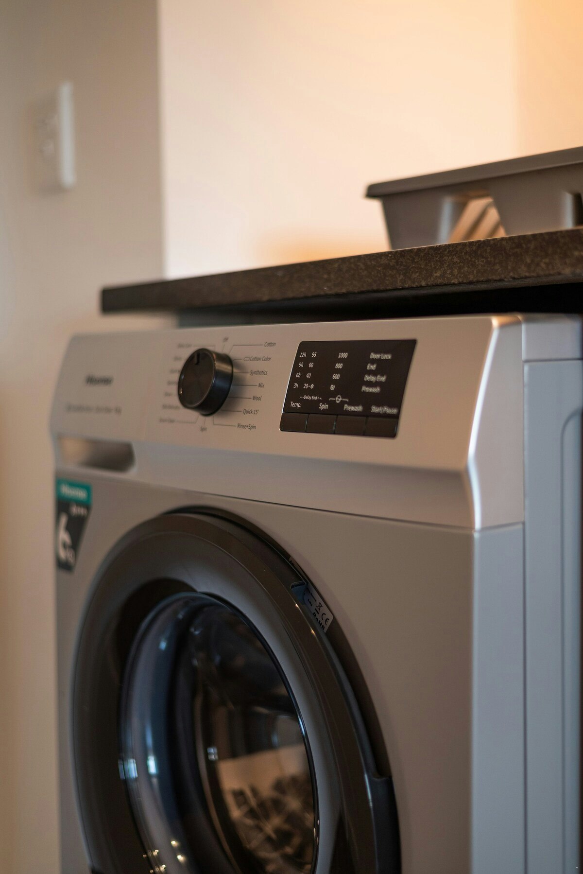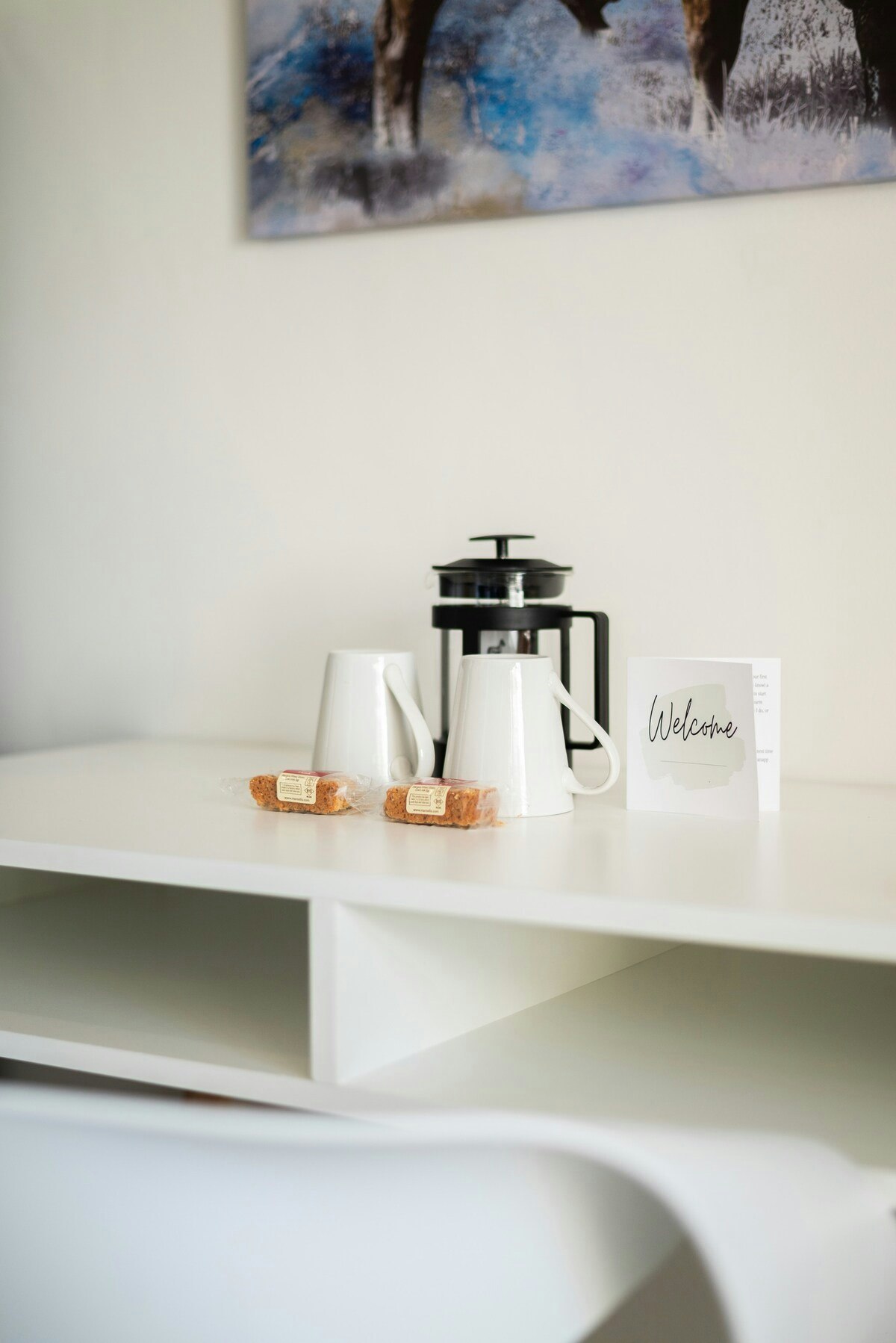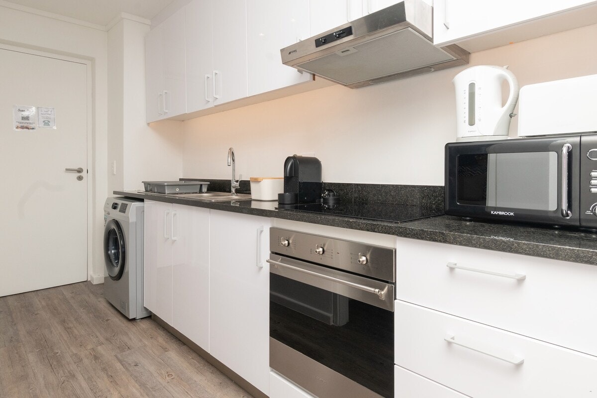 The kitchen is fully equipped for self-catering and includes a stove, oven, fridge-freezer, microwave, cutlery, and crockery. The living area offers a dining table, comfortable seating, and a smart TV. Wi-Fi is available and is supported by a small inverter during power interruptions. A washing machine is also provided for guests’ convenience.