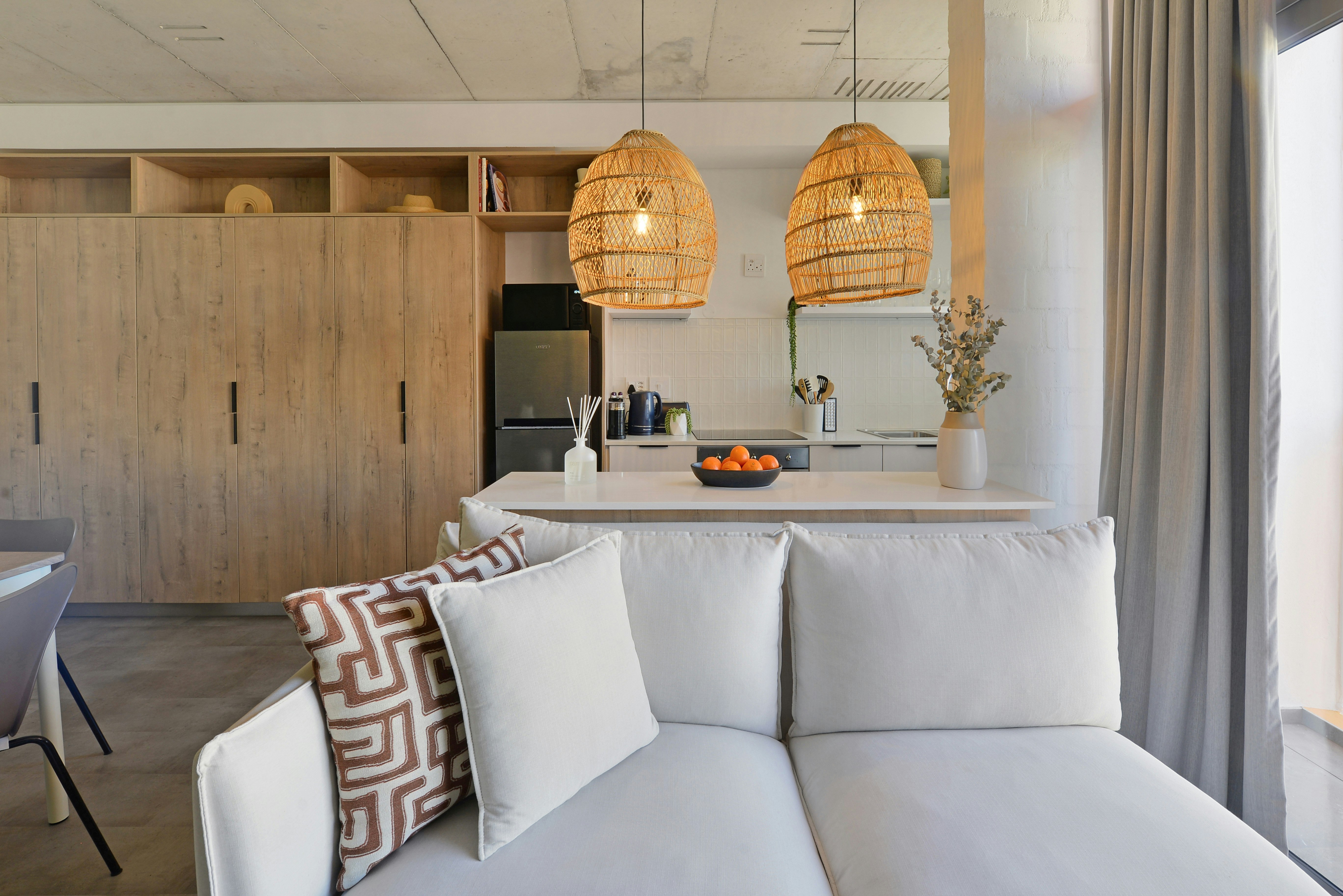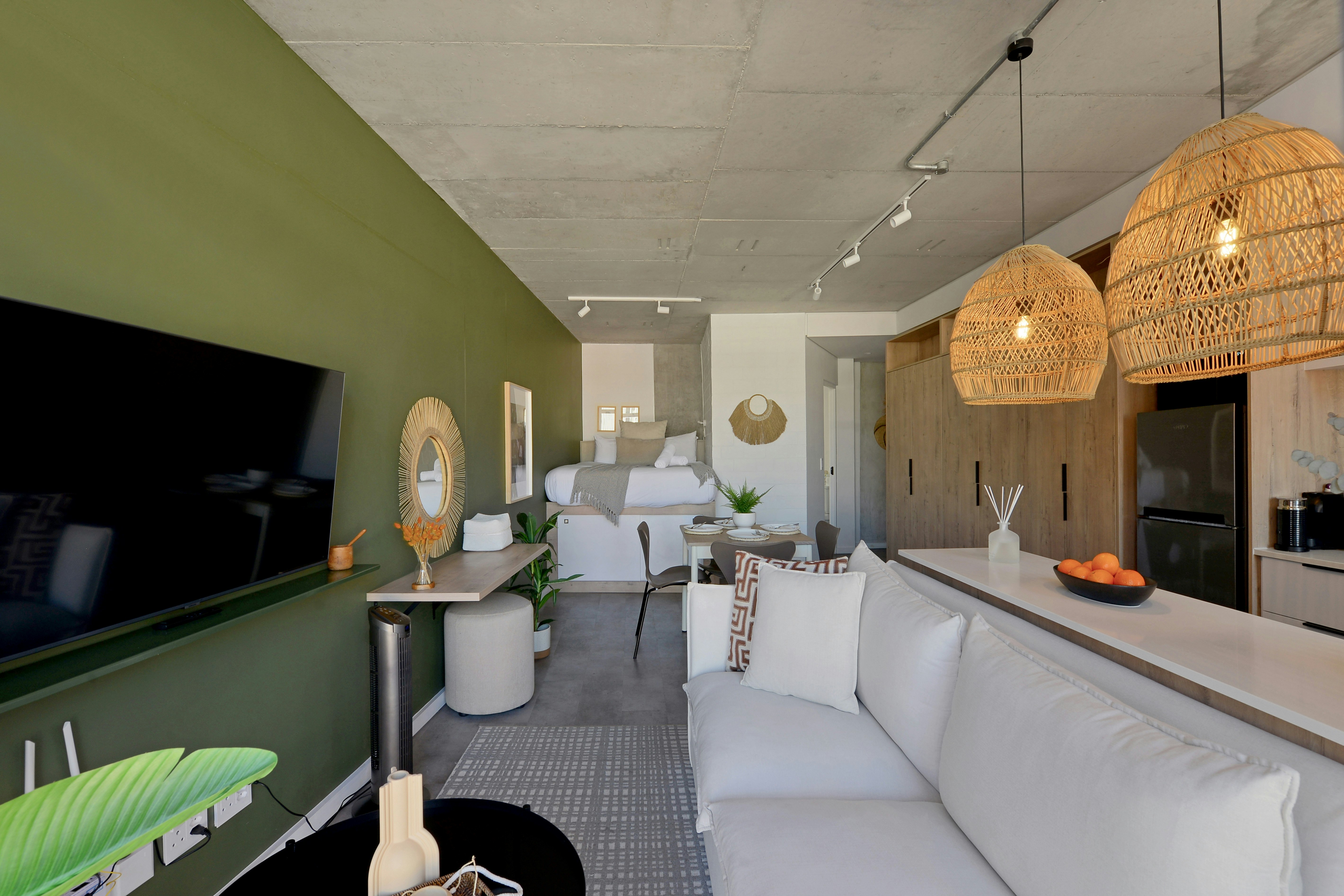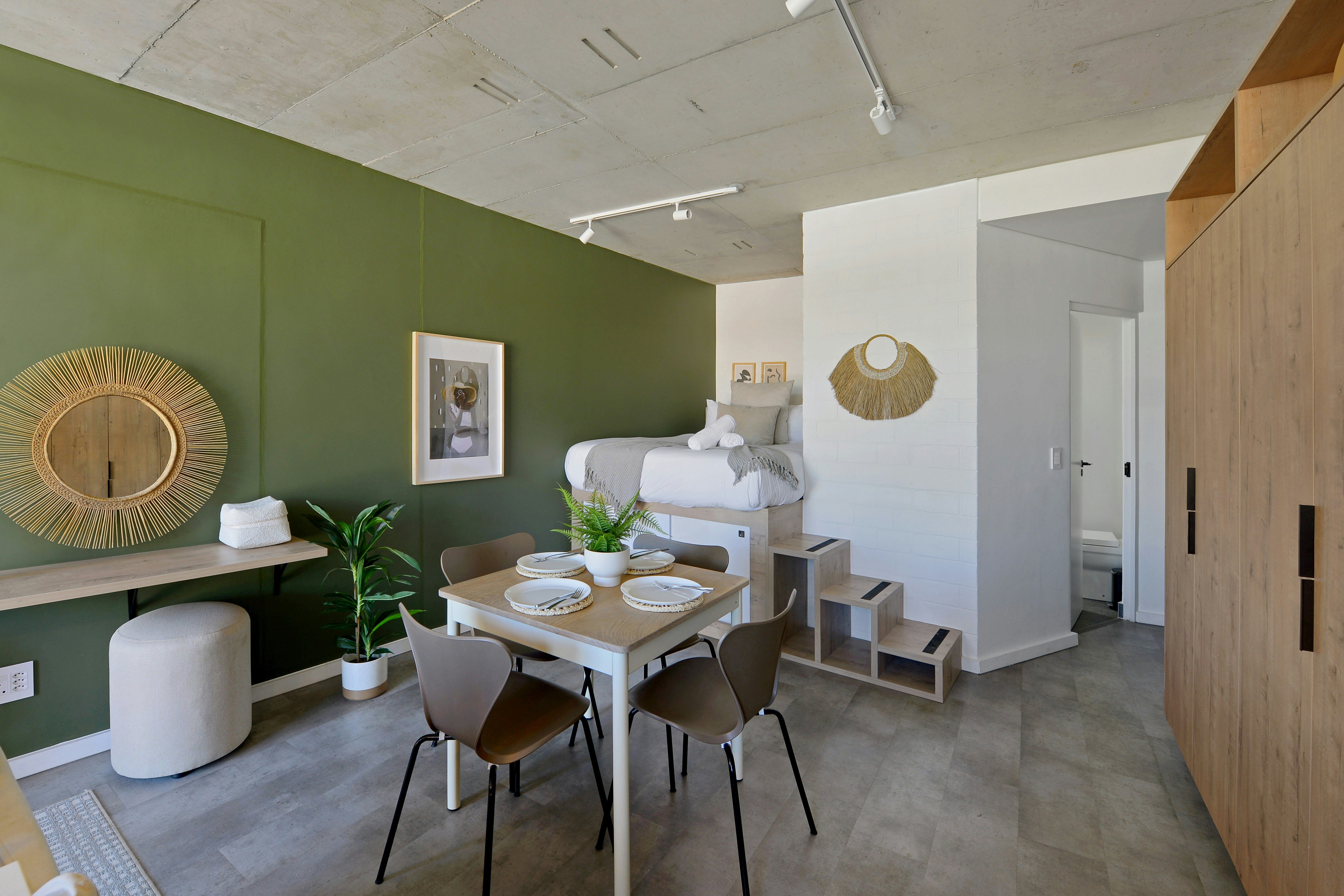The living area opens onto a quaint balcony. Guests have access to a communal rooftop swimming pool with breathtaking panoramic views of Table Mountain, as well as workspaces, a gym, shared laundry facilities, and secure onsite parking.