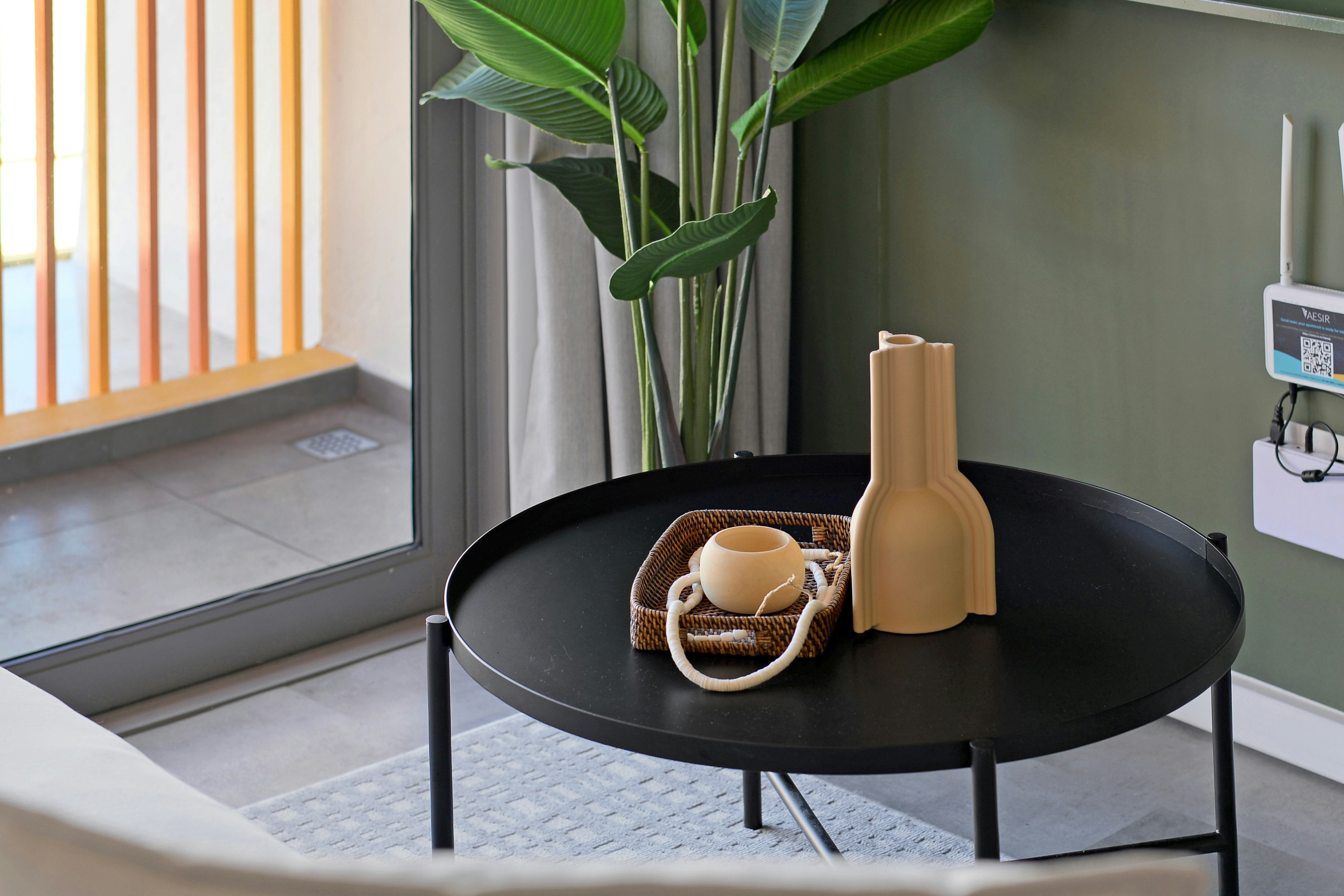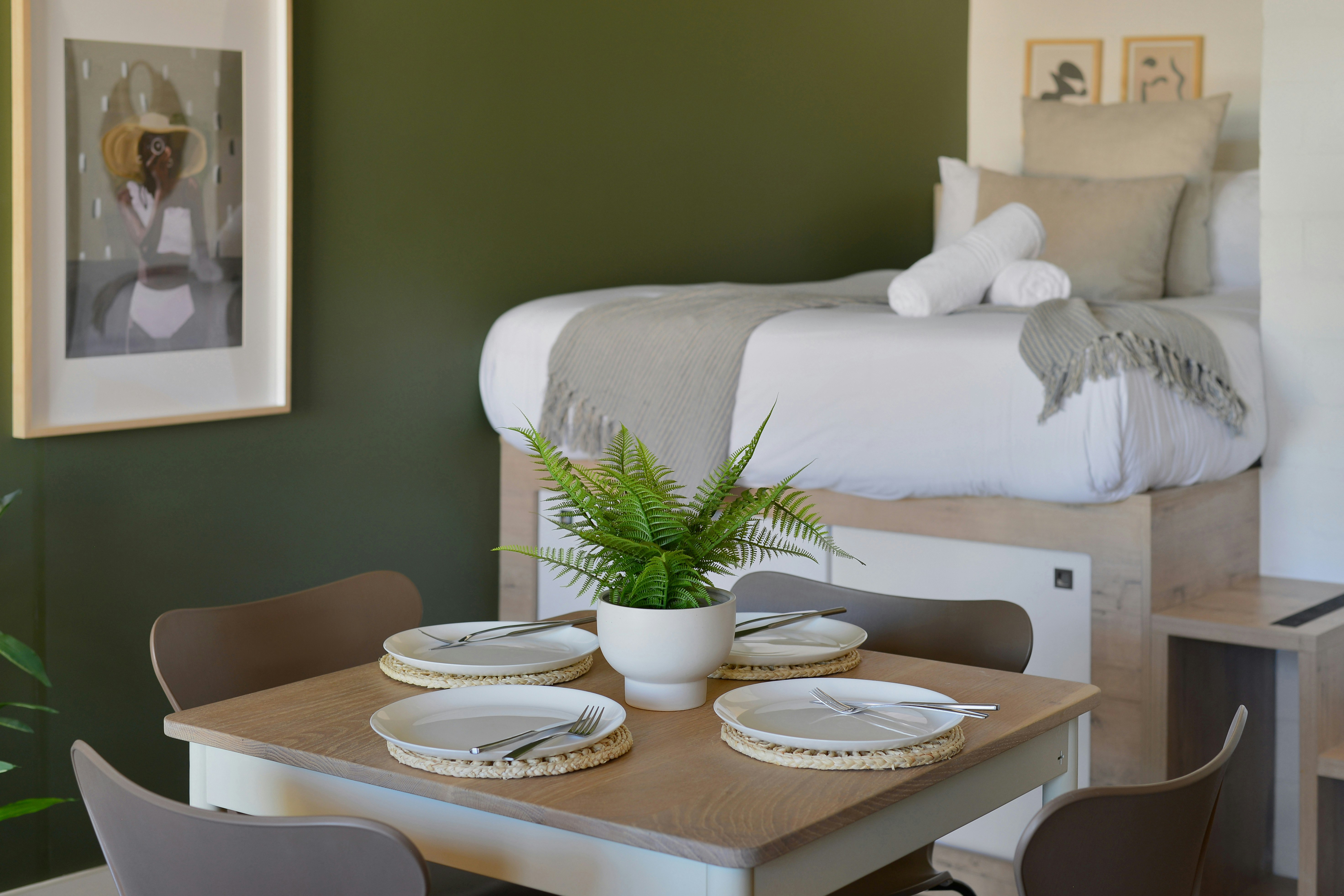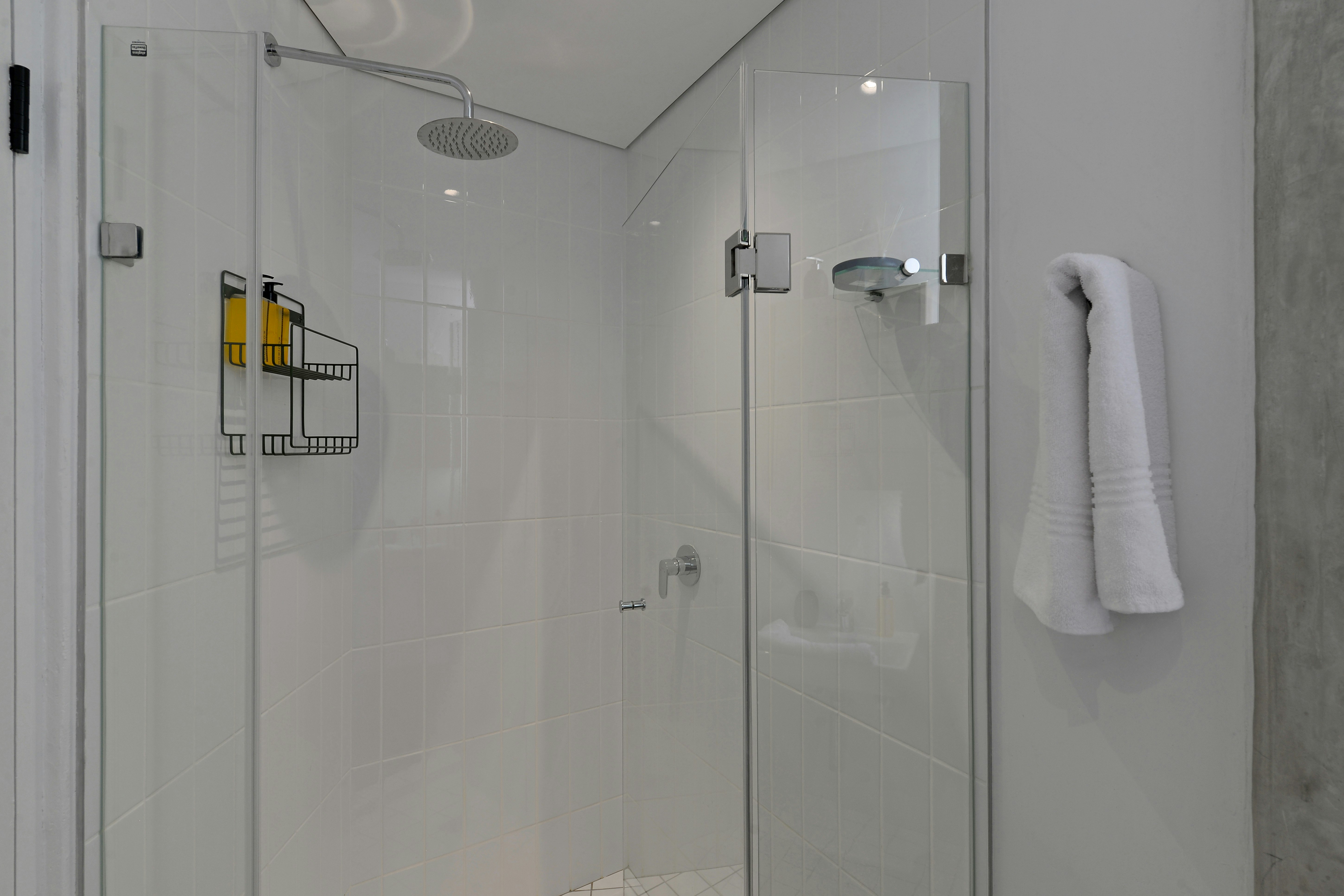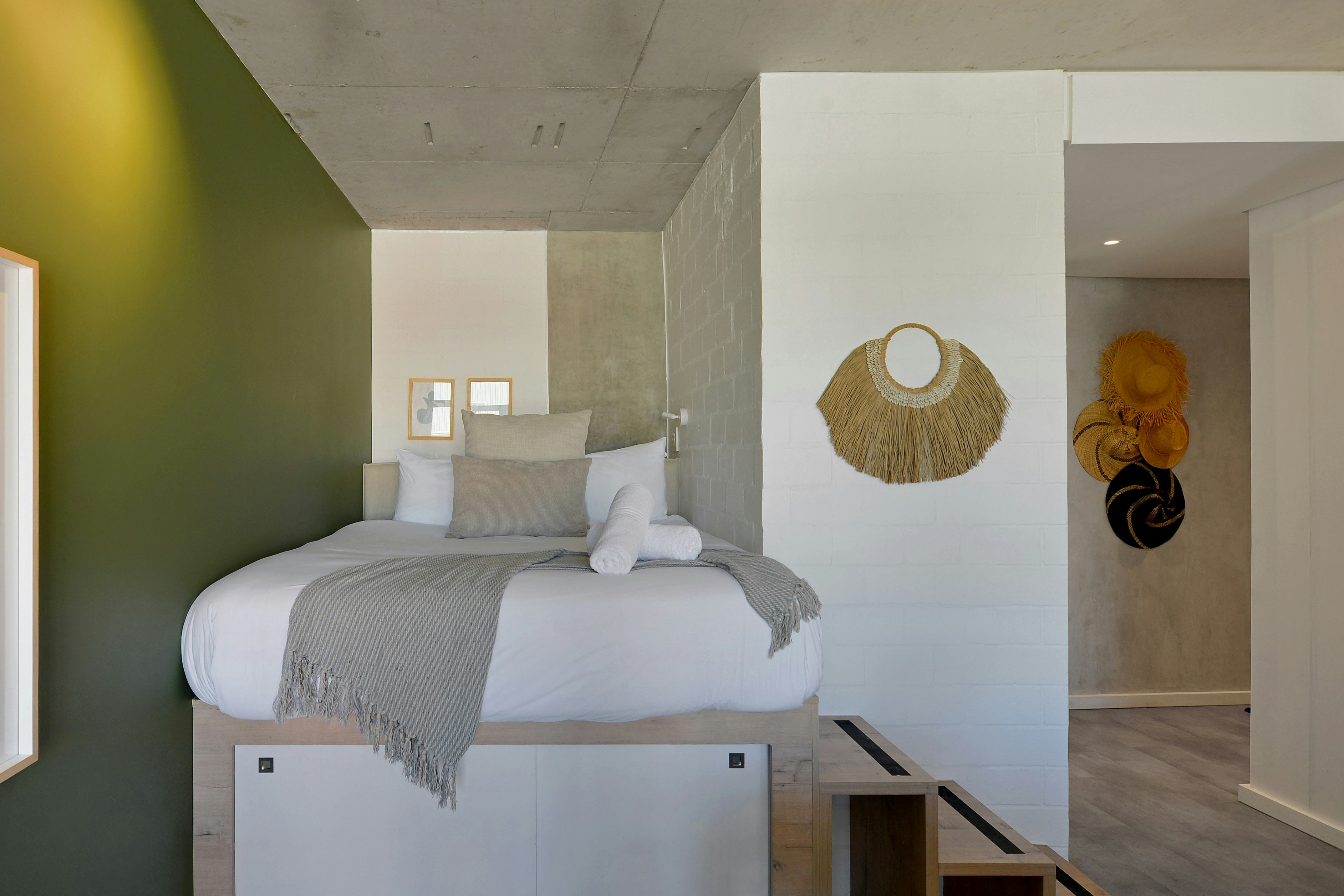 The living area opens onto a quaint balcony. Guests have access to a communal rooftop swimming pool with breathtaking panoramic views of Table Mountain, as well as workspaces, a gym, shared laundry facilities, and secure onsite parking.