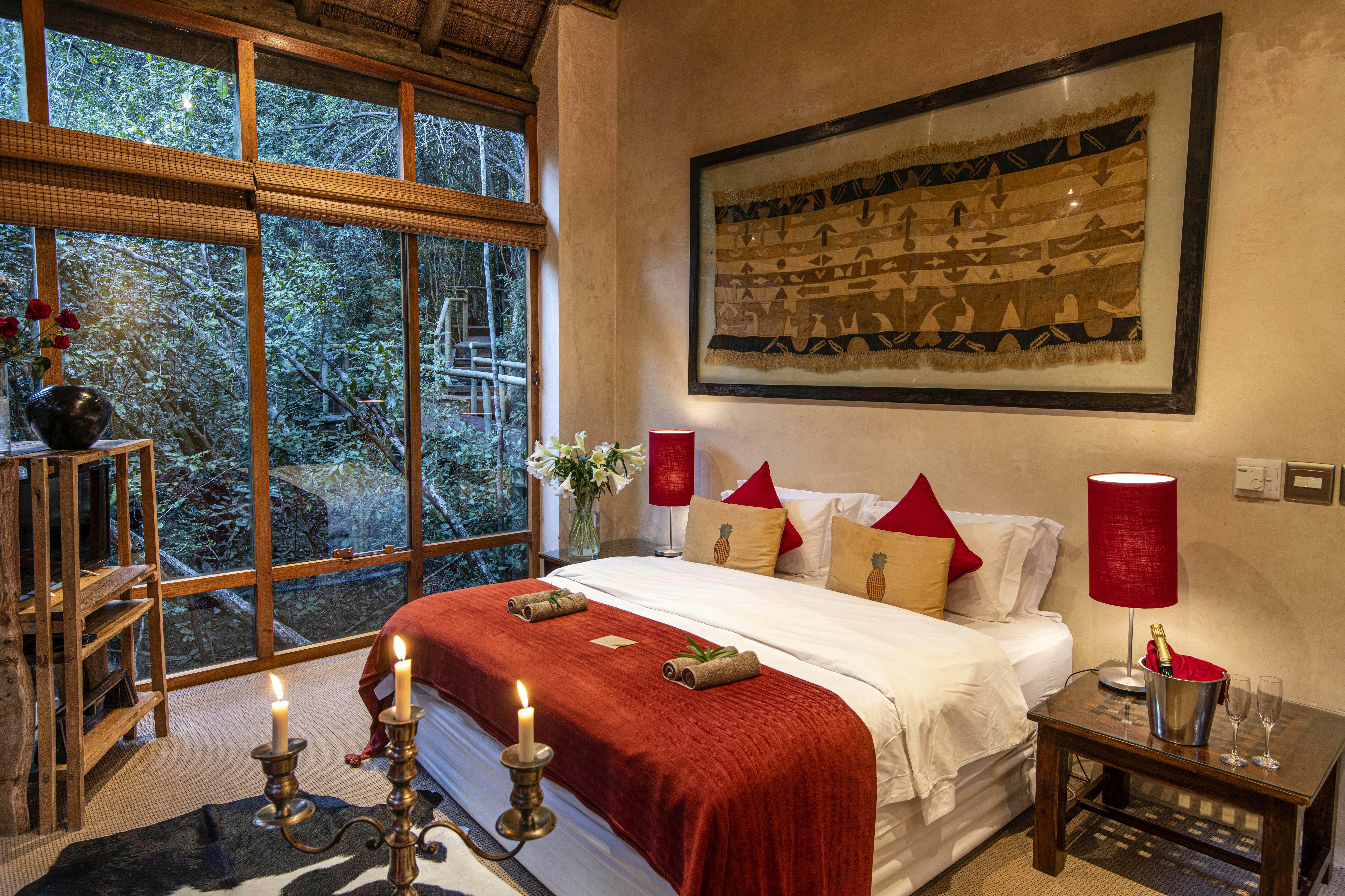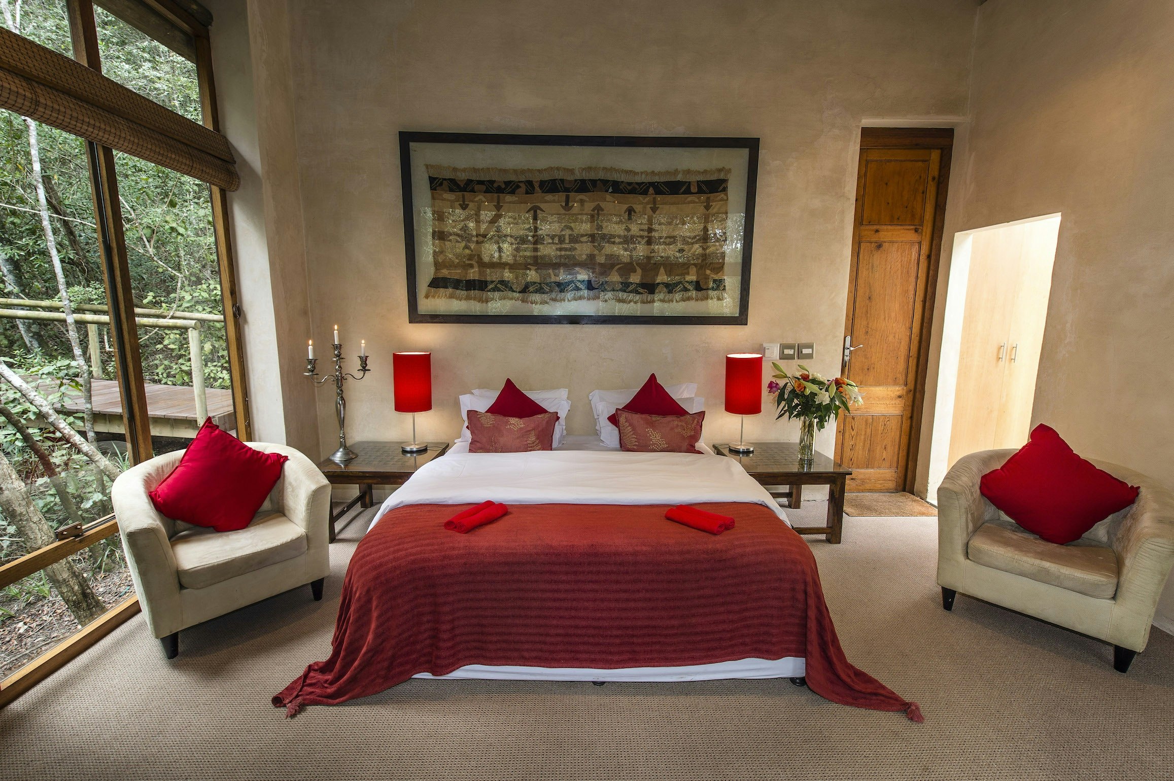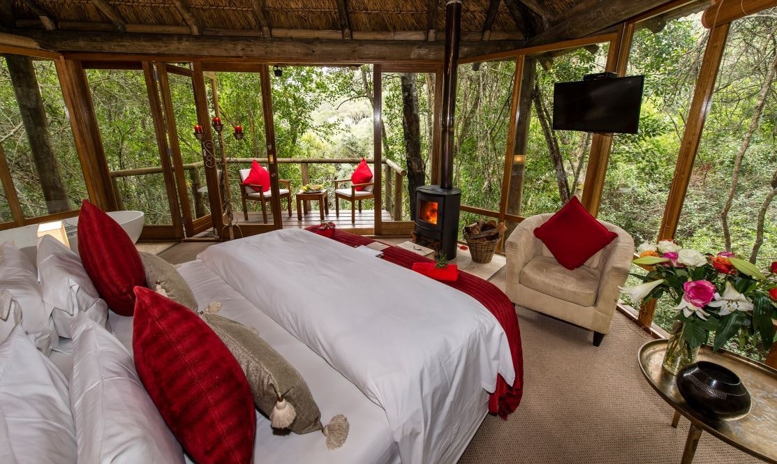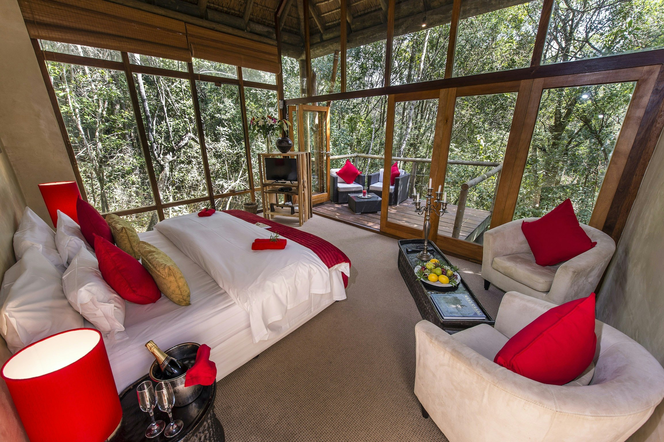 Accommodation comprises elegantly decorated suites that can accommodate 2 people each, making them ideal for couples. The suites are suspended in the treetops of a private forest reserve, and furnished with comfortable beds. The suites also have en-suite bathrooms, and bathroom amenities are provided. Each of the suites is equipped with an un-stocked mini-bar fridge, a TV with selected DStv channels, as well as tea- and coffee-making facilities, and some of the units open onto a private balcony that overlooks the forest.