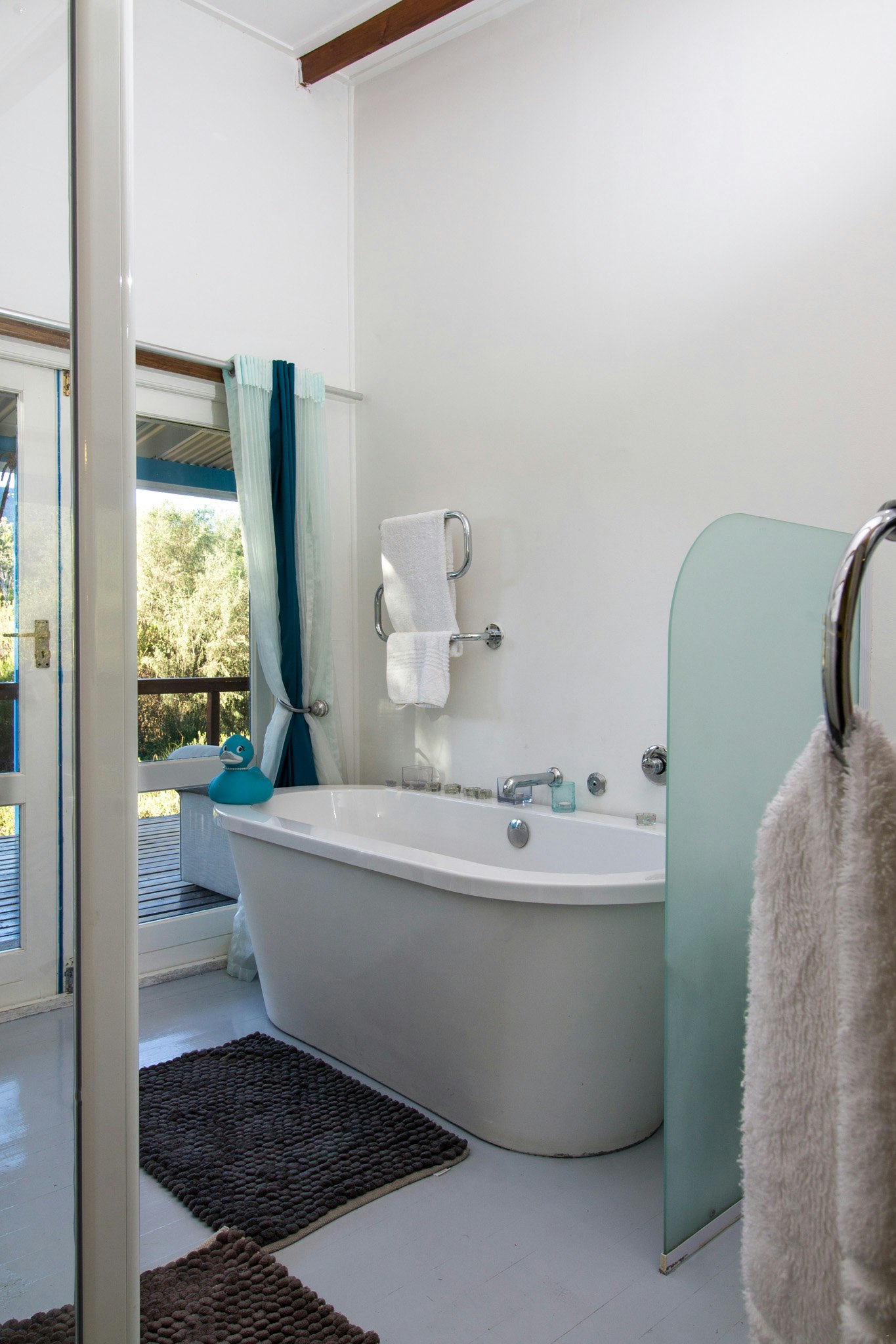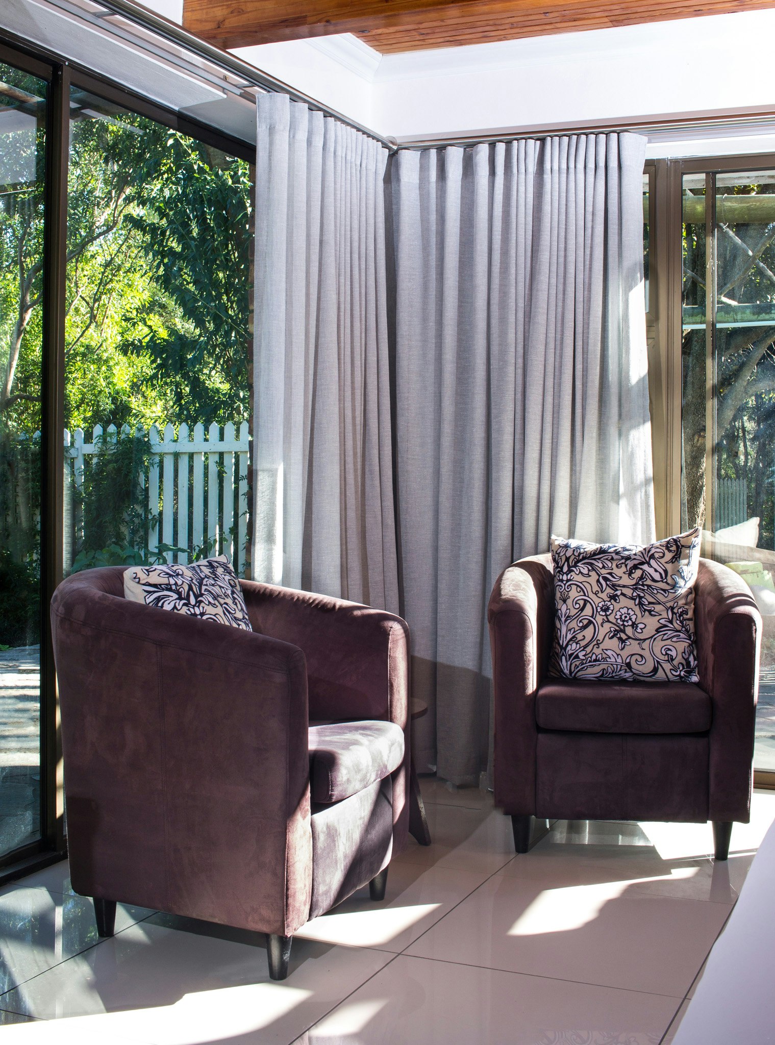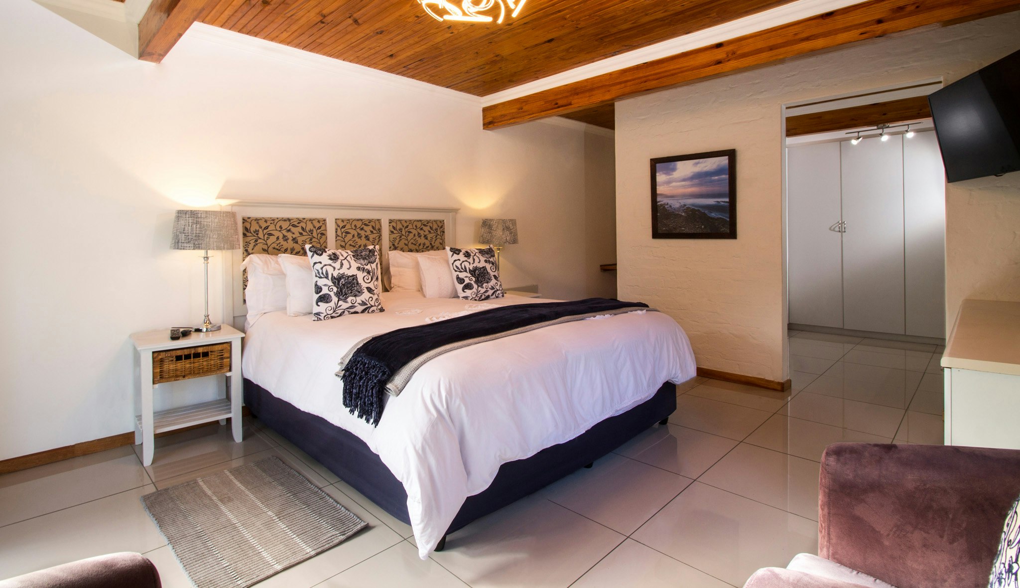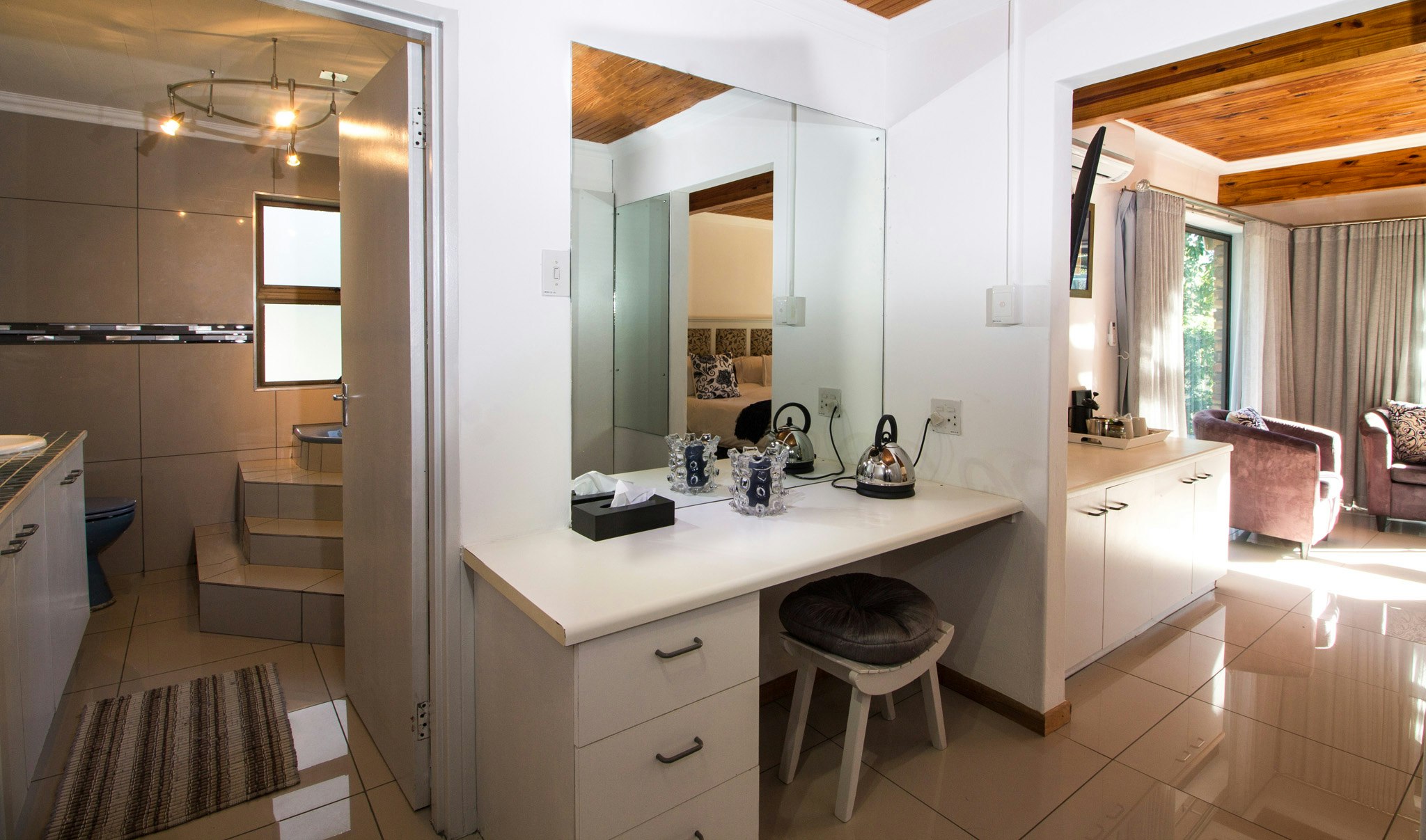 Verblyf bestaan uit ruim kamers, elkeen met lugversorging en en suite-badkamers. Gaste kan uitsien na lieflike uitsigte en privaat patios wat lei na die natuurlike tuine. Van die patio af het jy 'n uitsig oor die berg, woud en fynbos.
