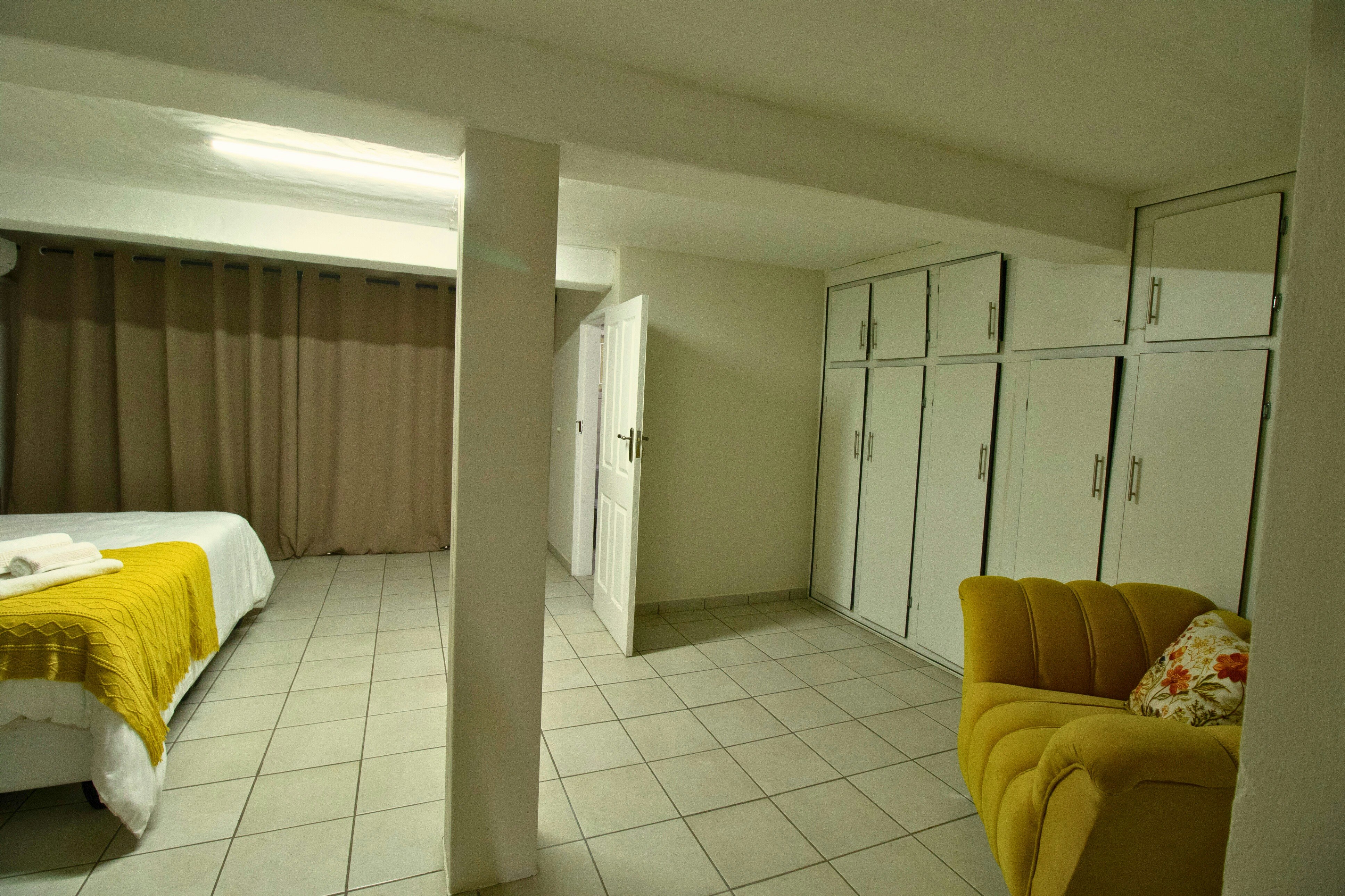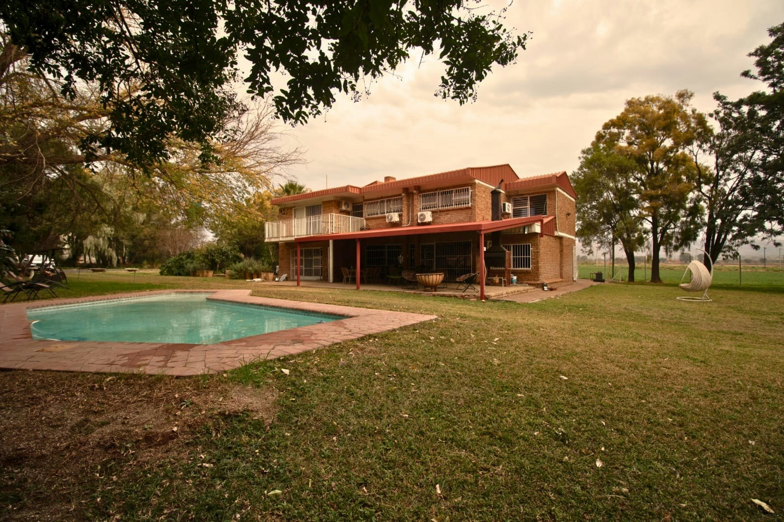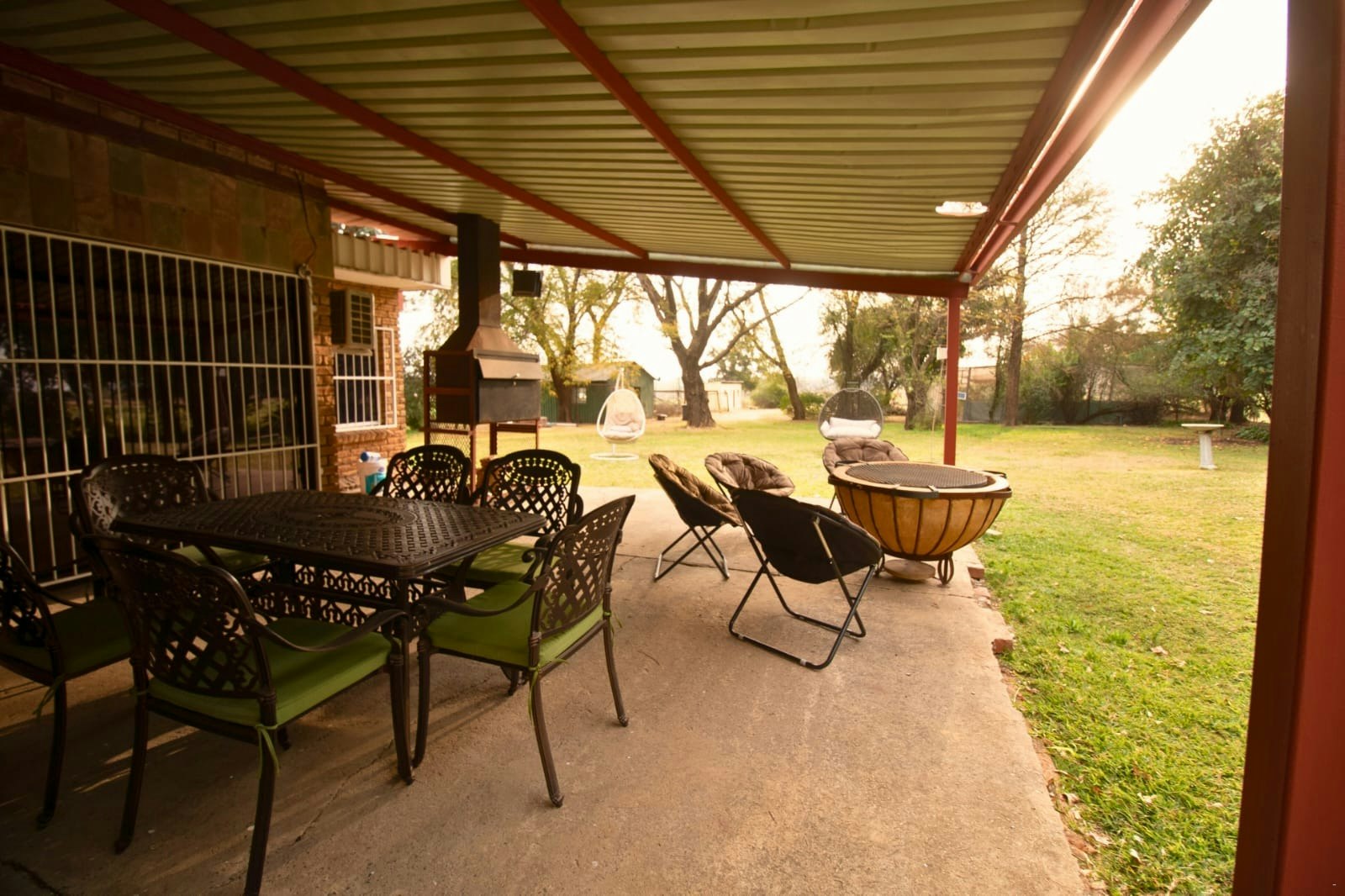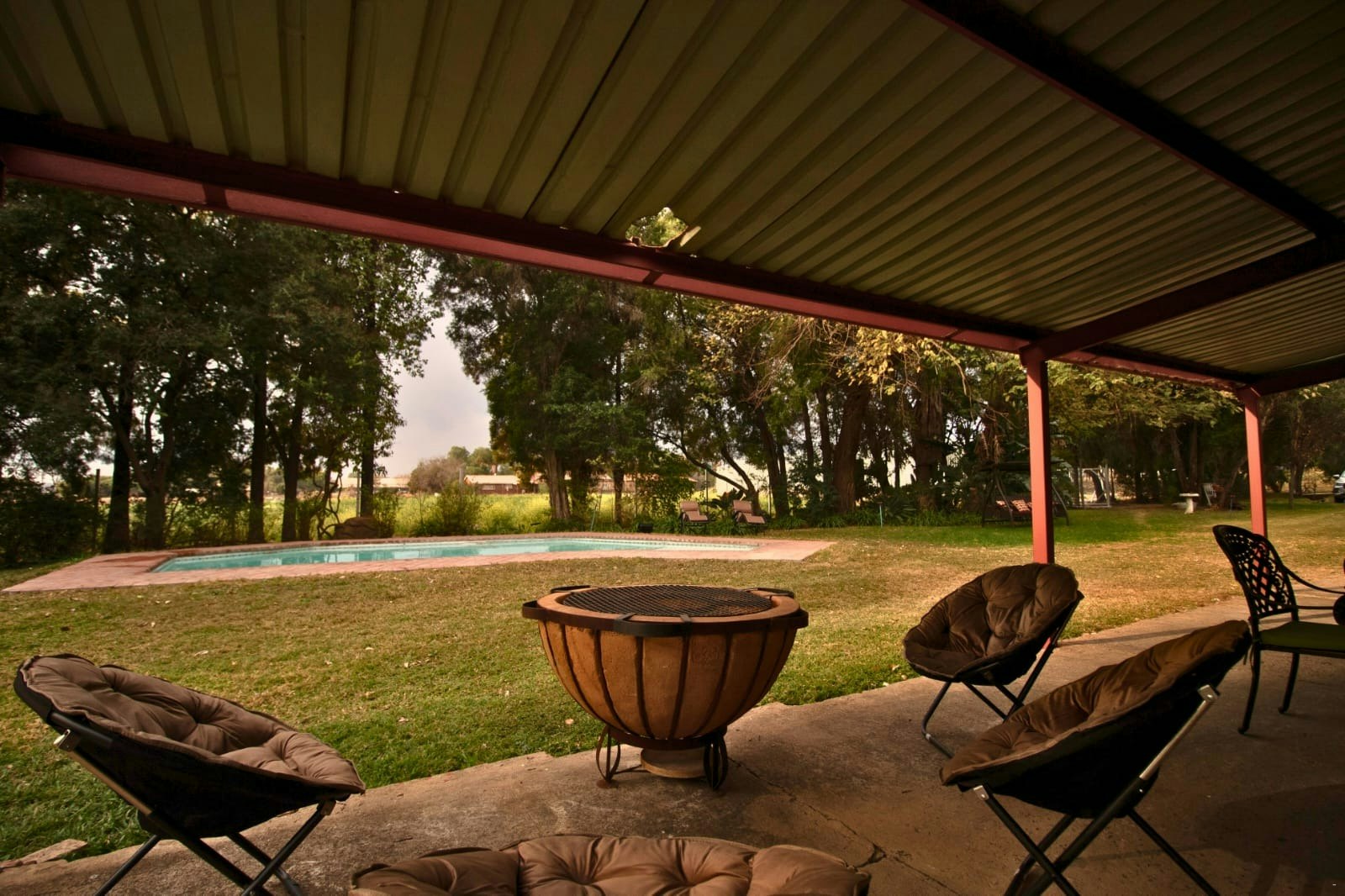 Gaste het toegang tot elegante gedeelde ruimtes, insluitend 'n volledig toegeruste eetarea, 'n knus TV-kamer met 'n slim-TV wat stromingsdienste bied, en 'n sitkamer met uitsig oor die swembad en tuine. Die buite-area beskik oor 'n oordekte patio, boma, braaigeriewe en 'n sprankelende swembad, wat die ideale omgewing bied om te ontspan en af te skakel.