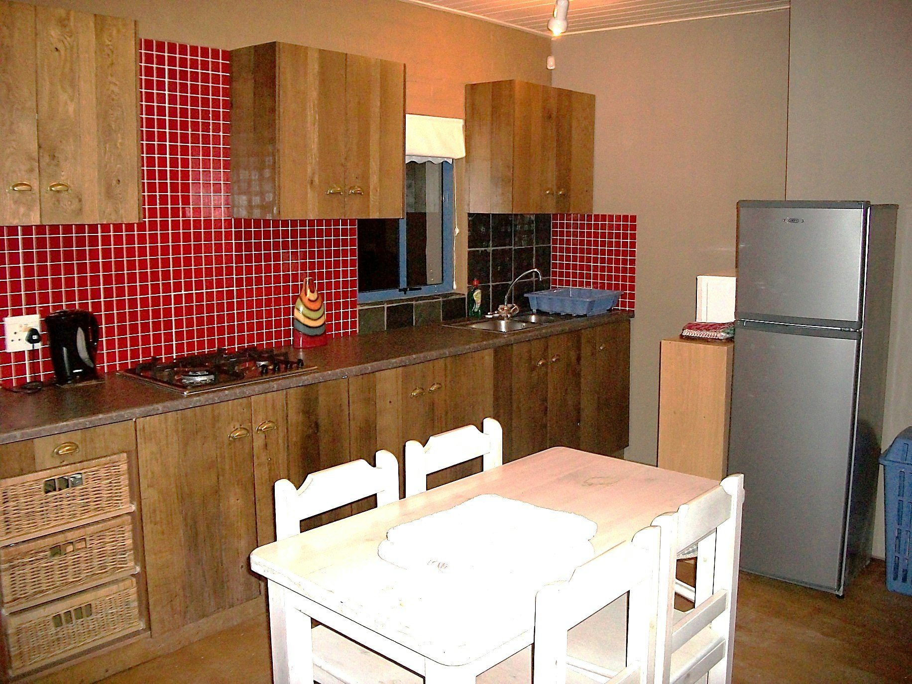 The kitchen is fully equipped for self-catering and contains a gas stovetop, fridge-freezer, kettle, toaster, microwave, and cutlery and crockery. There is also a dining table with seating space for 5 people. The lounge area has a lounge suite, a TV with Netflix from a fibre line and a built-in braai.