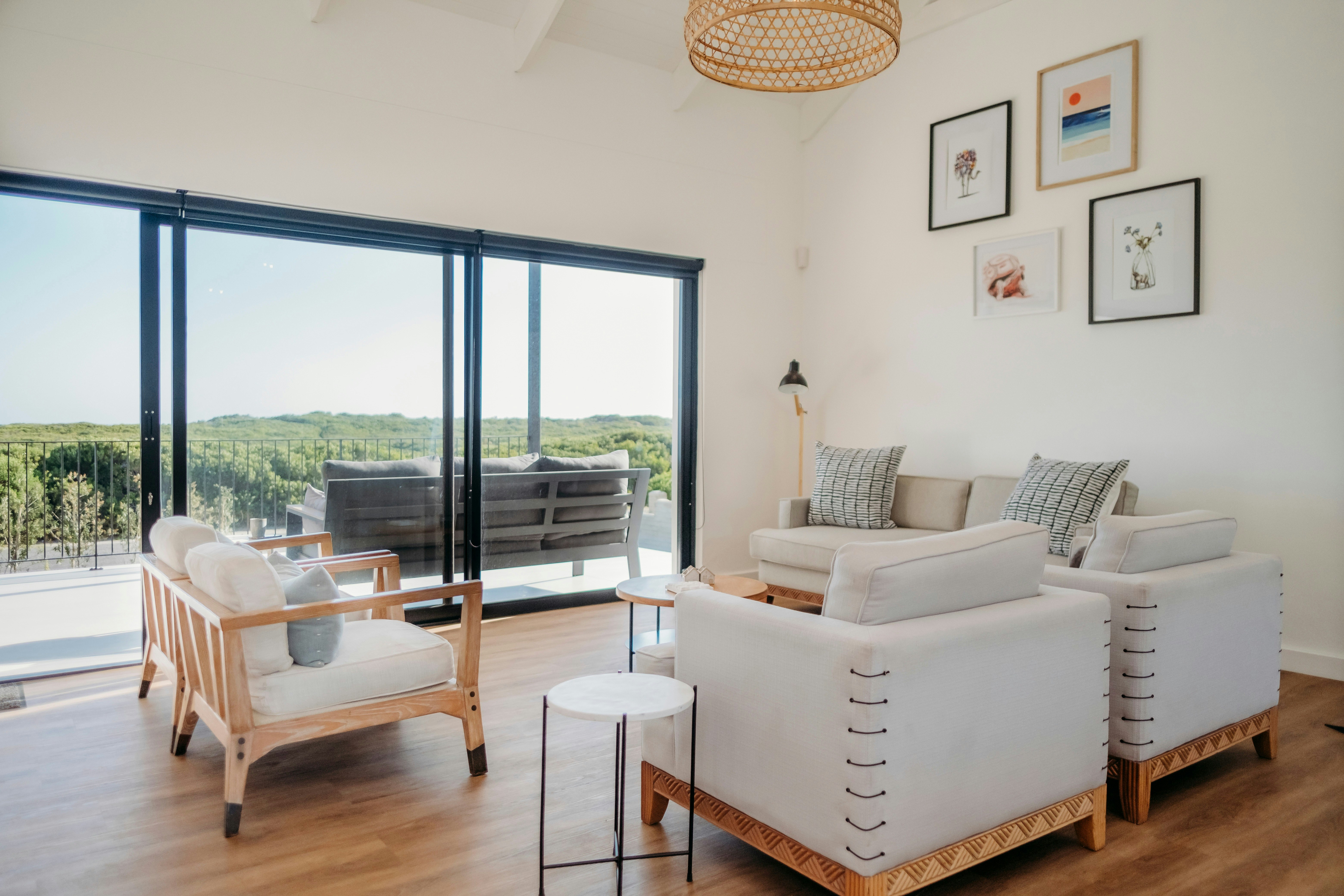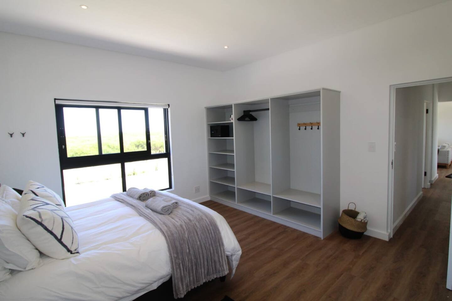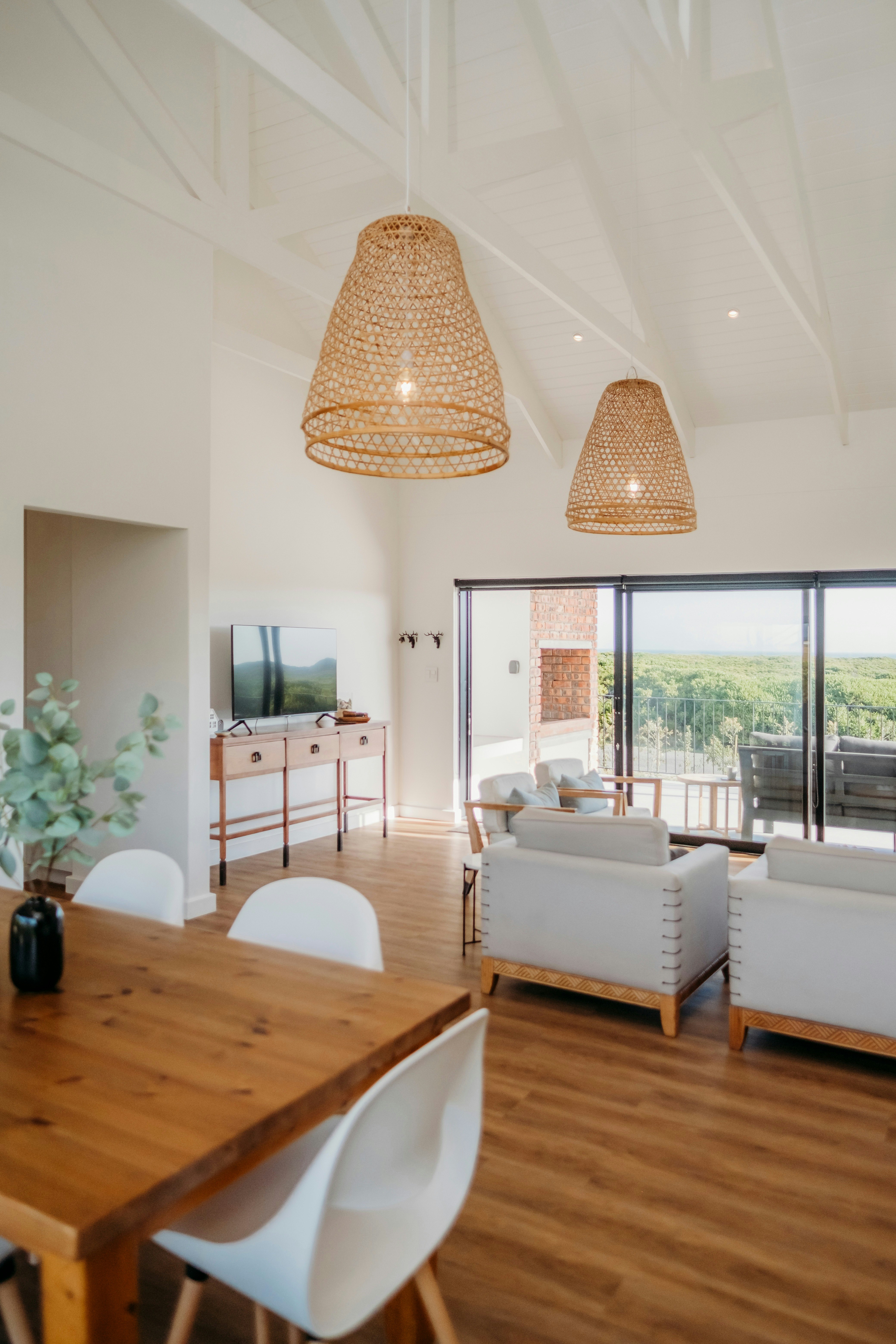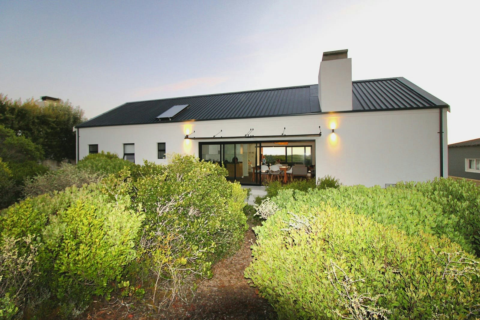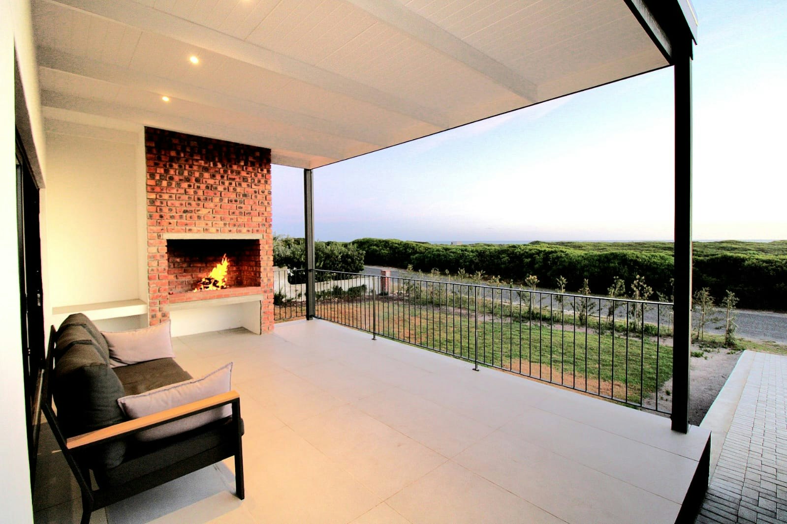 Additionally, this living space has an indoor braai which is great for winter nights. Through the large sliding doors is a covered patio with comfortable outdoor seating and a second built-in braai. This patio is a great spot for guests to relax with a sundowner while admiring the views of the wild fynbos and distant ocean.