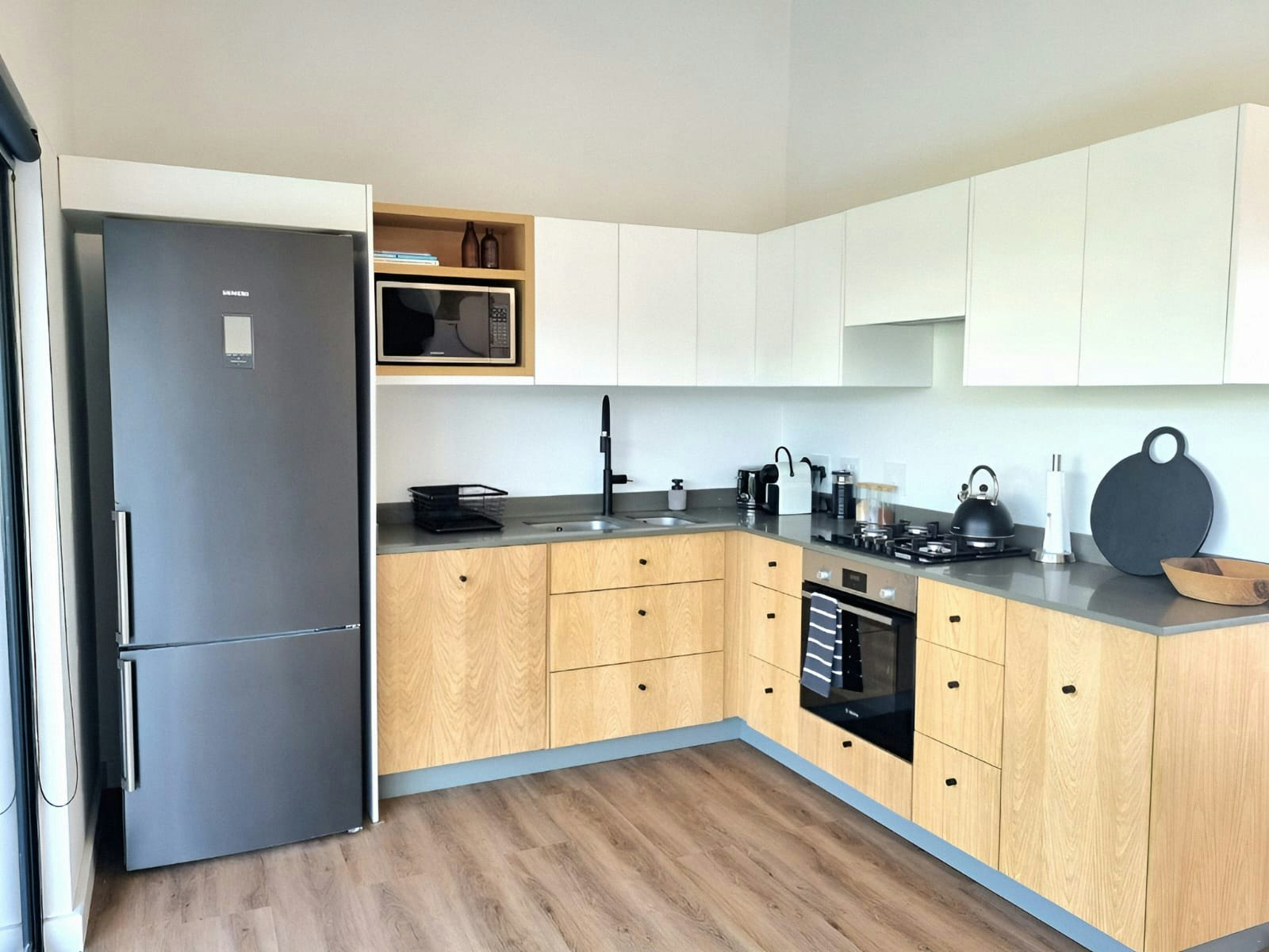The open-plan living area has lovely tall ceilings and a kitchen fully equipped with a gas stove, electric oven, microwave, dishwasher, fridge-freezer, cutlery and crockery as well as a plunger and Nespresso machine. Leading from the kitchen is a dining table where guests can enjoy their meals together. Adjacent to this dining space is a cosy lounge with comfy seating and a flat-screen Smart TV. Board games and complimentary Wi-Fi are available for extra entertainment.