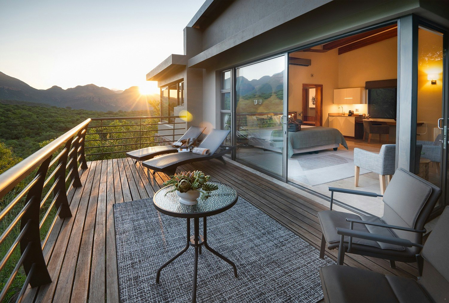 Wooden walkways lead to the 3 separate and spacious air-conditioned Mountain View Suites, positioned for privacy and dramatic Mountain views. The Mountain View Suites have been designed and constructed to embody the mountain with views of the watering hole and the décor echoes the simple tranquillity only nature can offer. At dusk, a sundowner can be enjoyed on your private deck while being entranced by the ever-changing colours of the sky and the mood of the magnificent mountain as the sun slips into the time slot of tomorrow.