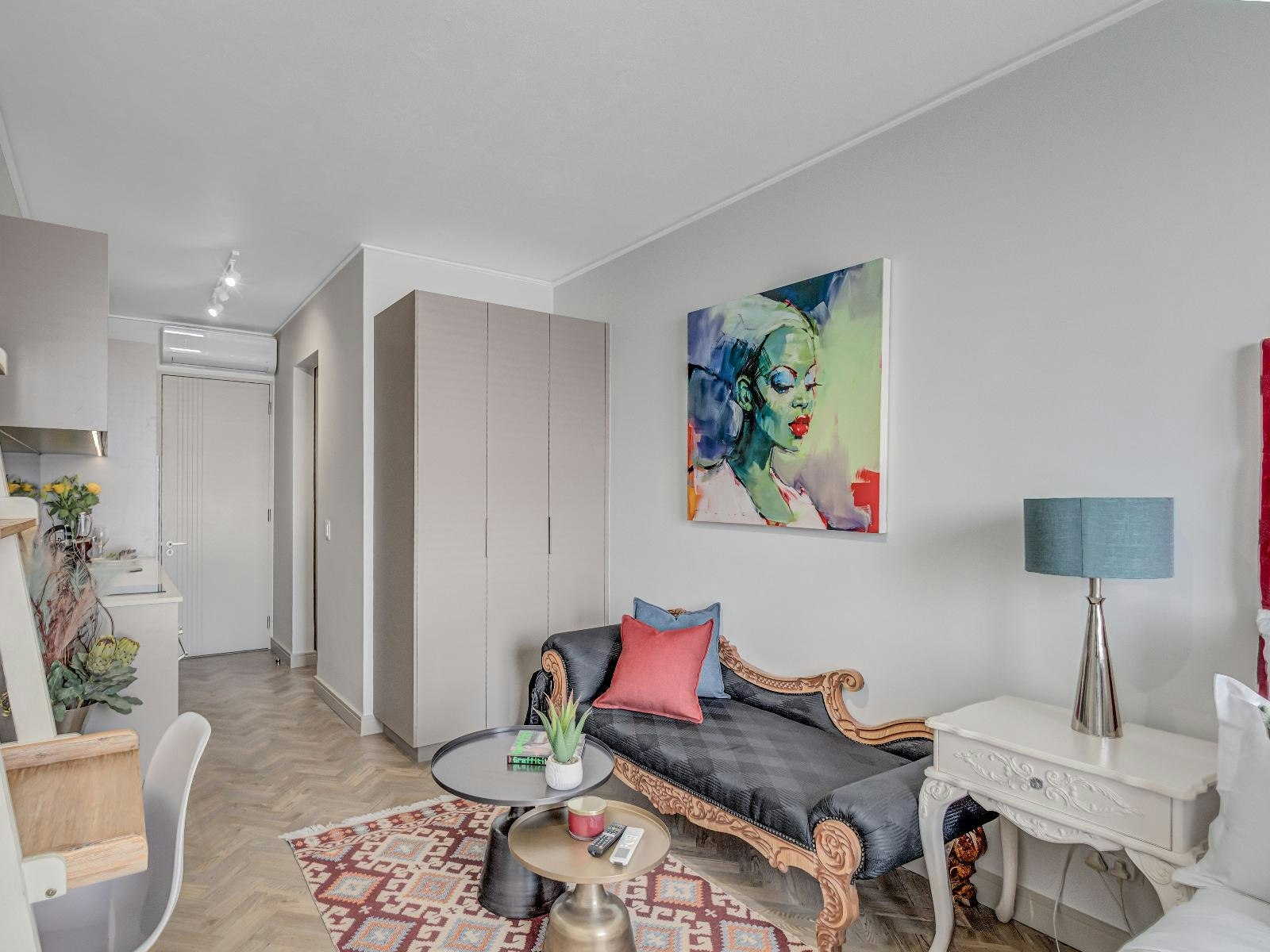 The open-plan apartment is furnished with a double bed, and the bathroom is fitted with a shower, toilet, and basin.