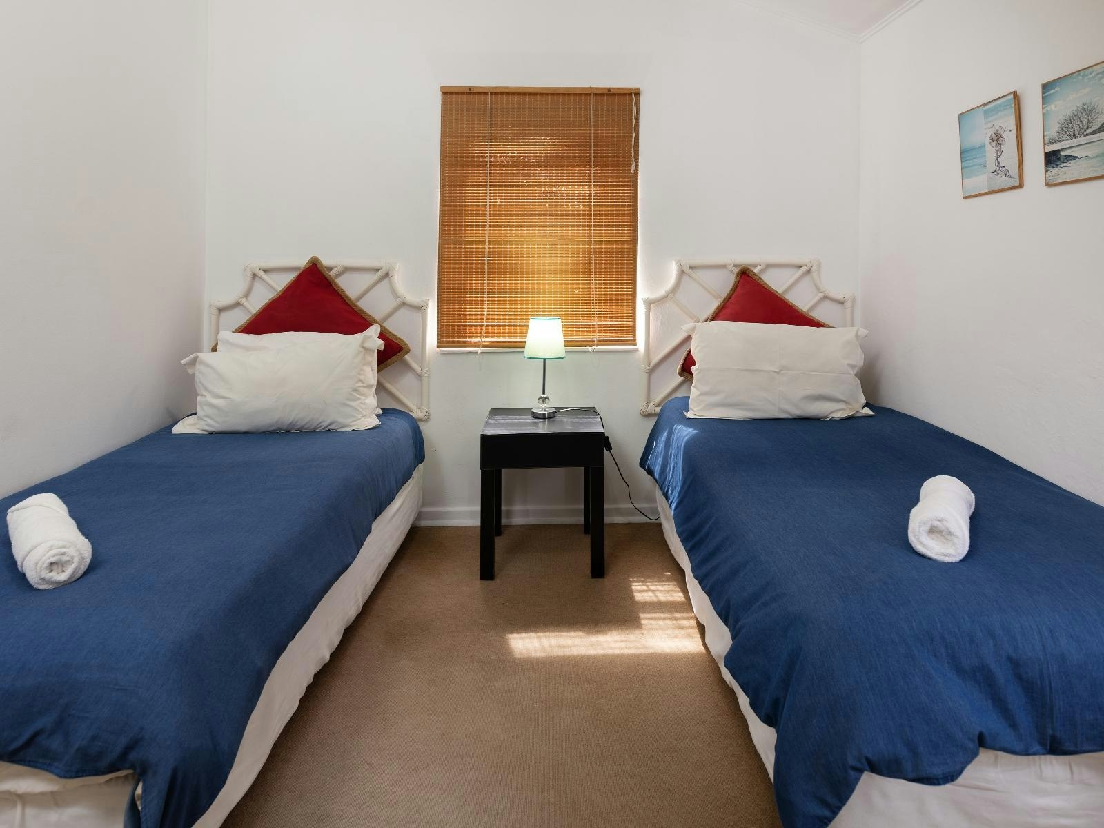 Dié woonstel bied slaapplek aan tot 6 gaste en beskik oor 3 slaapkamers en 2 badkamers. Die hoofslaapkamer is ingerig met 'n koninggrootte-bed wat maklik in twee enkelbeddens omskep kan word, terwyl die tweede slaapkamer twee enkelbeddens het. Hierdie slaapkamers deel 'n badkamer met 'n bad, wasbak en toilet. Die derde slaapkamer het 'n stapelbed en 'n en suite-badkamer met 'n stort, wasbak en toilet. Alle linne en badhanddoeke word voorsien; gaste moet egter hul eie strandhanddoeke saambring.