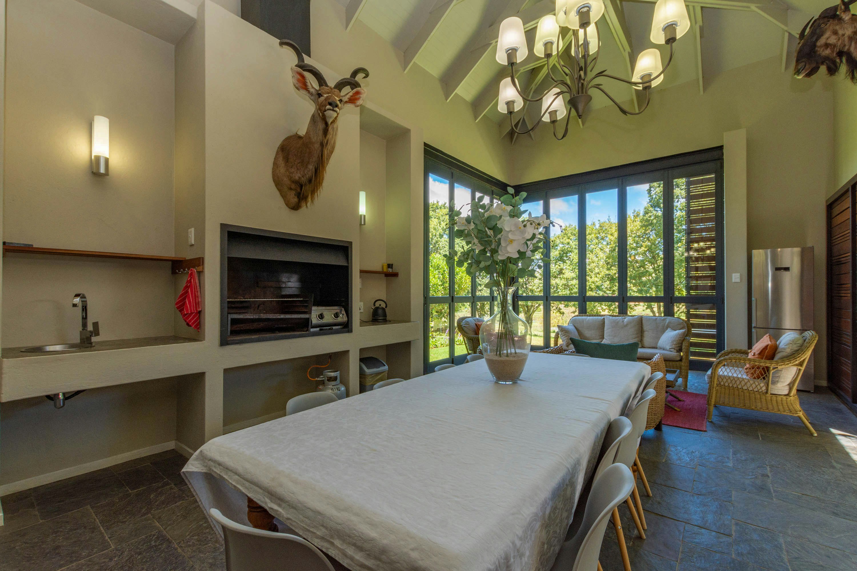 The kitchen is equipped with a fridge, 6-plate gas stove, oven, microwave, and dishwasher. Additional facilities include a TV, braai area, DStv, washing machine, tumble dryer and parking in the garage.
