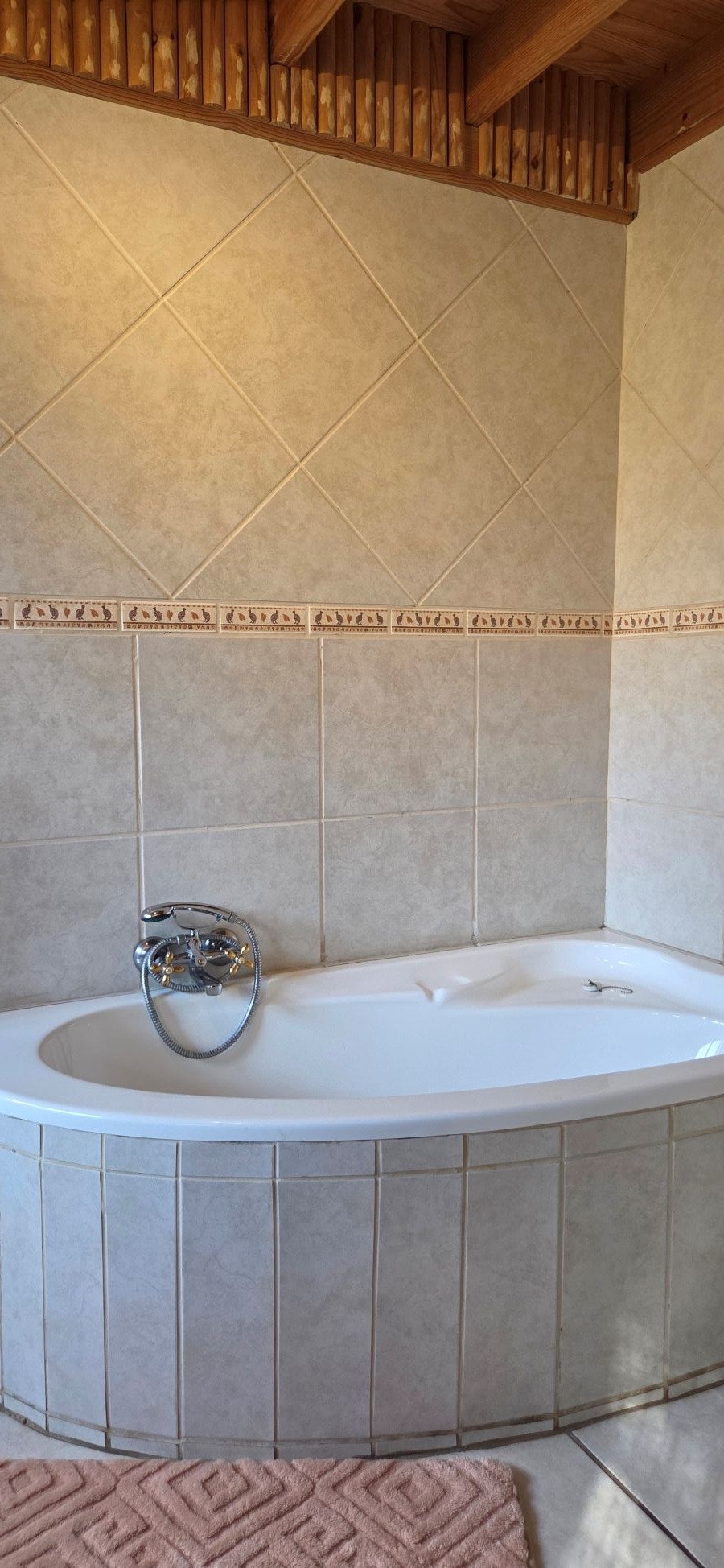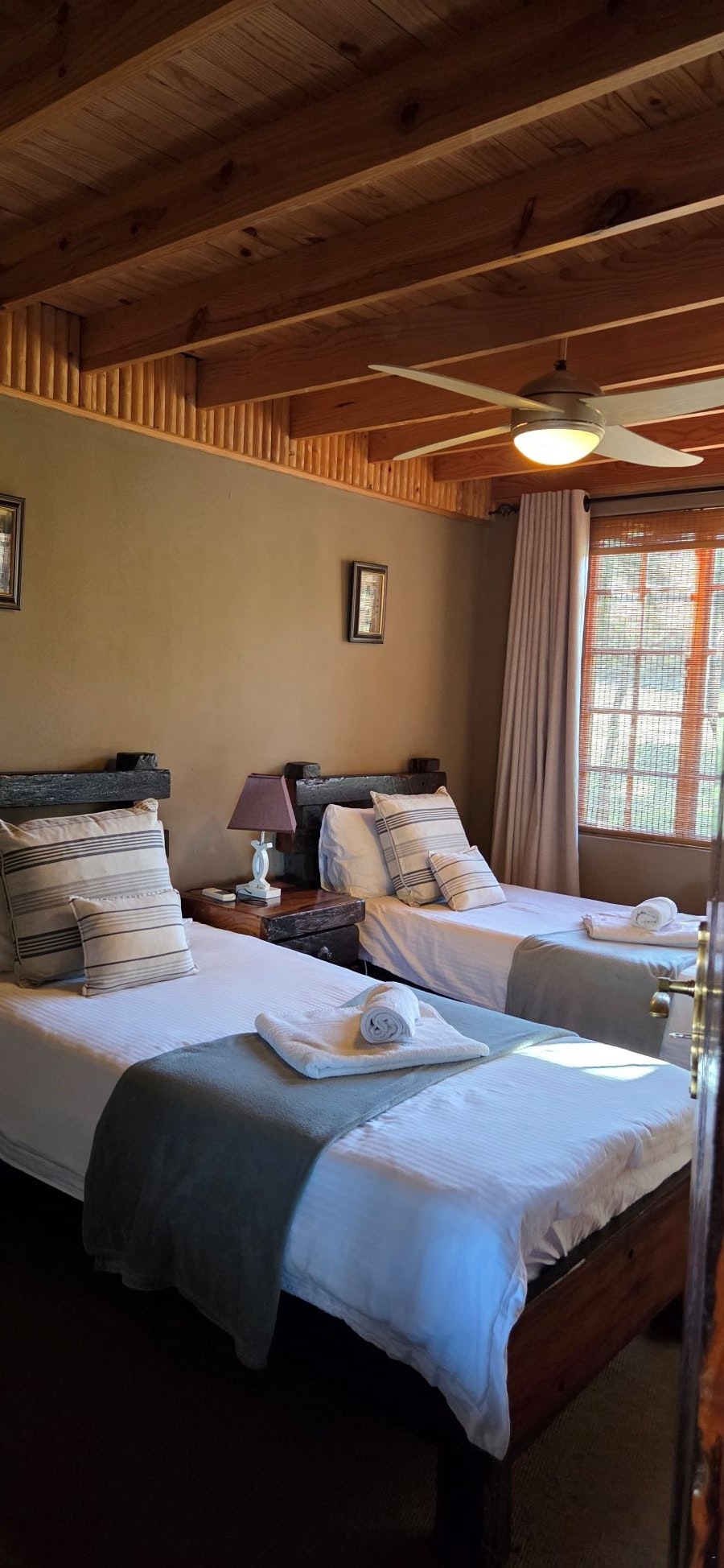 The lodge can accommodate up to 10 guests and comprises 4 bedrooms and 3 bathrooms. The upper floor contains 1 double bed and 2 single beds, while separate from the lodge a luxury room by the swimming pool offers 2 single beds and 2 bathrooms. Room 1 contains 2 single beds, and Room 2 has 1 double bed. A shared bathroom designed with families in mind can be locked separately for each room. Room 3 includes 2 single beds with an en-suite bathroom fitted with a bathtub. Room 4, the Honeymoon Suite, has 1 double bed with a bathroom containing both a bathtub and a shower. Room 5, the Rondavel de Luxe, contains 2 single beds and features 2 bathrooms with showers, a private kitchen, a bar, a seating area, and panoramic views of nature and the swimming pool.