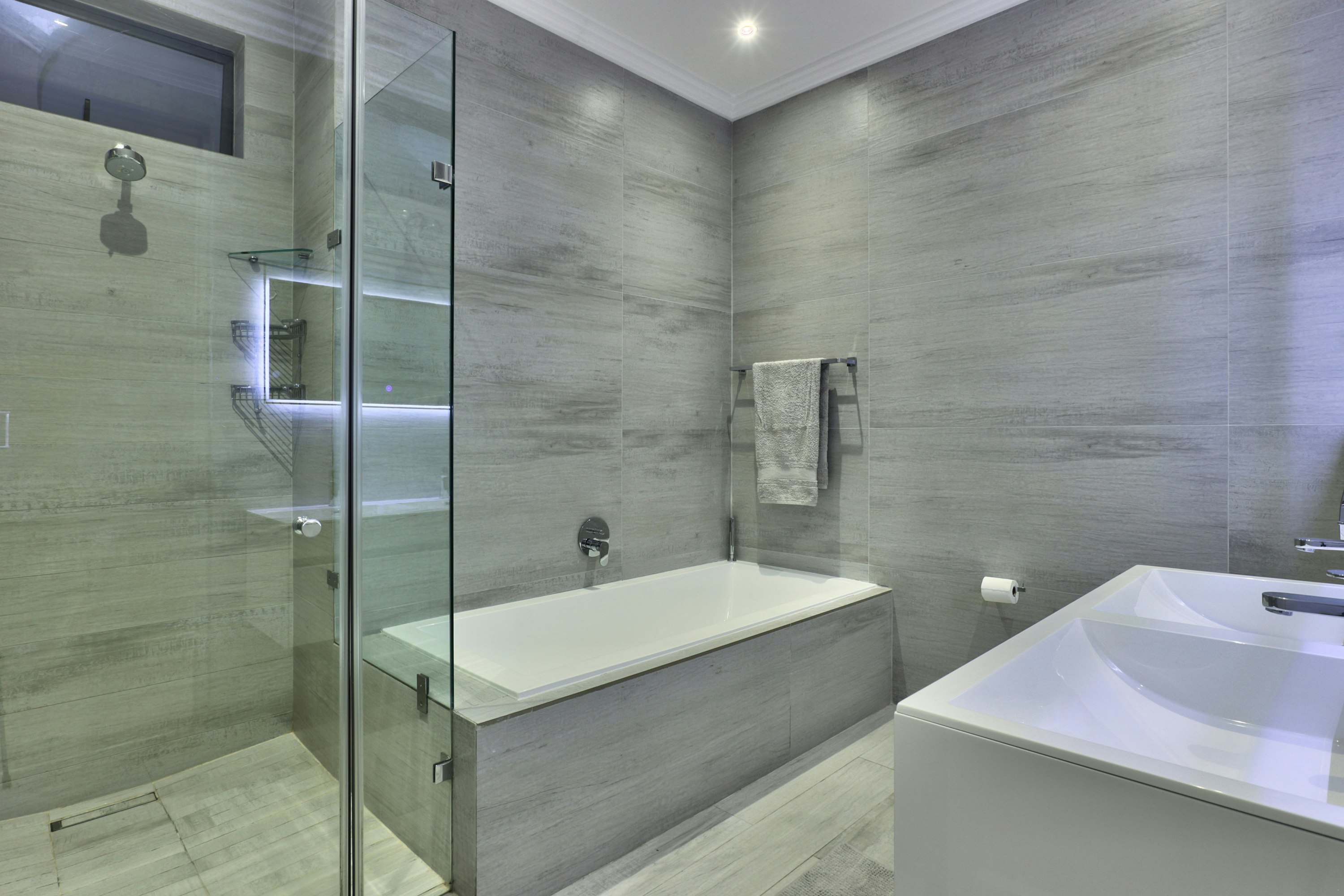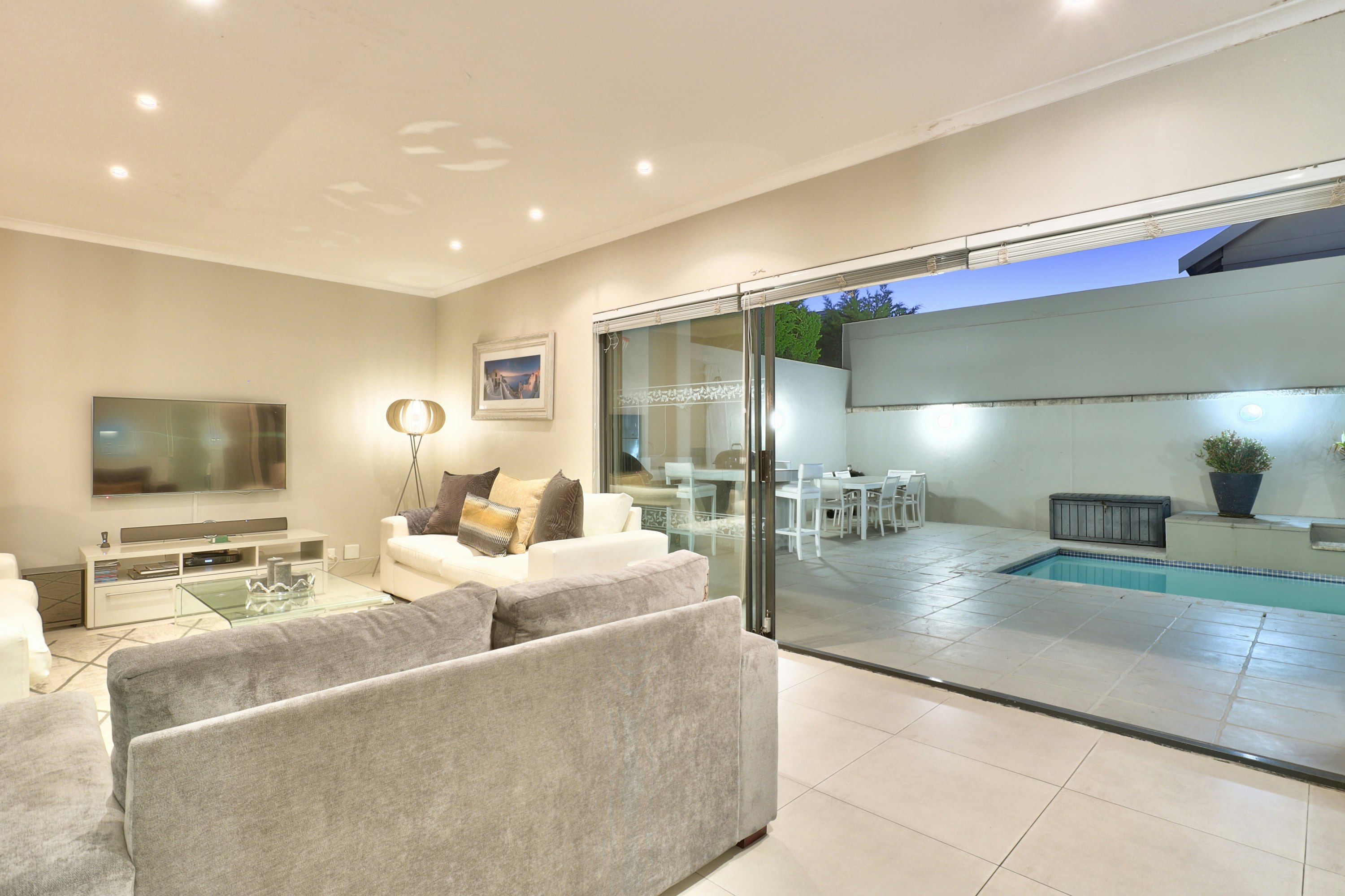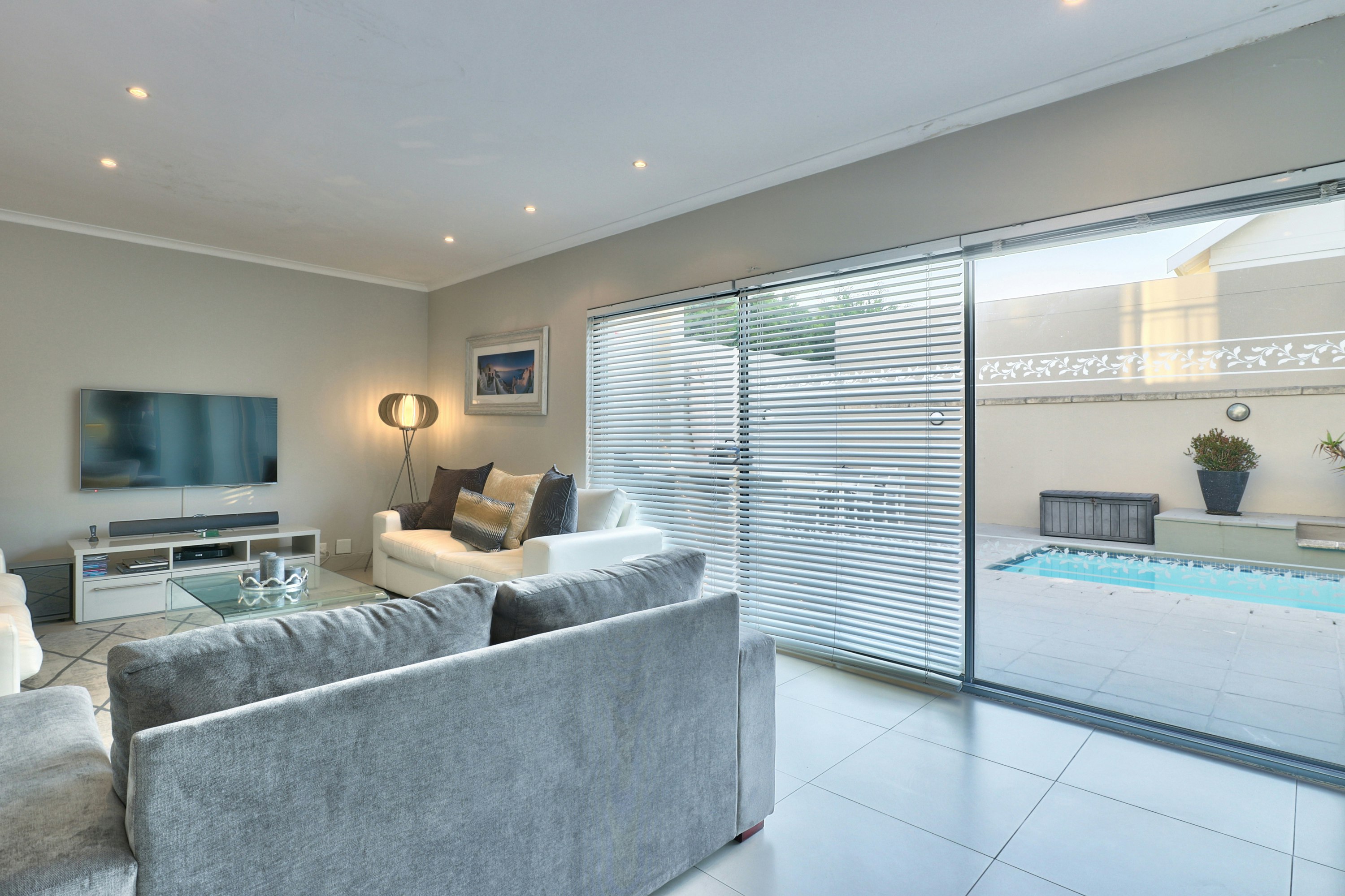 The living area opens onto the back garden which has a heated swimming pool, as well as a sheltered built-in braai, gas braai and Weber braai. Please note the swimming pool is not fenced or covered and is not ideal for children who can't swim; children need to be supervised at all times. A golf cart and safe parking is available.