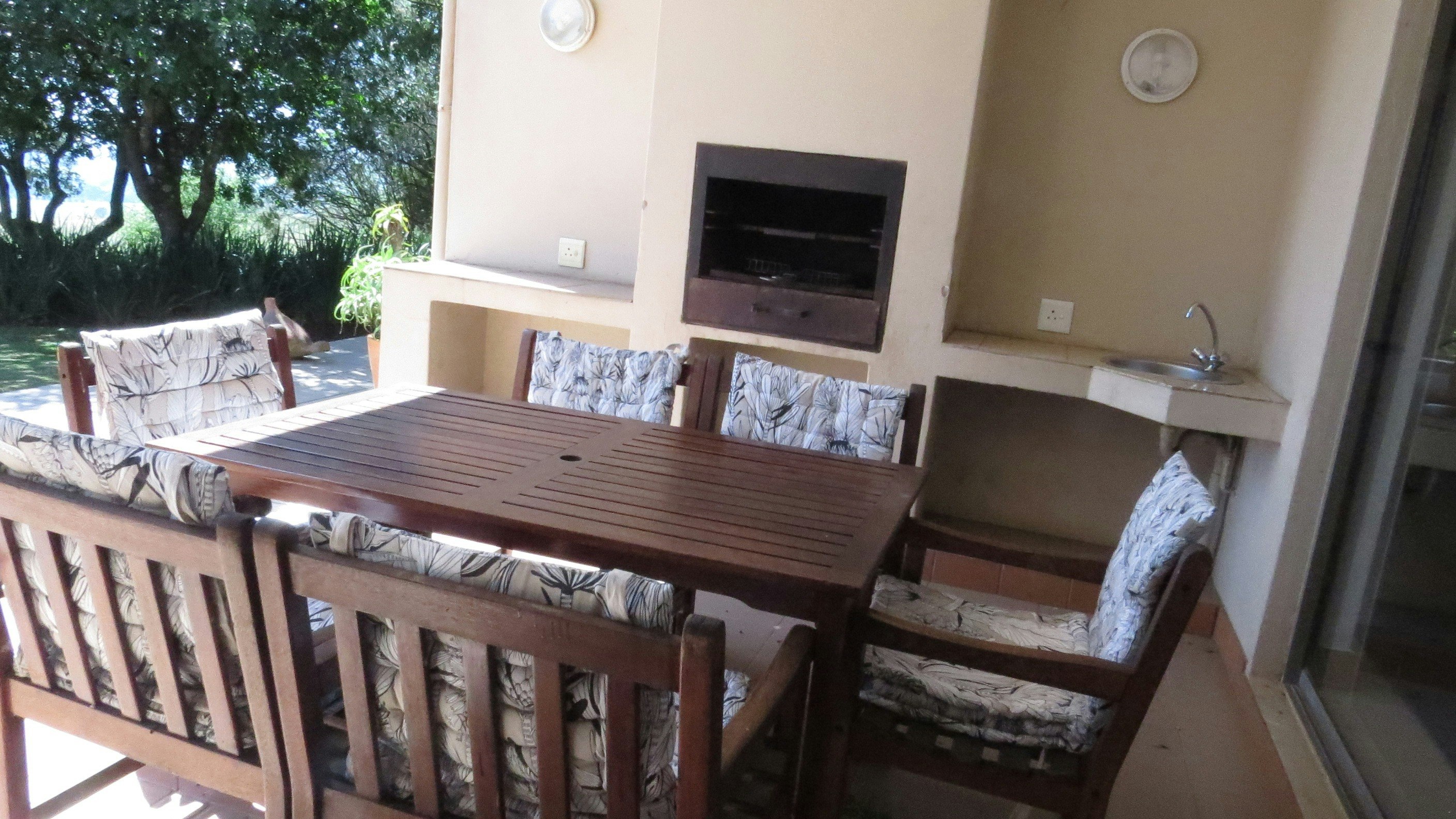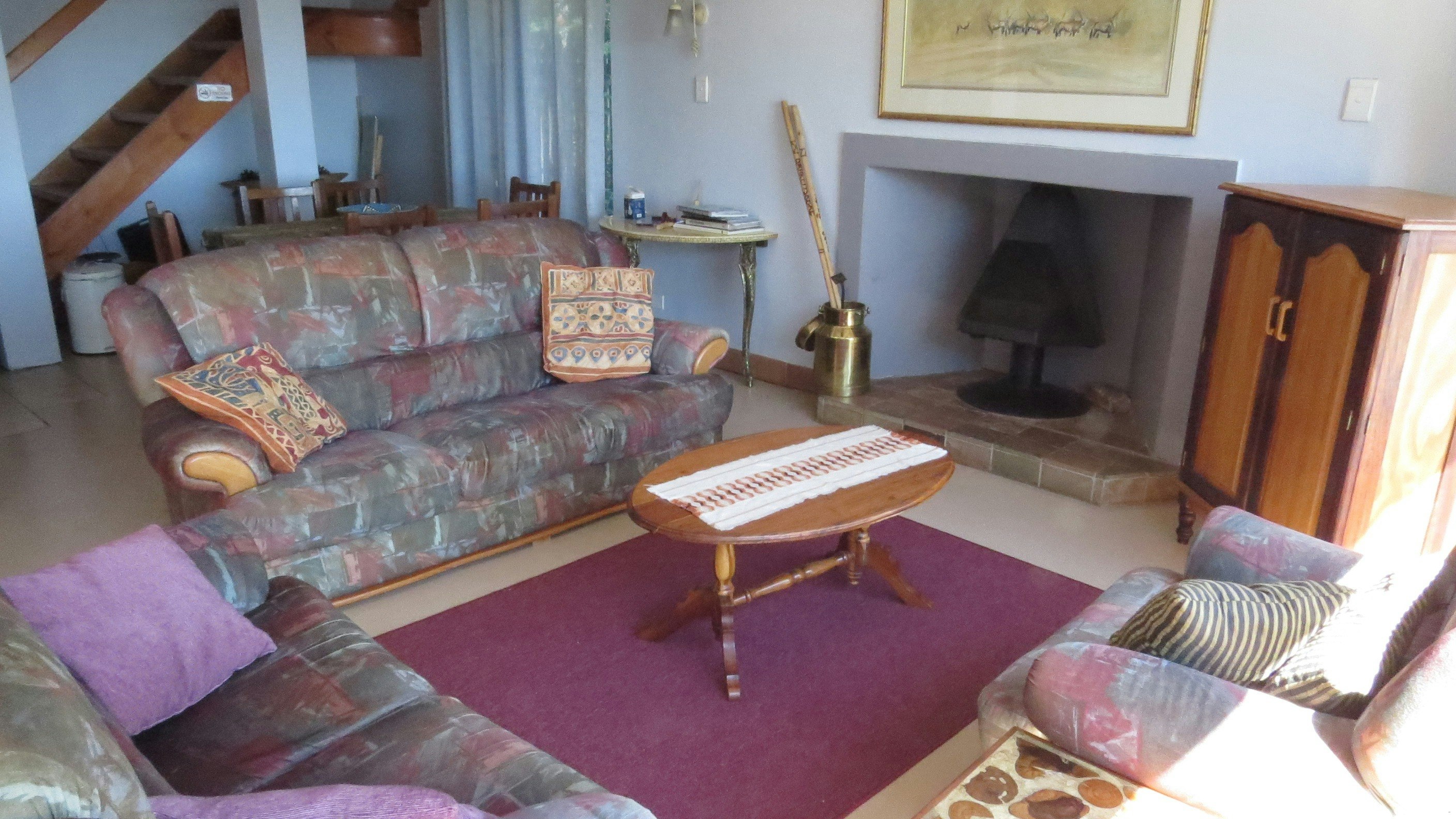 The open-plan living area features comfortable seating, a TV connected to a DVD player, a cosy fireplace for cold evenings, a dining table, and a kitchen. The kitchen is well-equipped with a fridge-freezer, stove, oven, microwave, and coffee- and tea-making facilities. Outside, guests can relax on a patio with outdoor dining and braai facilities available. Secure parking is provided on-site.