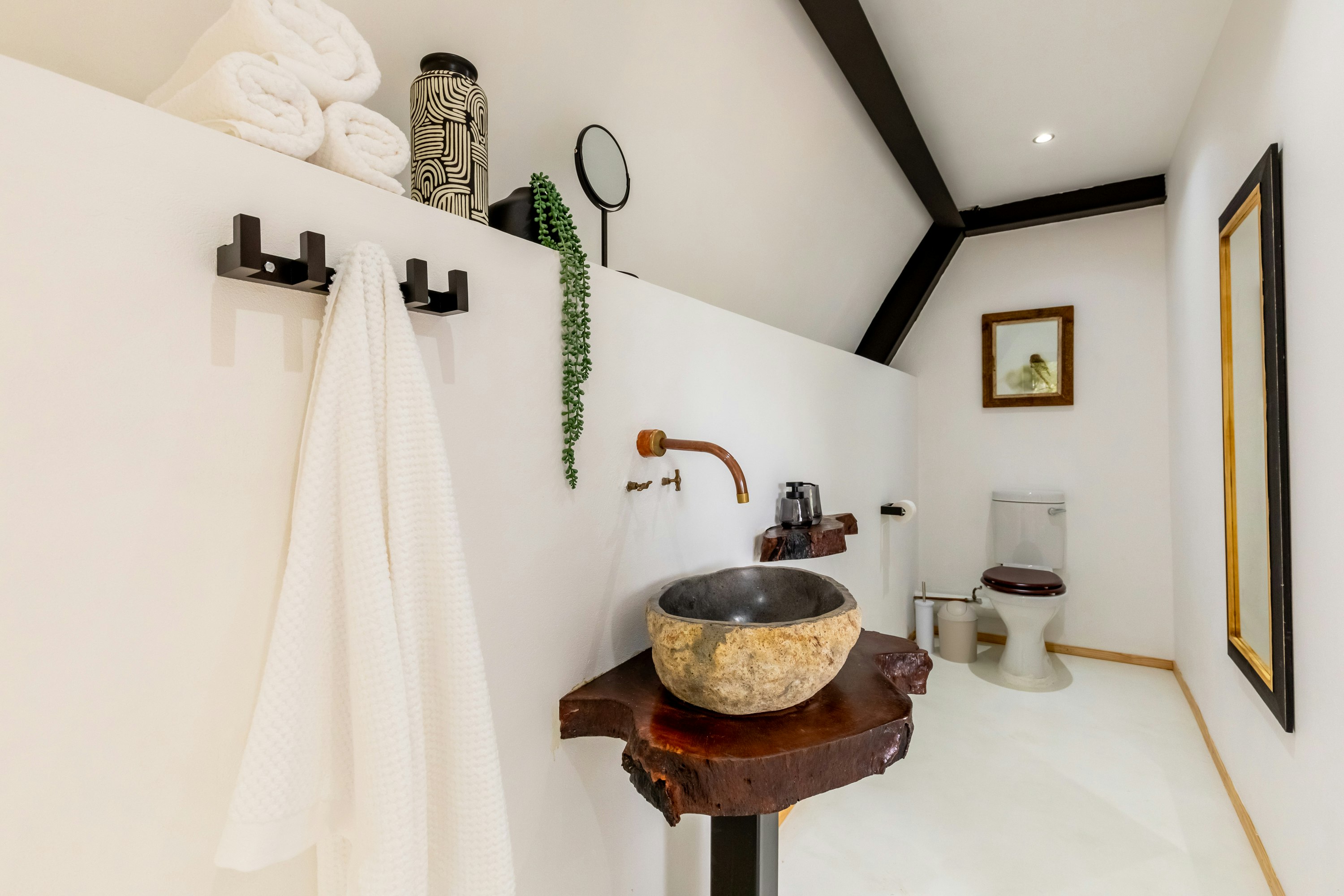 This home comprises 2 bedrooms and 2 bathrooms, accommodating up to 4 guests. The first bedroom, situated on the ground floor, is furnished with a double bed and has an en-suite bathroom fitted with a shower, as well as an outdoor shower. The second bedroom, located on the first floor, is furnished with 2 single beds and has an en-suite bathroom fitted with a shower.