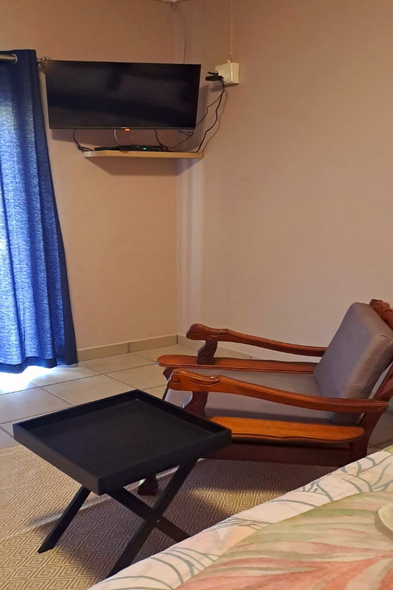 Disappointingly unfriendly, but neat in unit. Room was very neat, but for a self-service unit it was poorly equipped. Only a frying pan, microwave, fridge and kettle (with cutlery and crockery) in unit. No bakkie to use in microwave, scoops or bowl to put e.g. braai meat in. No egg tray or braai facilities under roof/roof (it was broken and due to broken bakkie we wanted/had to braai in the rain with great difficulty. Place does not look at all like in photos. Hostess did not even bring key herself or unlock unit with us. No clear directions to reception/office inside per seal. Located on plot next to bushes. Not much security.