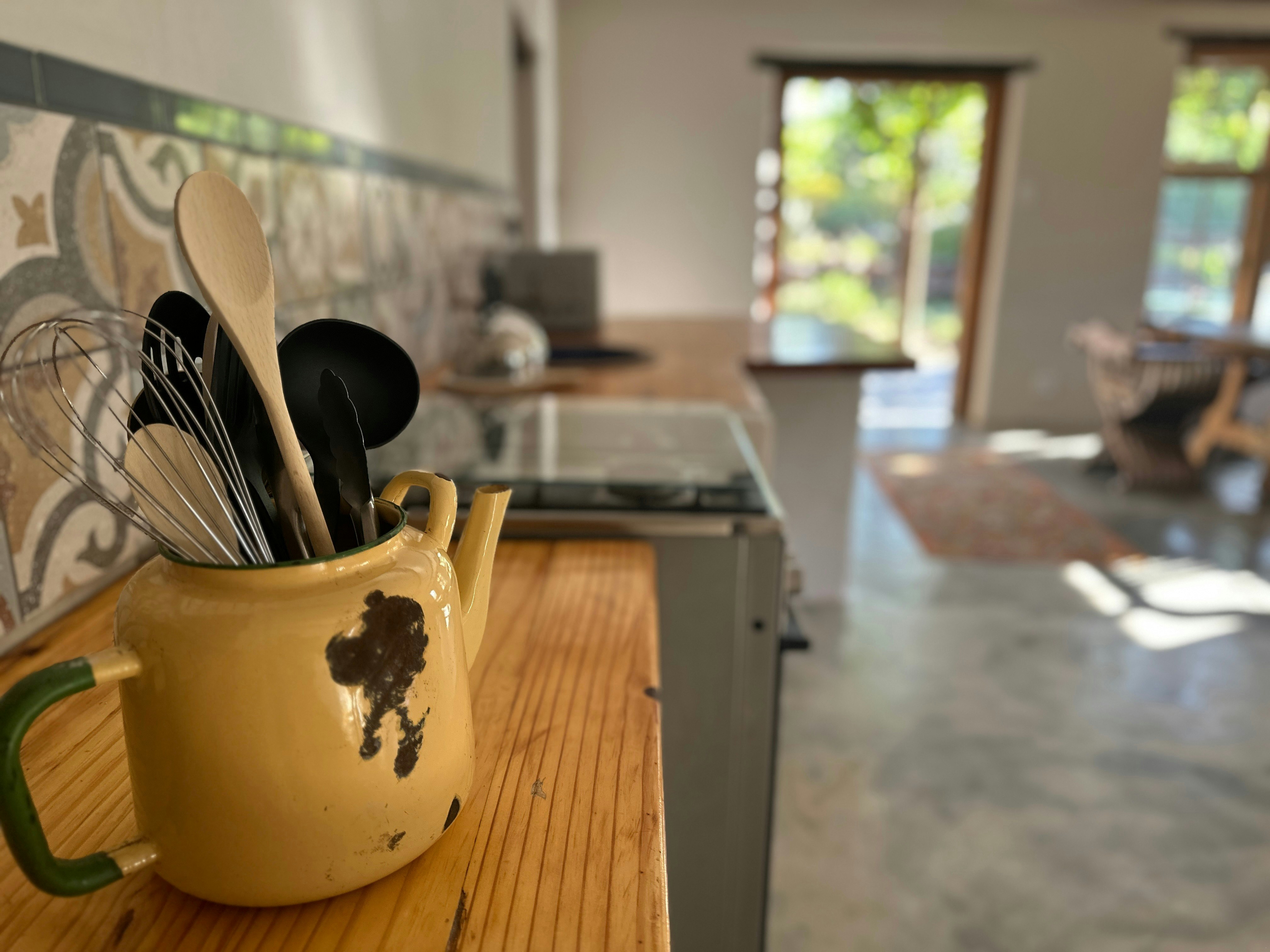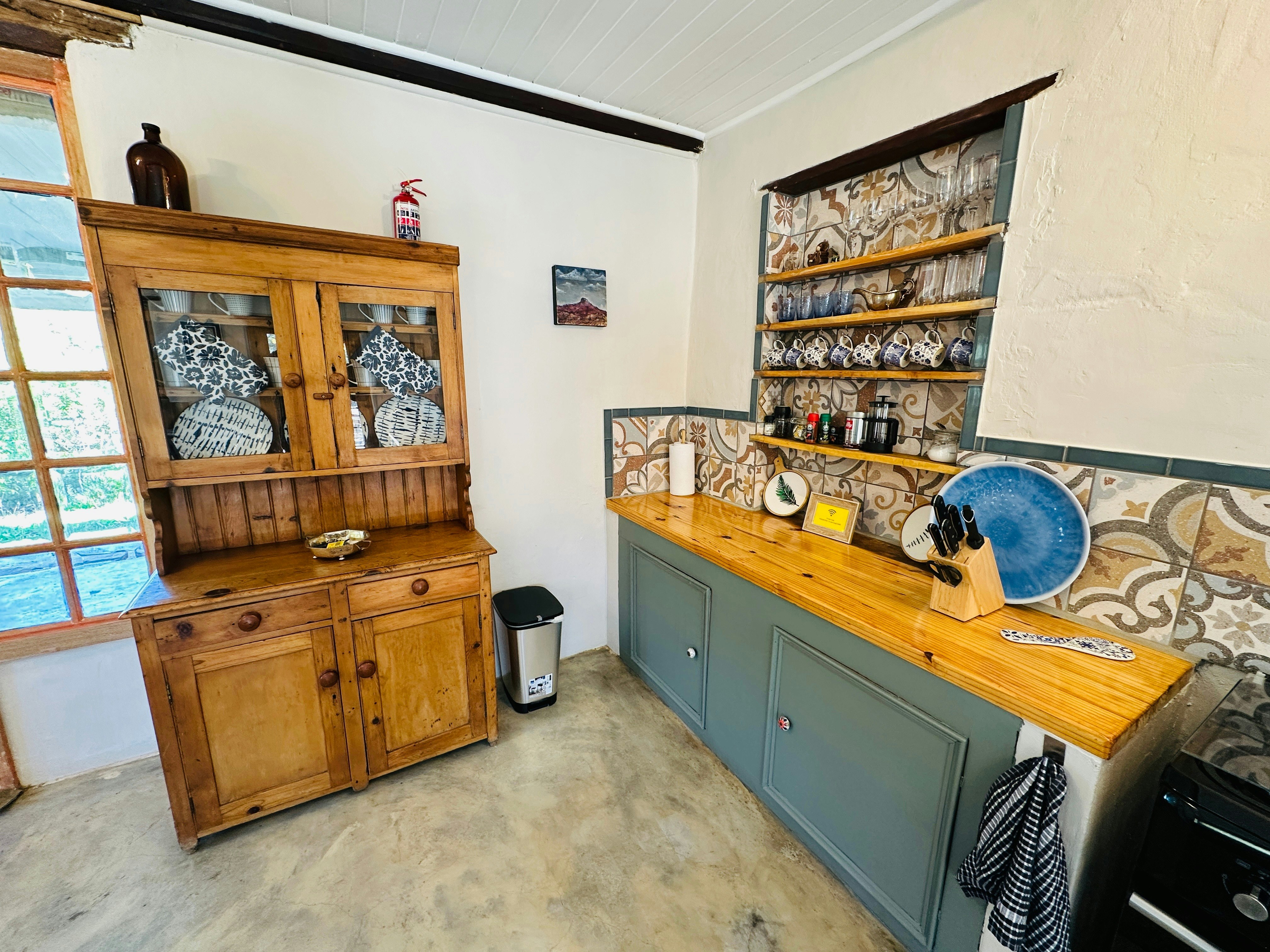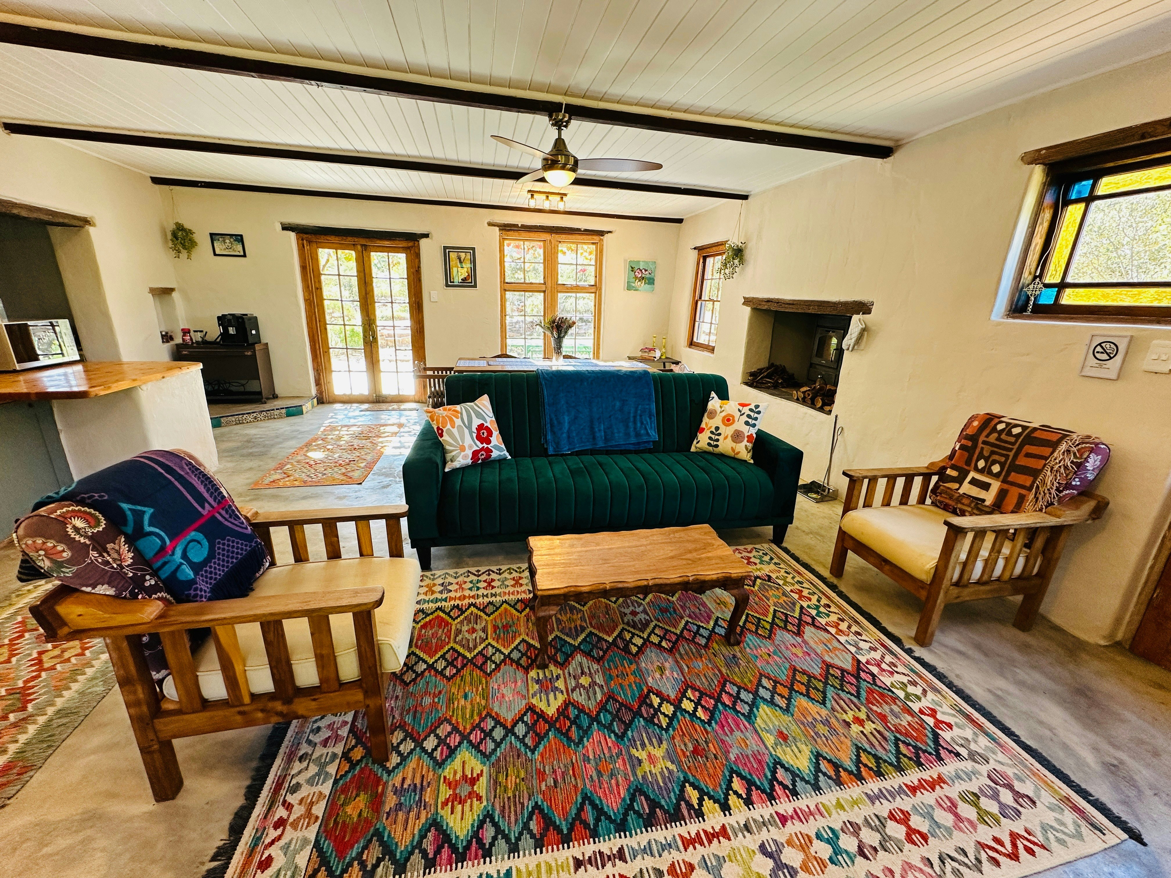 Die oopplan-leefarea beskik oor 'n volledig toegeruste kombuis met 'n stoof, oond, mikrogolfoond, yskas-vrieskas, eetgerei, breekware en 'n koffiemasjien. Vanuit die kombuis lei 'n eetkamertafel met 6 sitplekke en 'n sitarea met gemaklike rusbanke, 'n TV en 'n kaggel. Gratis onbeperkte WiFi is beskikbaar in ons afgesonderde wegbreekplek - let asseblief daarop dat die GEO-satellietinternetverskaffer in die omgewing stadig of onstabiel kan wees tydens swak weerstoestande.