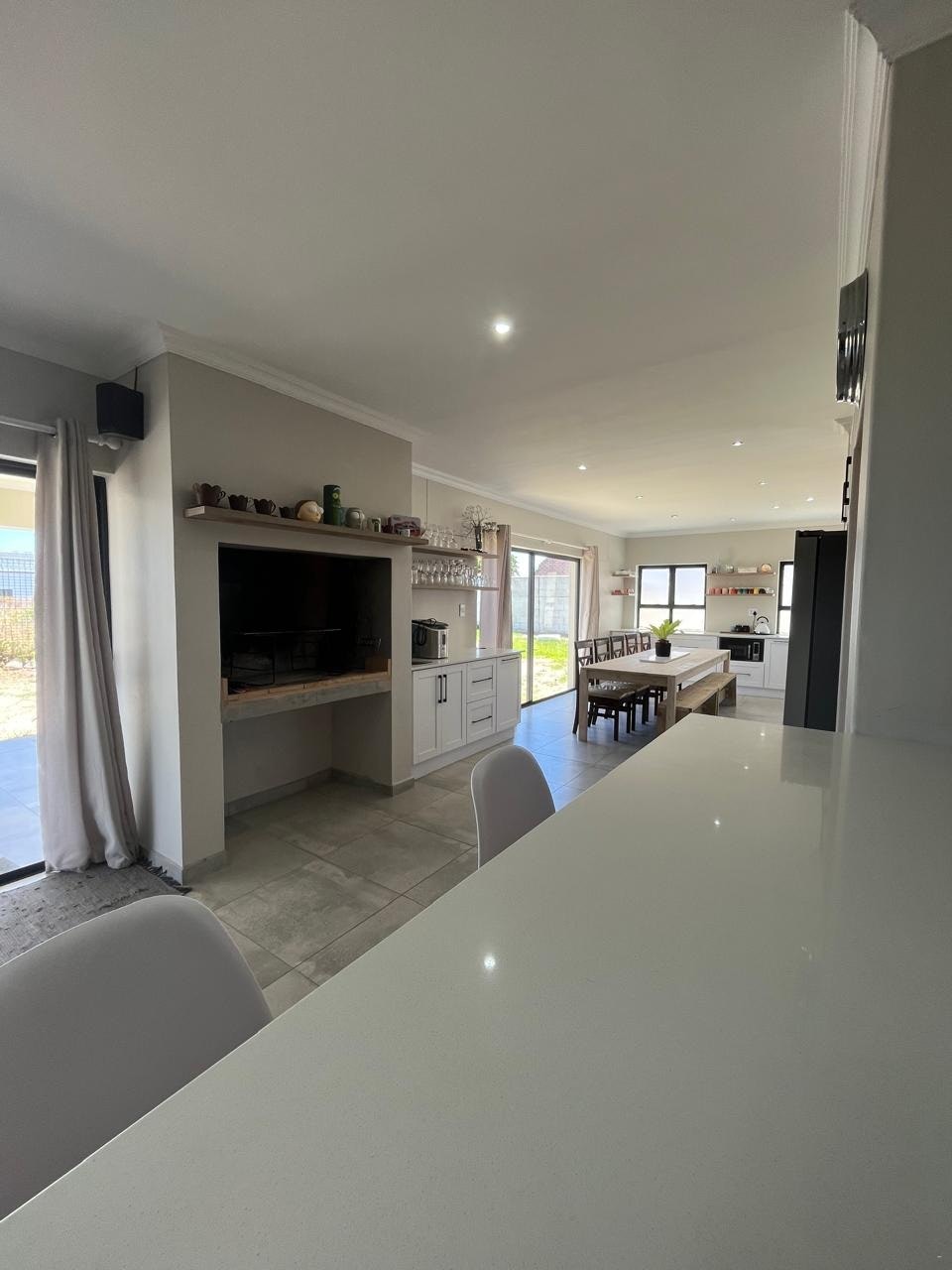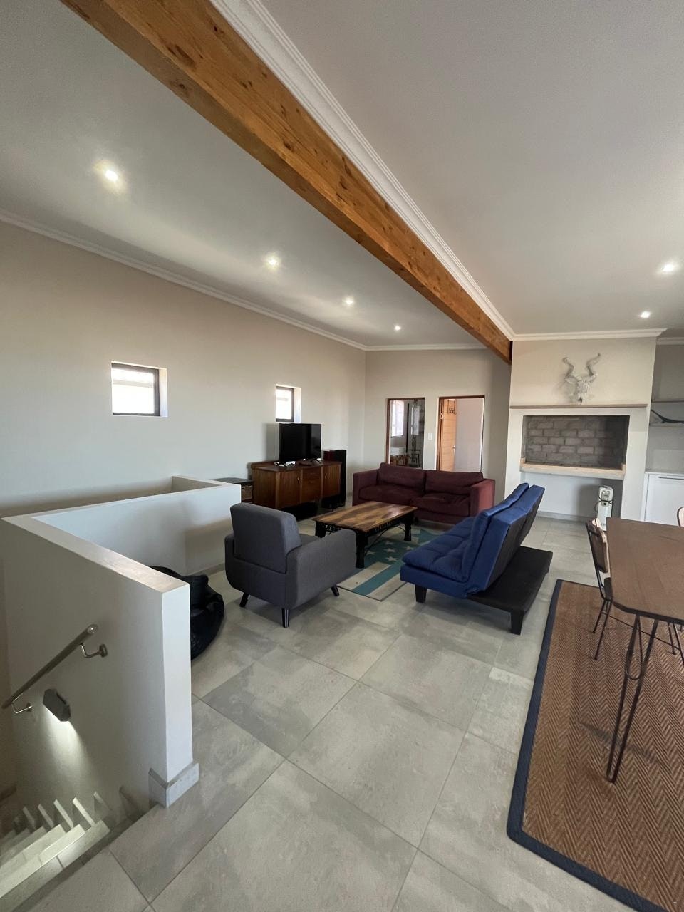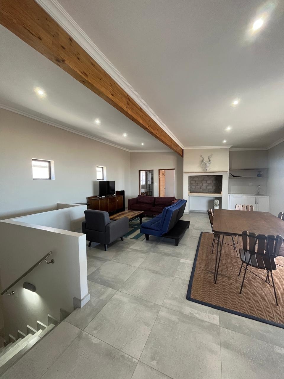 The house offers 2 fully equipped kitchens, each fitted with a gas stove, oven, fridge-freezer, microwave, kettle, toaster, and dishwasher. A scullery and a communal laundry room with a washing machine and tumble dryer are available. The dining area includes a large table with seating for 10 or more guests. There are 3 comfortable living areas, each furnished with couches and a Smart TV. Indoor entertainment spaces include 2 indoor braai areas, one of which features a bar. The home also offers a study, and free Wi-Fi is available.