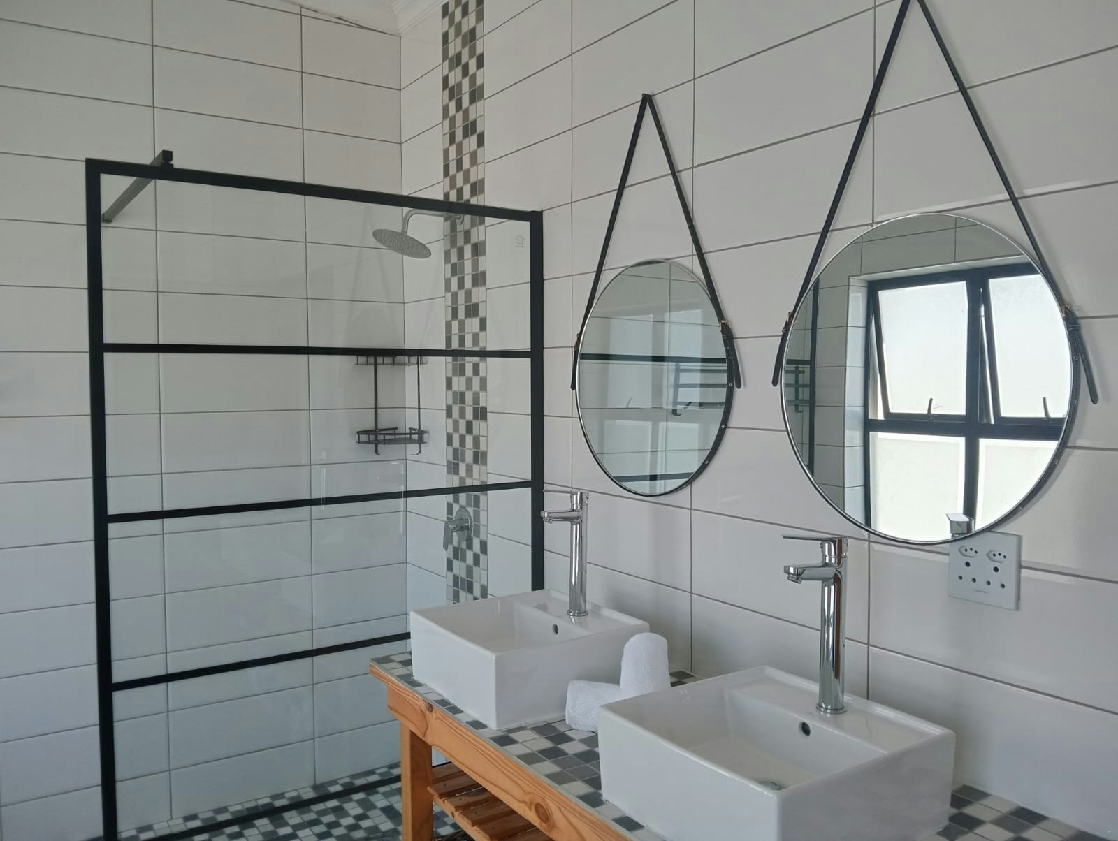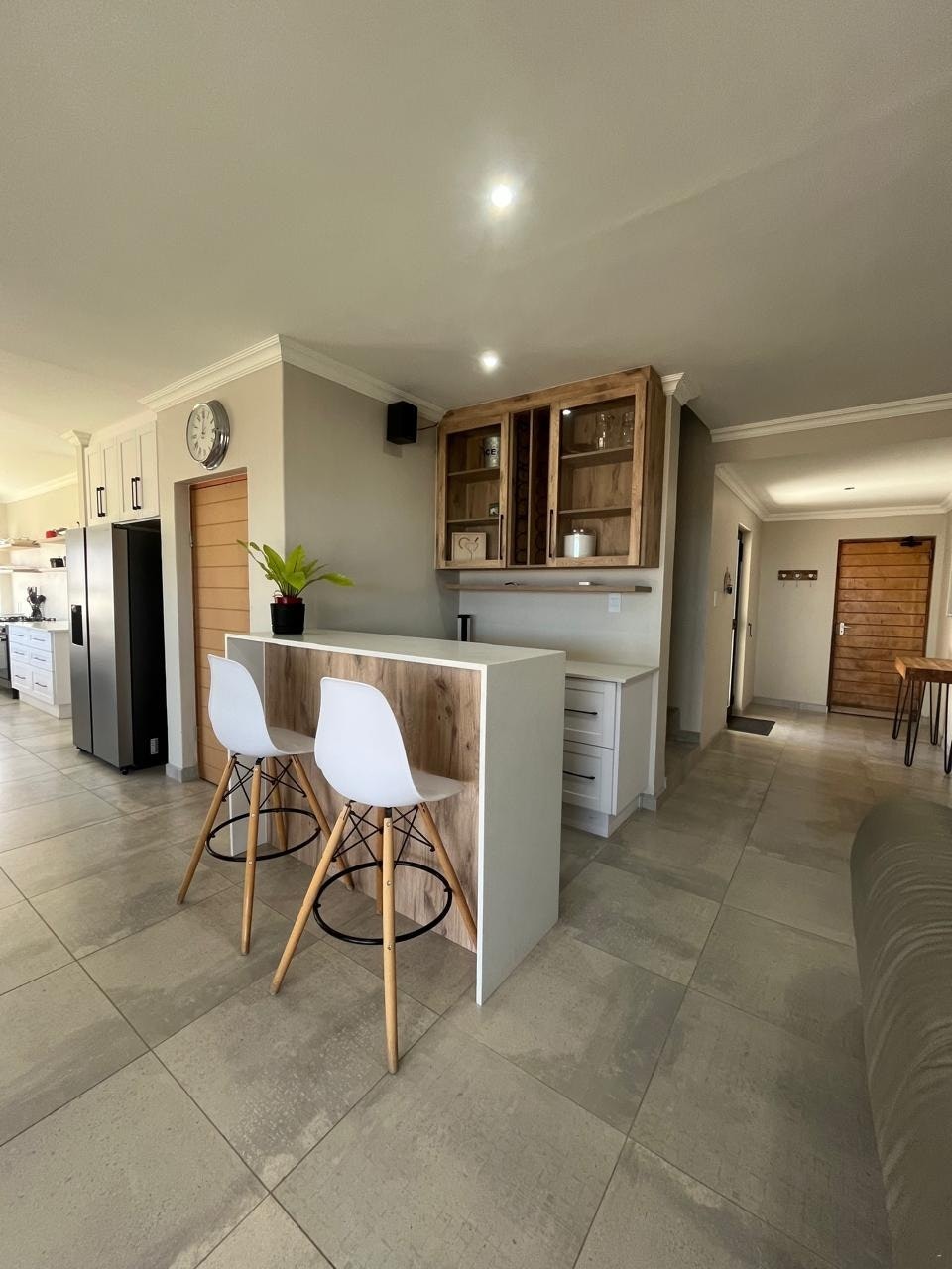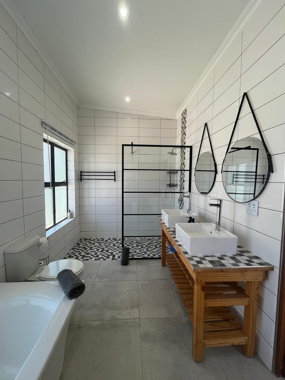 The house offers 2 fully equipped kitchens, each fitted with a gas stove, oven, fridge-freezer, microwave, kettle, toaster, and dishwasher. A scullery and a communal laundry room with a washing machine and tumble dryer are available. The dining area includes a large table with seating for 10 or more guests. There are 3 comfortable living areas, each furnished with couches and a Smart TV. Indoor entertainment spaces include 2 indoor braai areas, one of which features a bar. The home also offers a study, and free Wi-Fi is available.