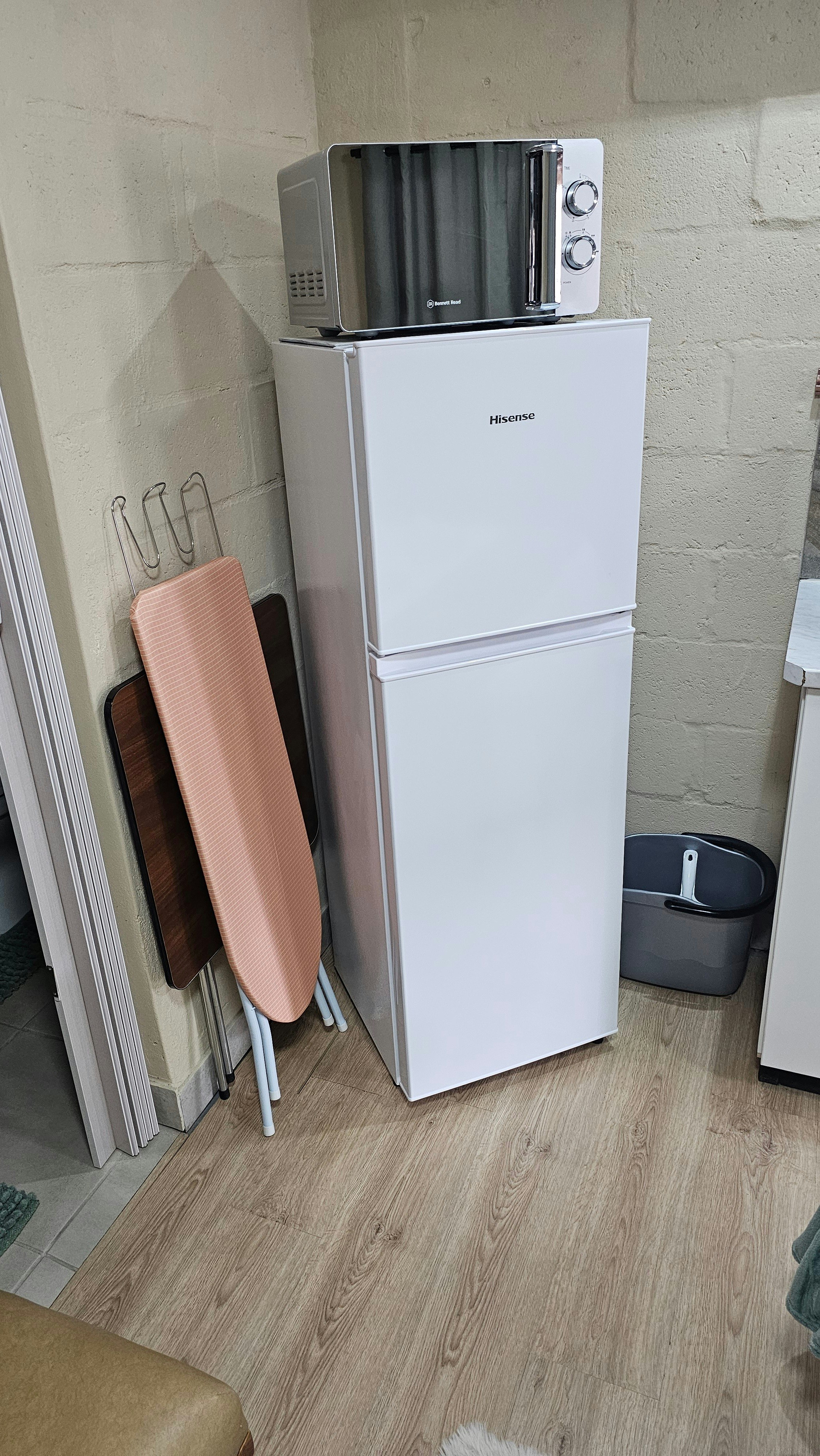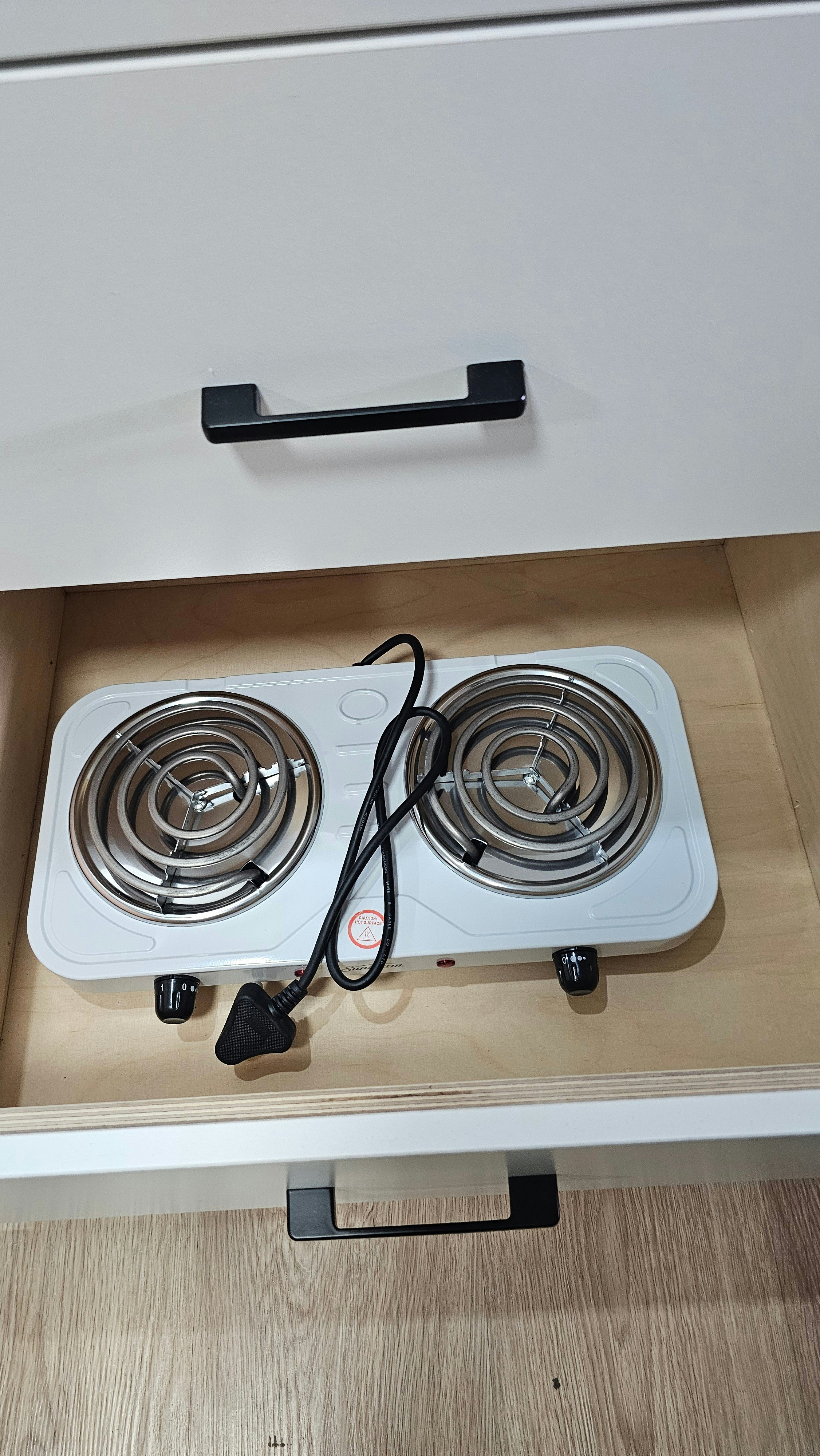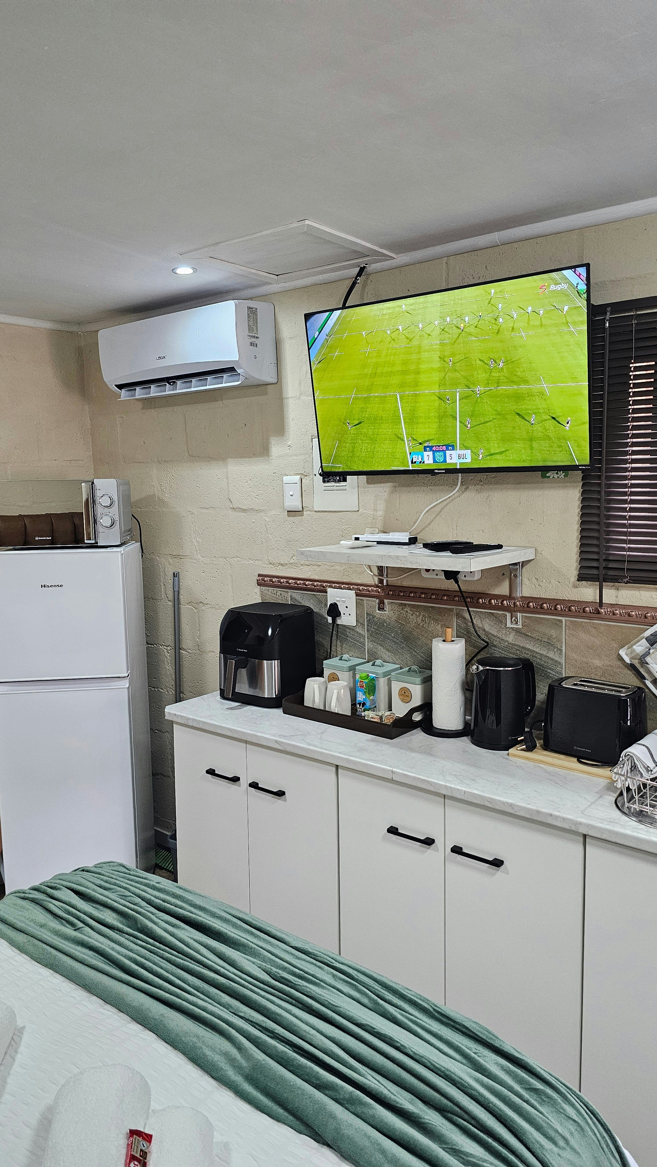 The unit has a well-equipped kitchen with a 2-plate stove and oven, air fryer, microwave, kettle, and fridge-freezer. Additional facilities include a dining table with seating for 2, a TV with selected DStv channels, and free Wi-Fi.