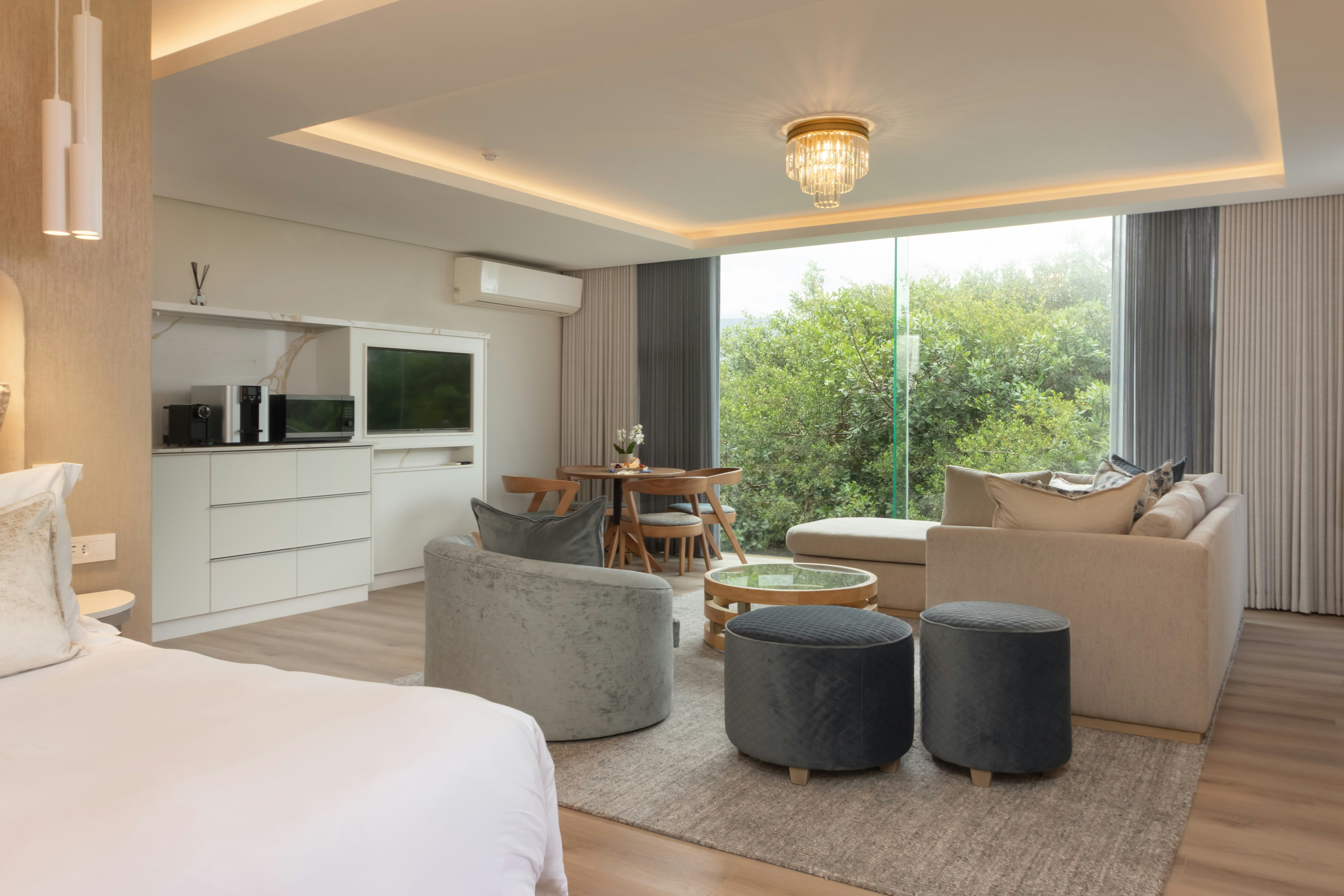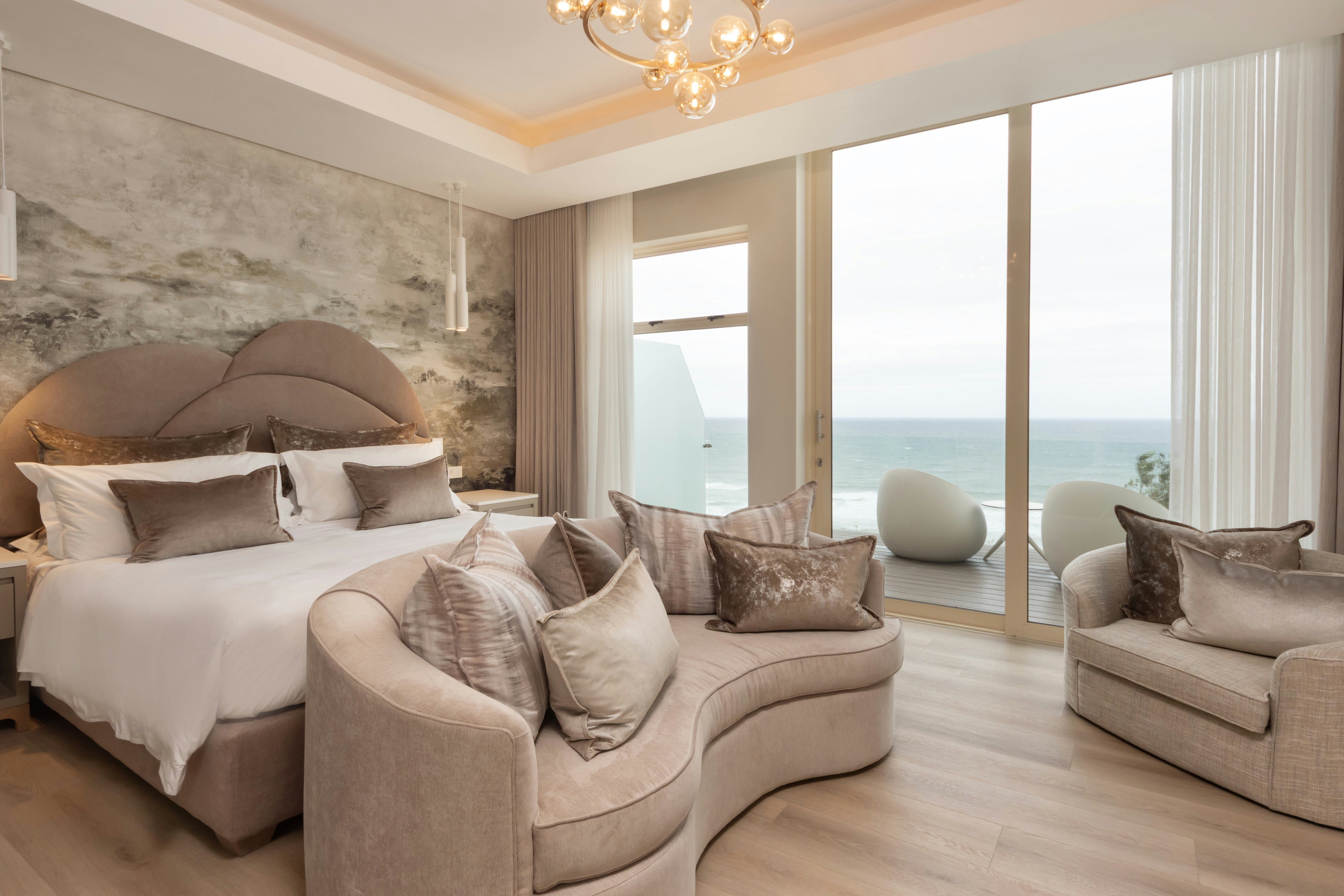 Accommodation is offered in 26 rooms and suites, each with a private bathroom and furnished with king-size or twin beds. Rooms offer sea-facing, partial sea or neighbourhood views. The property also includes a private villa with 5 en-suite bedrooms, 2 fully equipped kitchens, a lounge and dining area, and an outdoor entertainment space with a pizza oven, braai and heated spa pool.